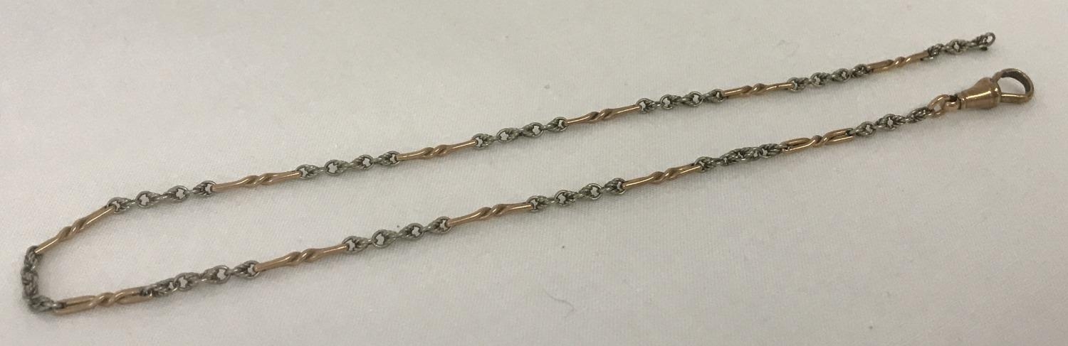 A Decorative rose and white gold watch chain with lobster clasp. Ring fixing missing from end. Tests as 9ct. Total weight aaprx. 6.6g.
