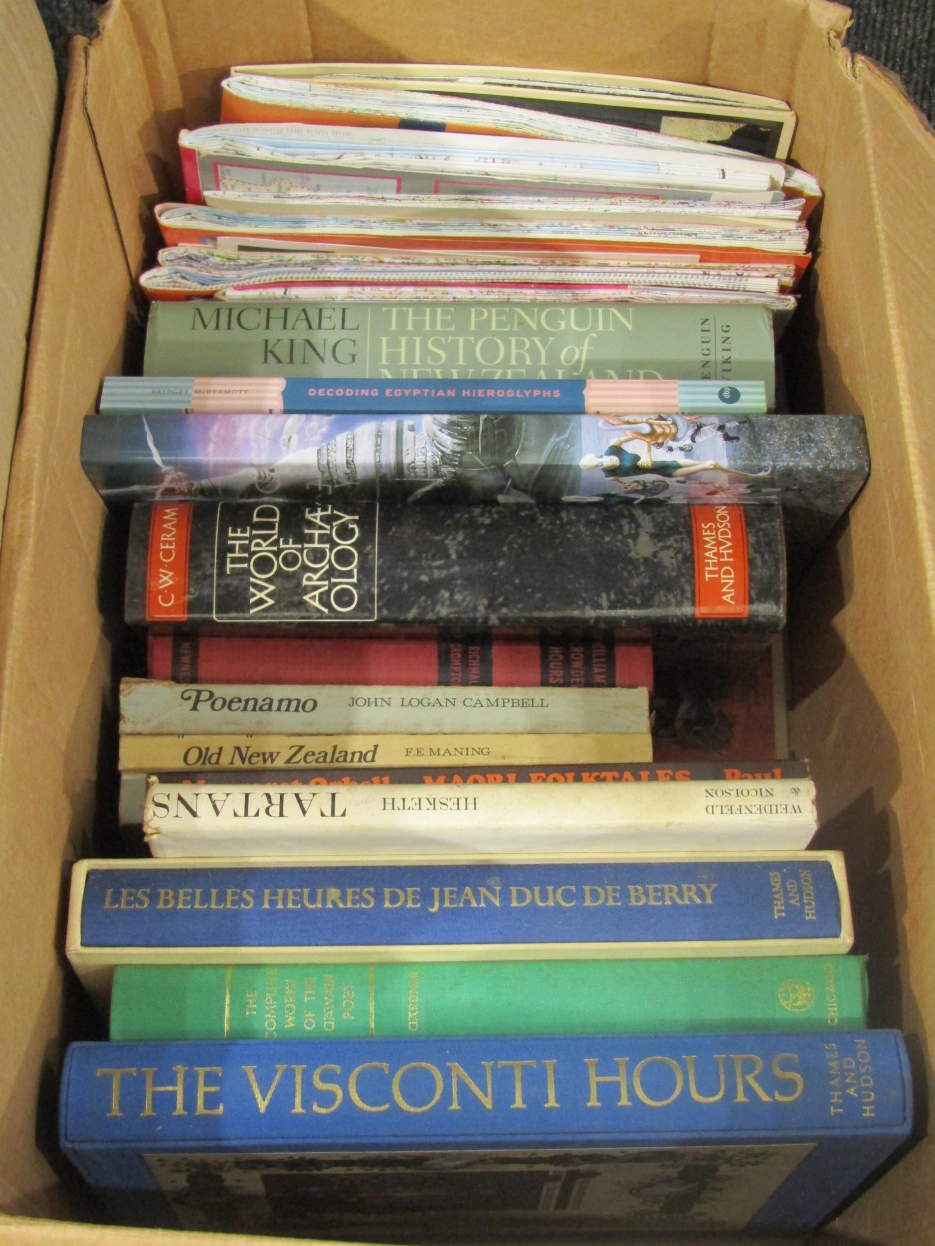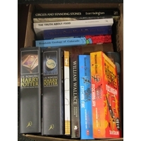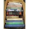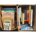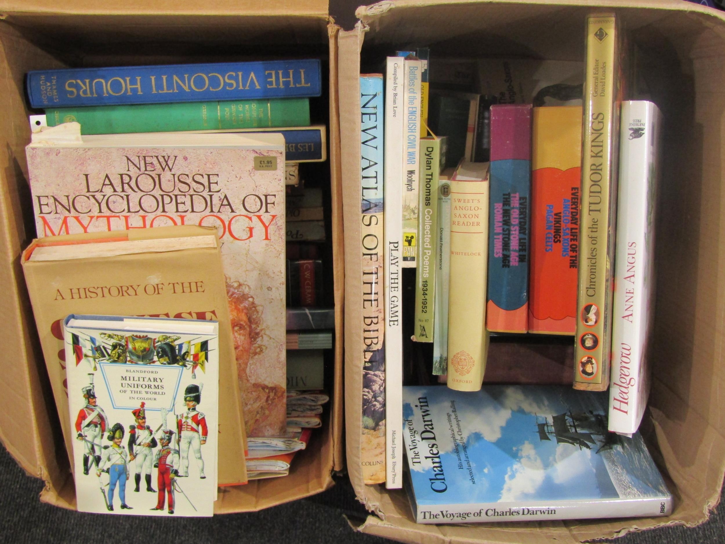 Two boxes of books including "New Larousse Encyclopedia of Mythology", "A History of the Chinese Secret Service", "Military Uniforms of the World" and "The Voyage of Charles Darwin" (2)