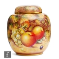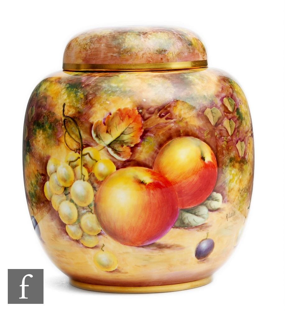 A Royal Worcester Fallen Fruits shape 2826 vase and cover decorated in the round by R. Lewis with pears and red grapes, cherries and peaches and apples and white grapes, signed, black printed mark, height 17.5cm.