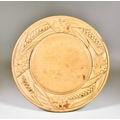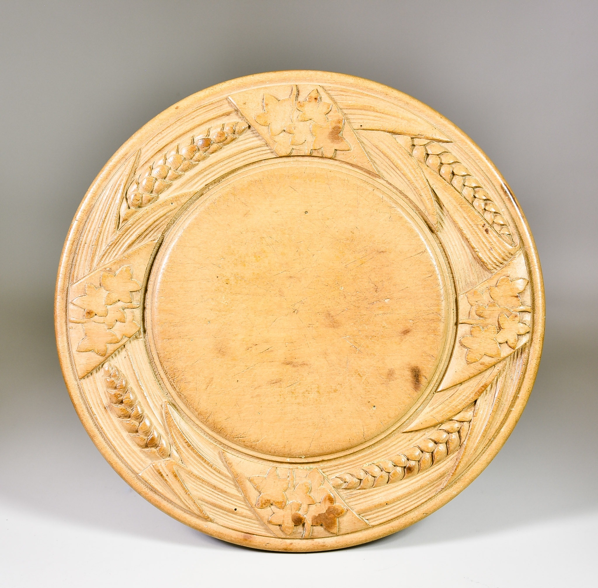 A 19th Century North American or Canadian Maplewood Breadboard, of circular form, the moulded border carved with maple leaves interspersed by wheat, 13ins diameter