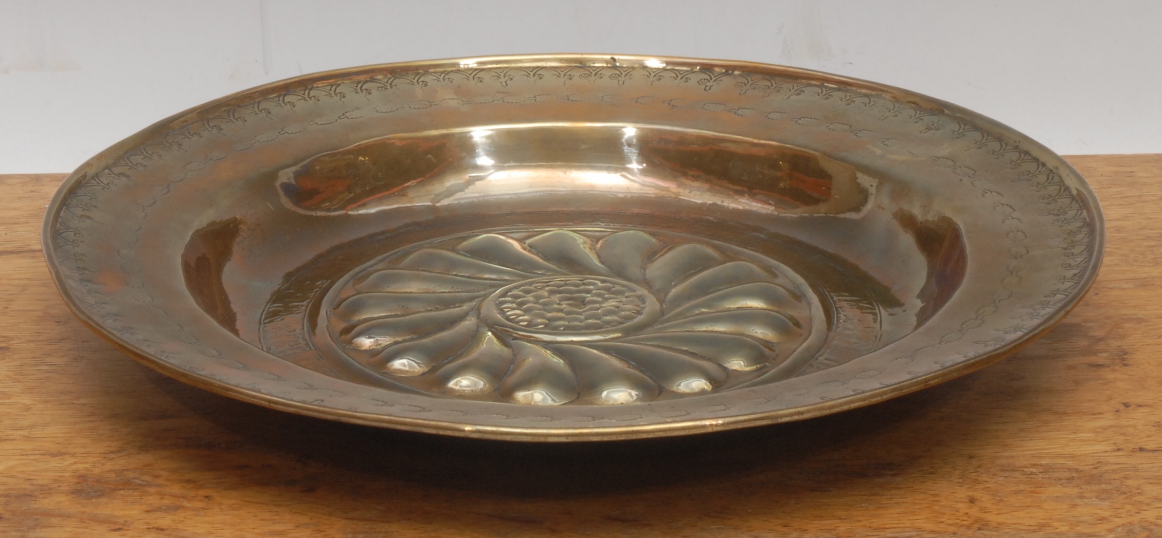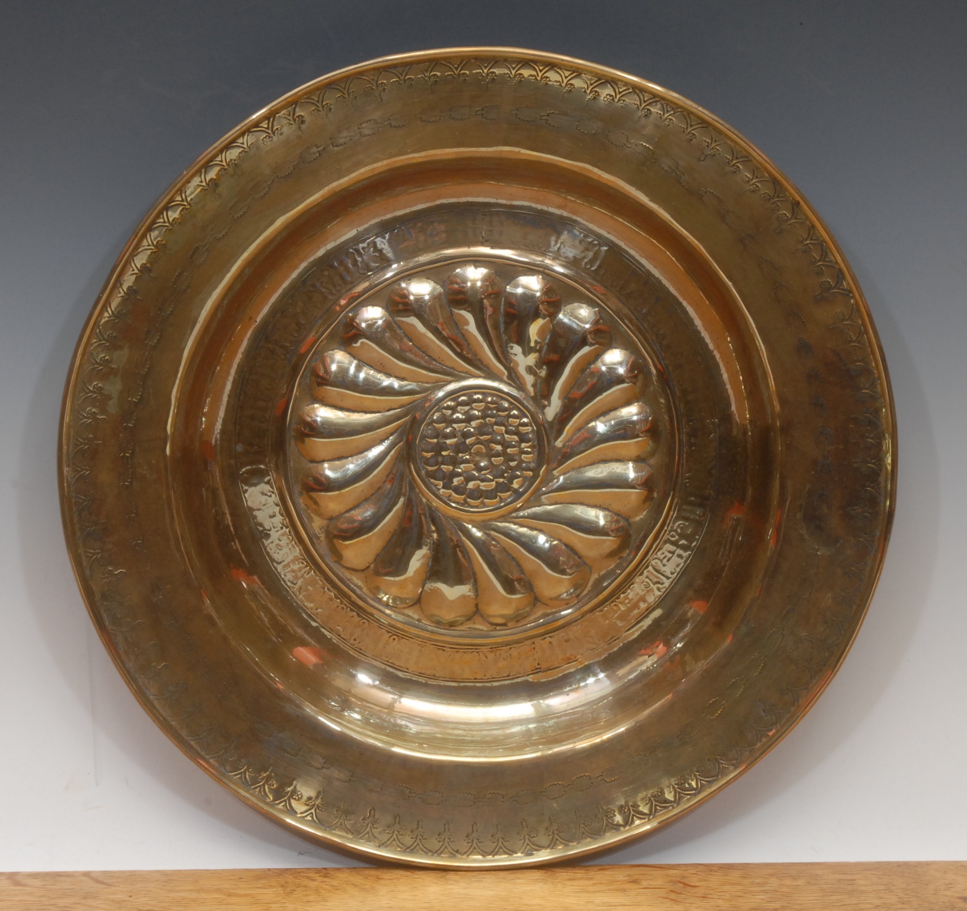 A circular brass alms dish, embossed with central roundel, the border chased and engraved, 36.5cm diameter, 19th century