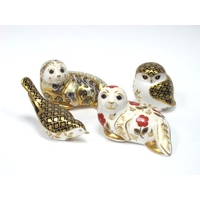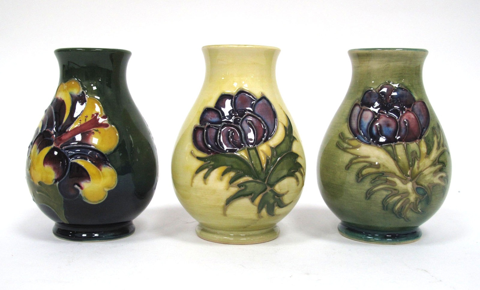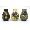 Three Moorcroft Pottery Vases, each of ovoid form and painted in the 'Anemone' and 'Hibiscus' patterns against yellow and green grounds, impressed marks, 9.5cm high. (3)