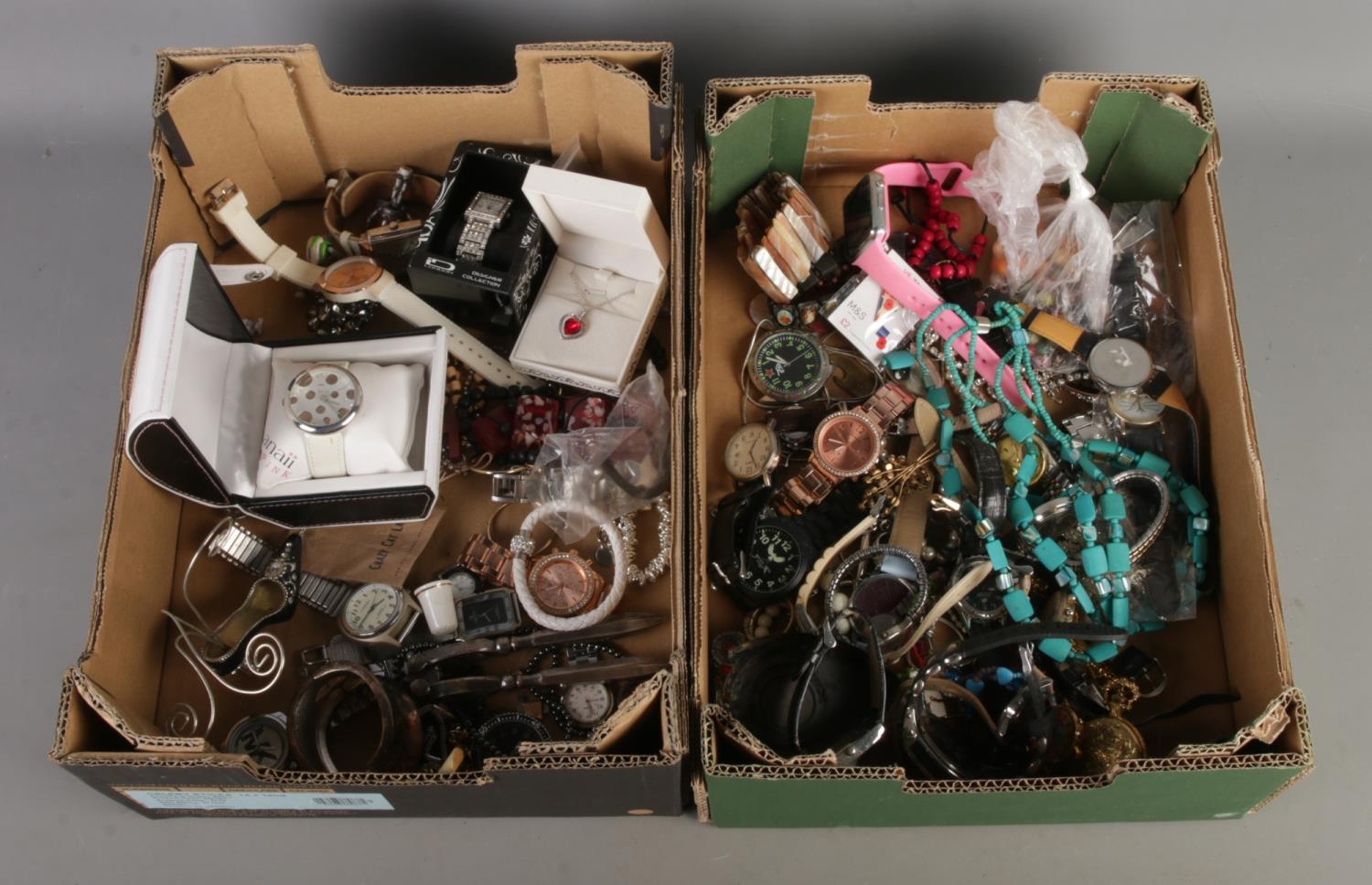 Two boxes of collectables consisting mainly of costume jewellery and watches; Including Lorus, Softech watches examples, bracelets, earrings, necklaces, bangles etc.