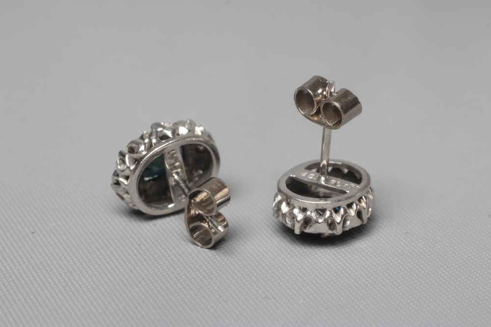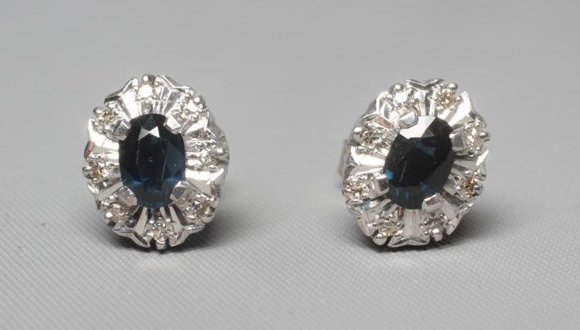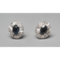 A PAIR OF SAPPHIRE AND DIAMOND OVAL CLUSTER EAR STUDS, the facet cut sapphires claw set to a border of eight illusion set small diamonds, to white posts and butterflies, stamped 18CT PLAT (Est. plus 24% premium inc. VAT)