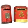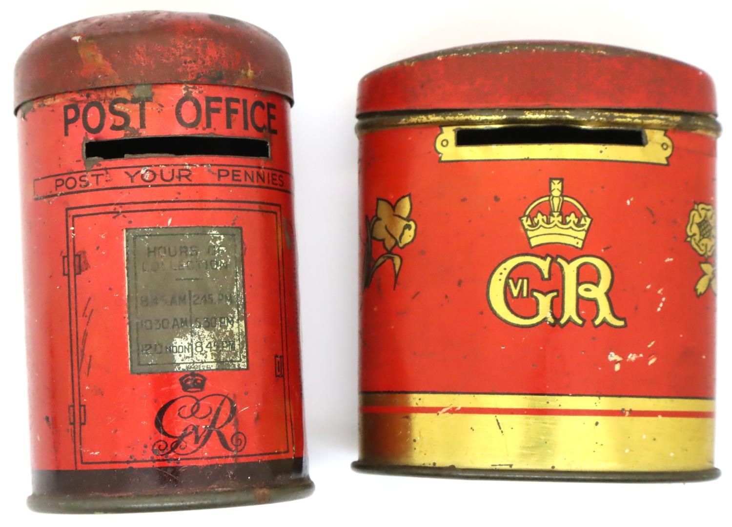 Two George V tin money boxes. P&P Group 1 (£14+VAT for the first lot and £1+VAT for subsequent lots)