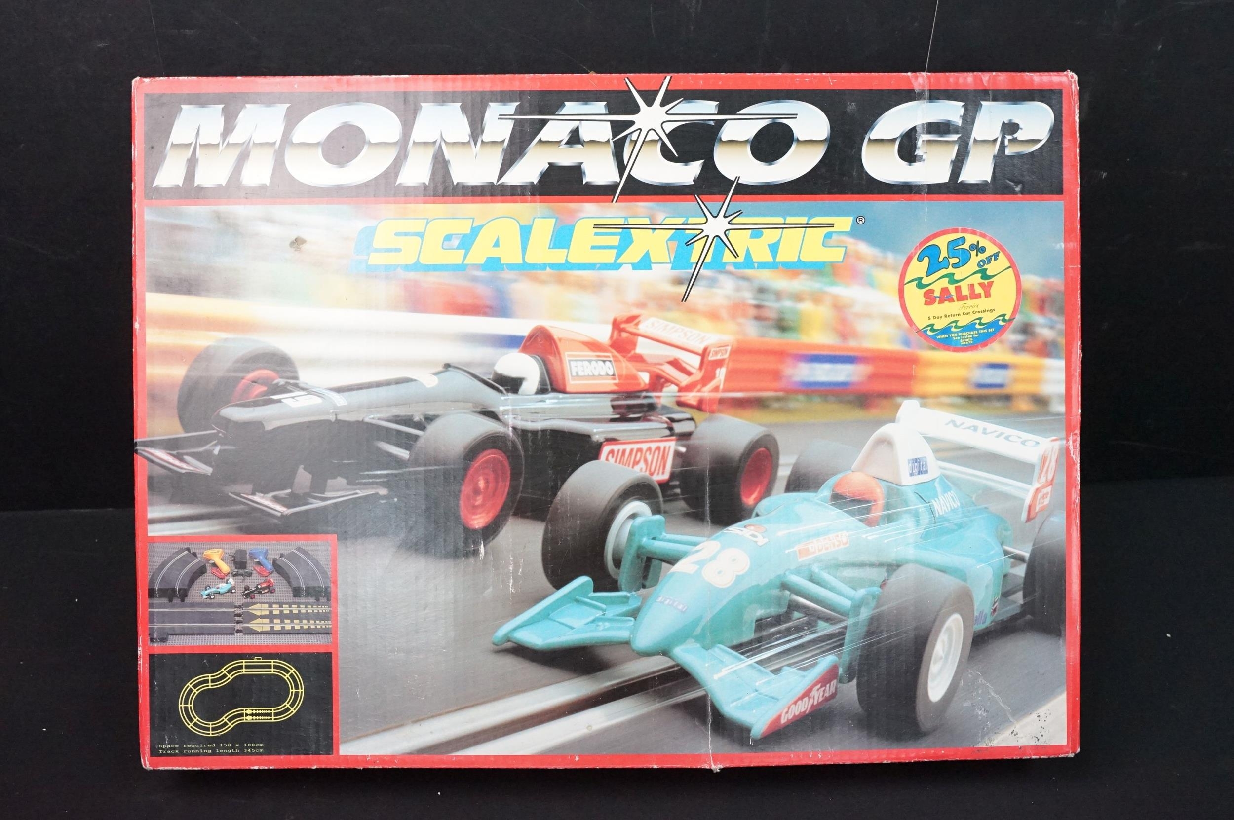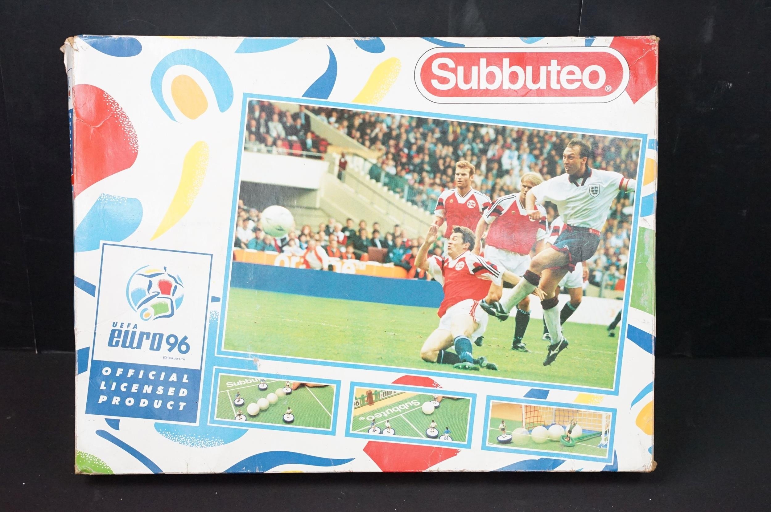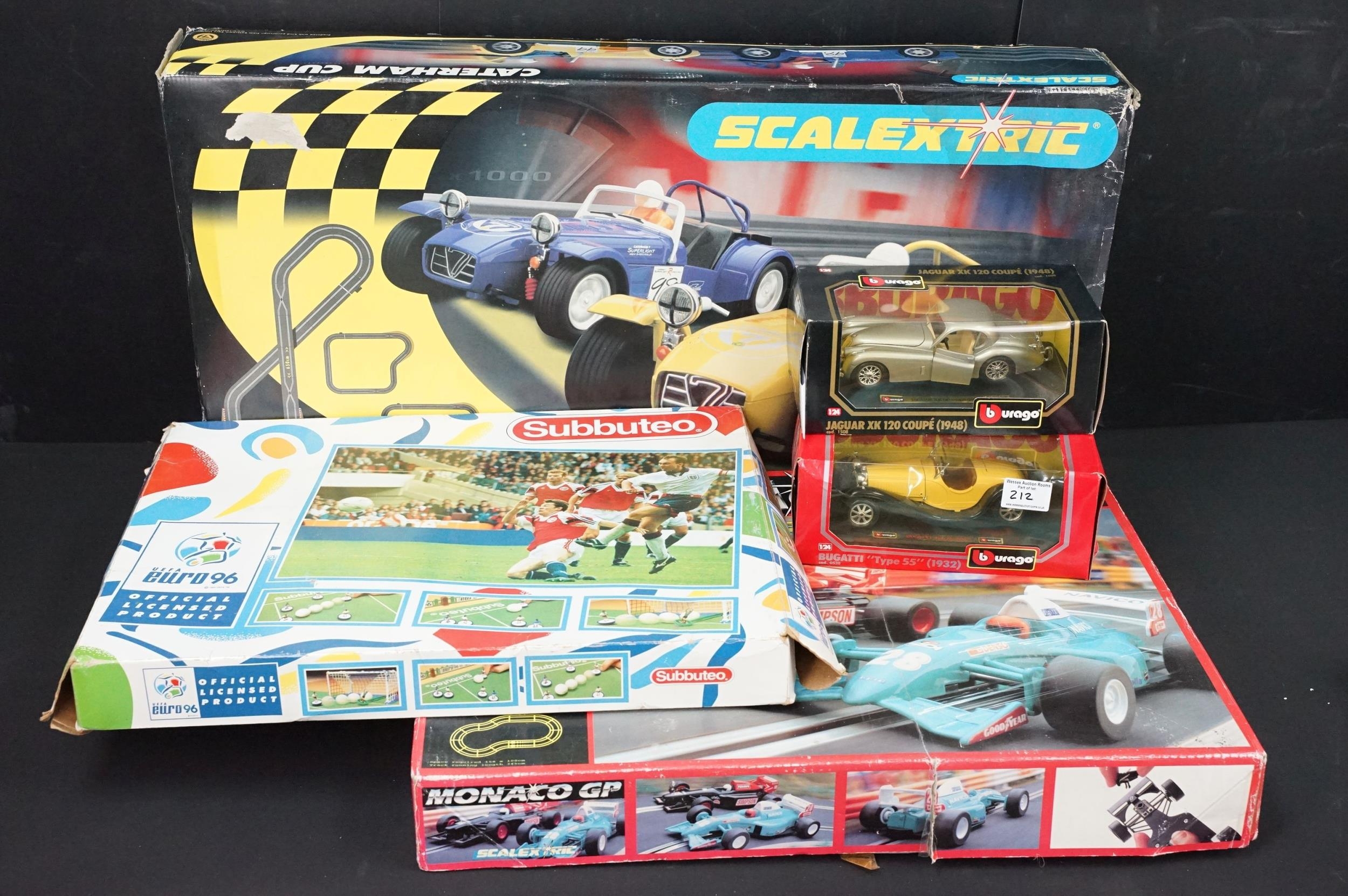 Two boxed Scalextric sets including Monaco GP and Caterham Cup, boxed Subbuteo 60260 UEFA Euro 96 set and 2 x Burago 1/24 diecast models featuring Jaguar XK120 coupe and Bugatti Type 55, etc