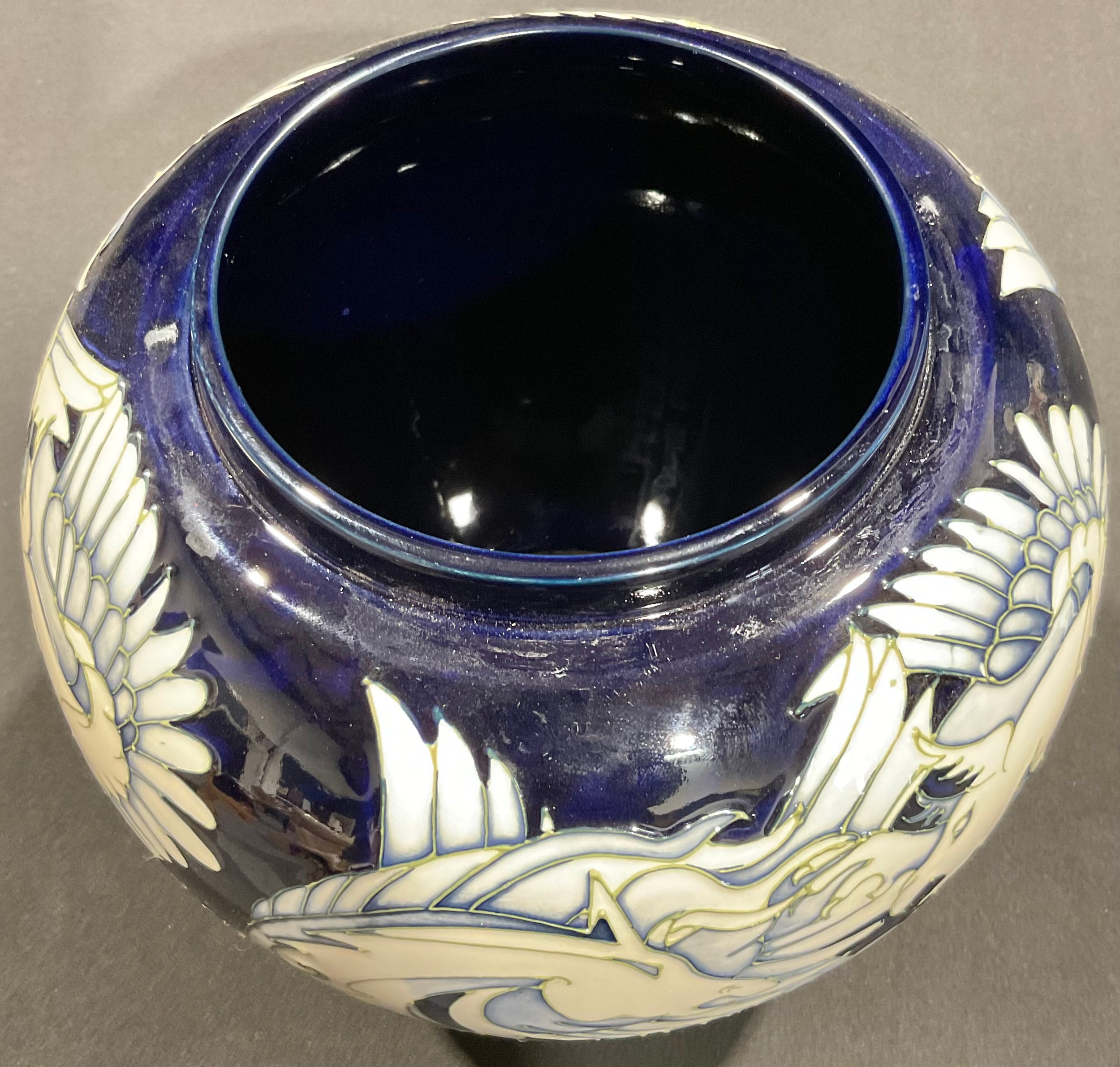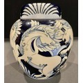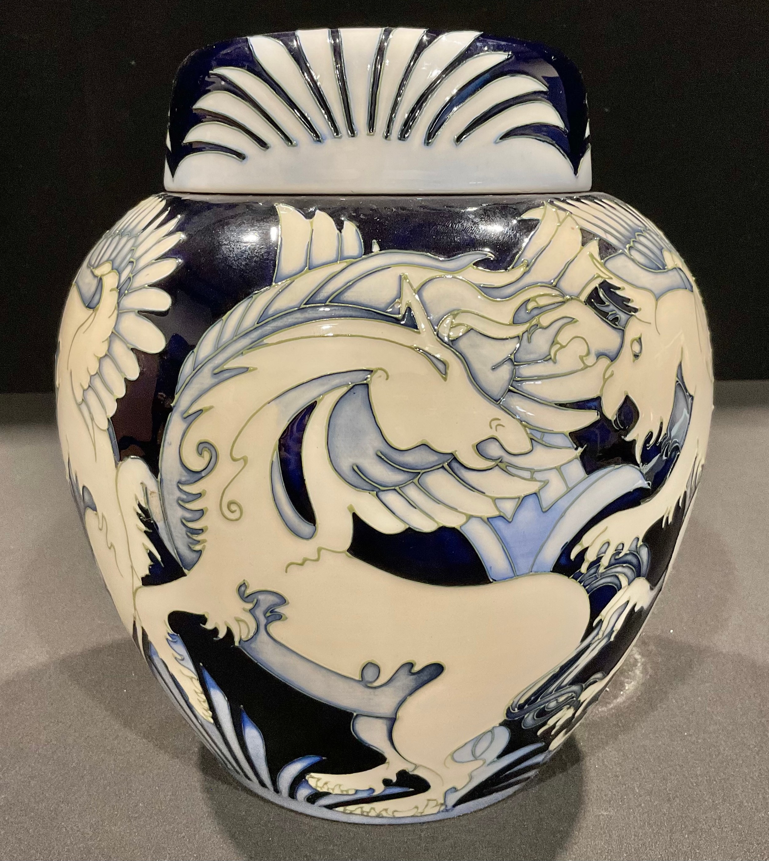 A large Moorcroft ovoid ginger jar and cover, Dance of the Griffins pattern, by Vicky Lovatt, tube lined with mythical beasts in animated poses, in tones of blue and white, 24cm high, limited edition 19/100, impressed and painted marks, signed, c.2011