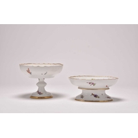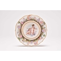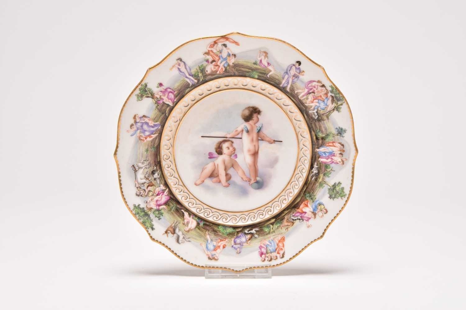 A Naples Capodimonte dessert plate, 19th century, painted to the centre with two putti, the rim moulded with Classical-style figures and gilt dentils, underglaze blue crown over N mark to the reverse, 21.5cm diameter. Sold with a small plate stand. Condition:Good condition with no damages or repairs. Some minor wear to the gilt dentil rim.
