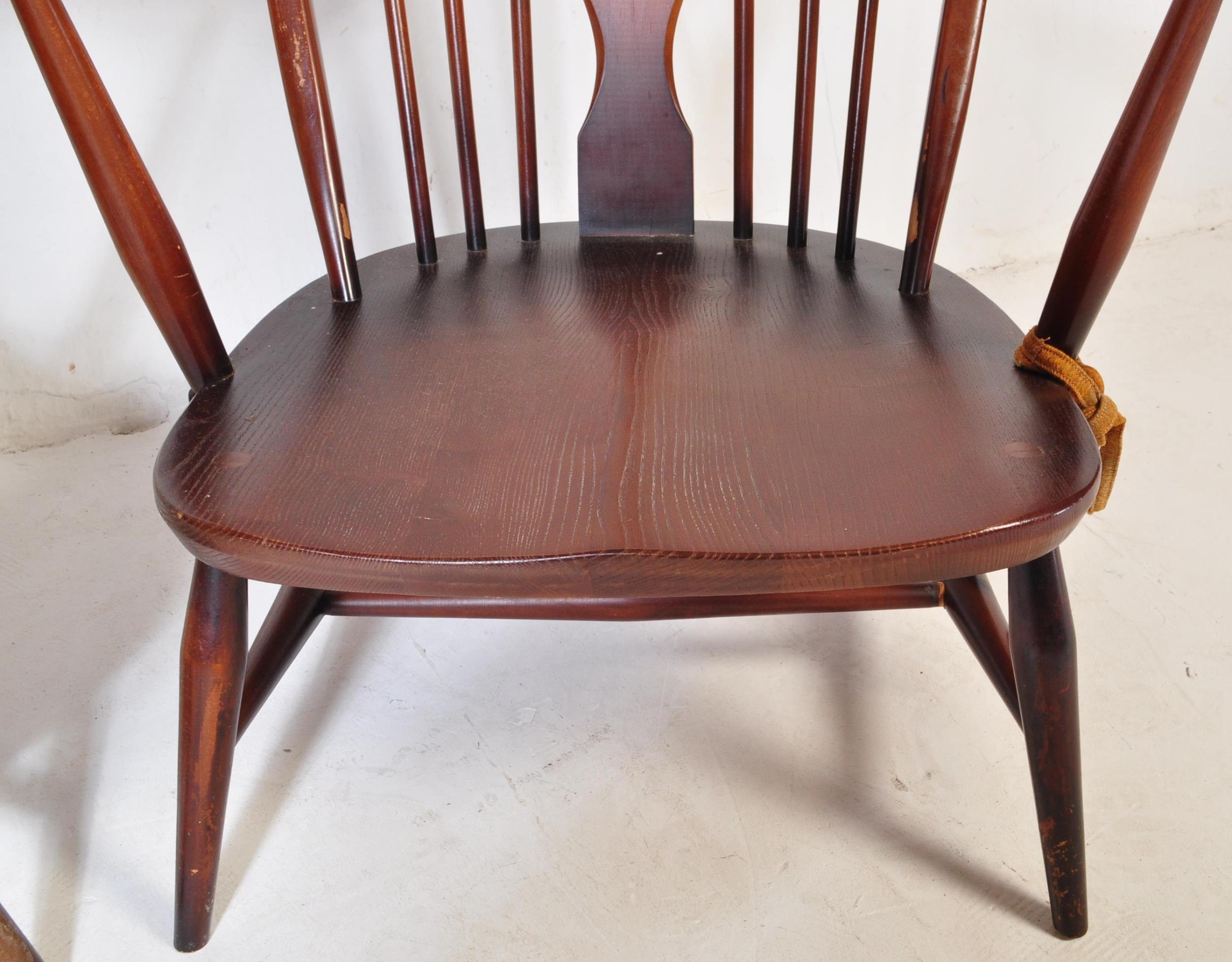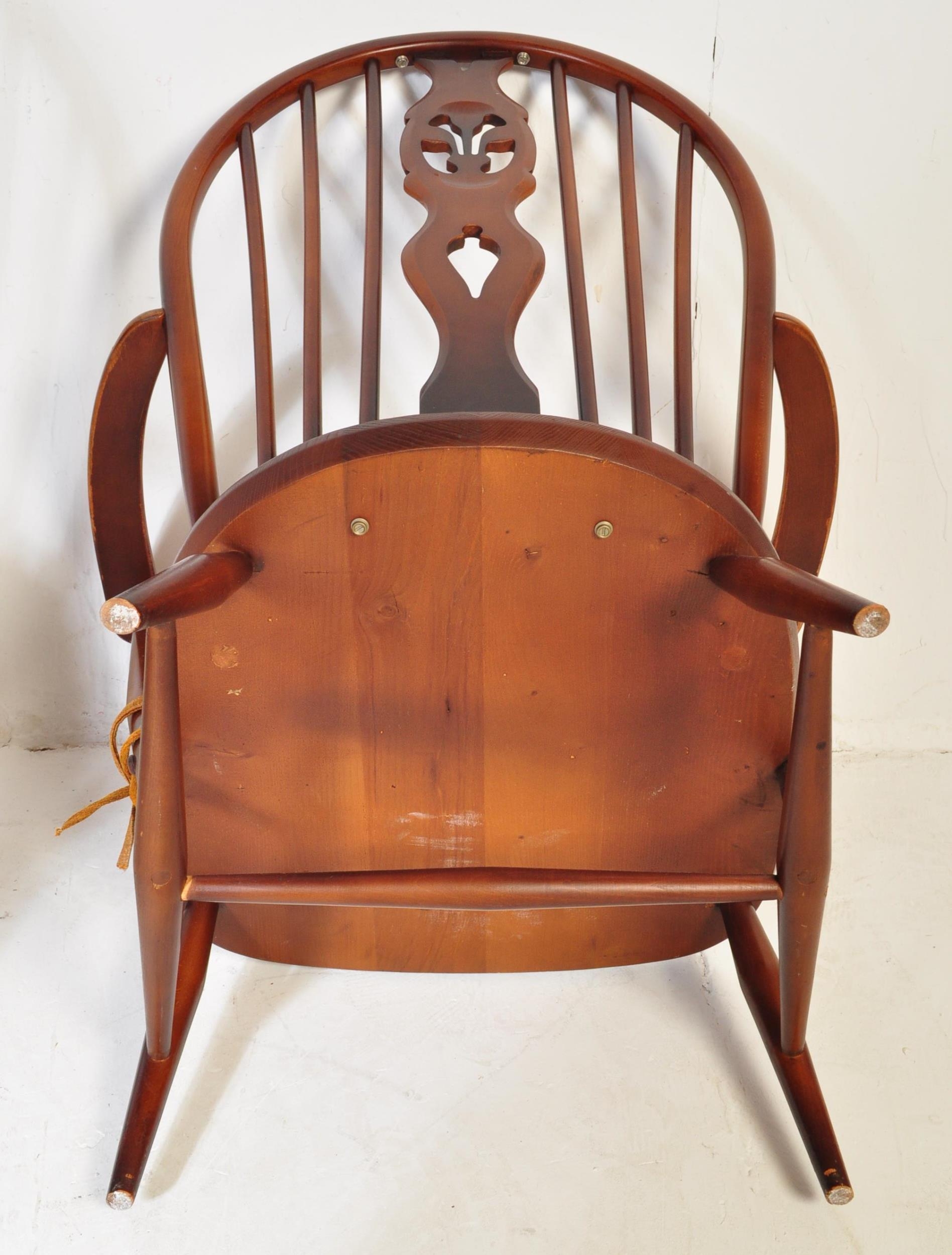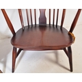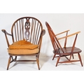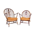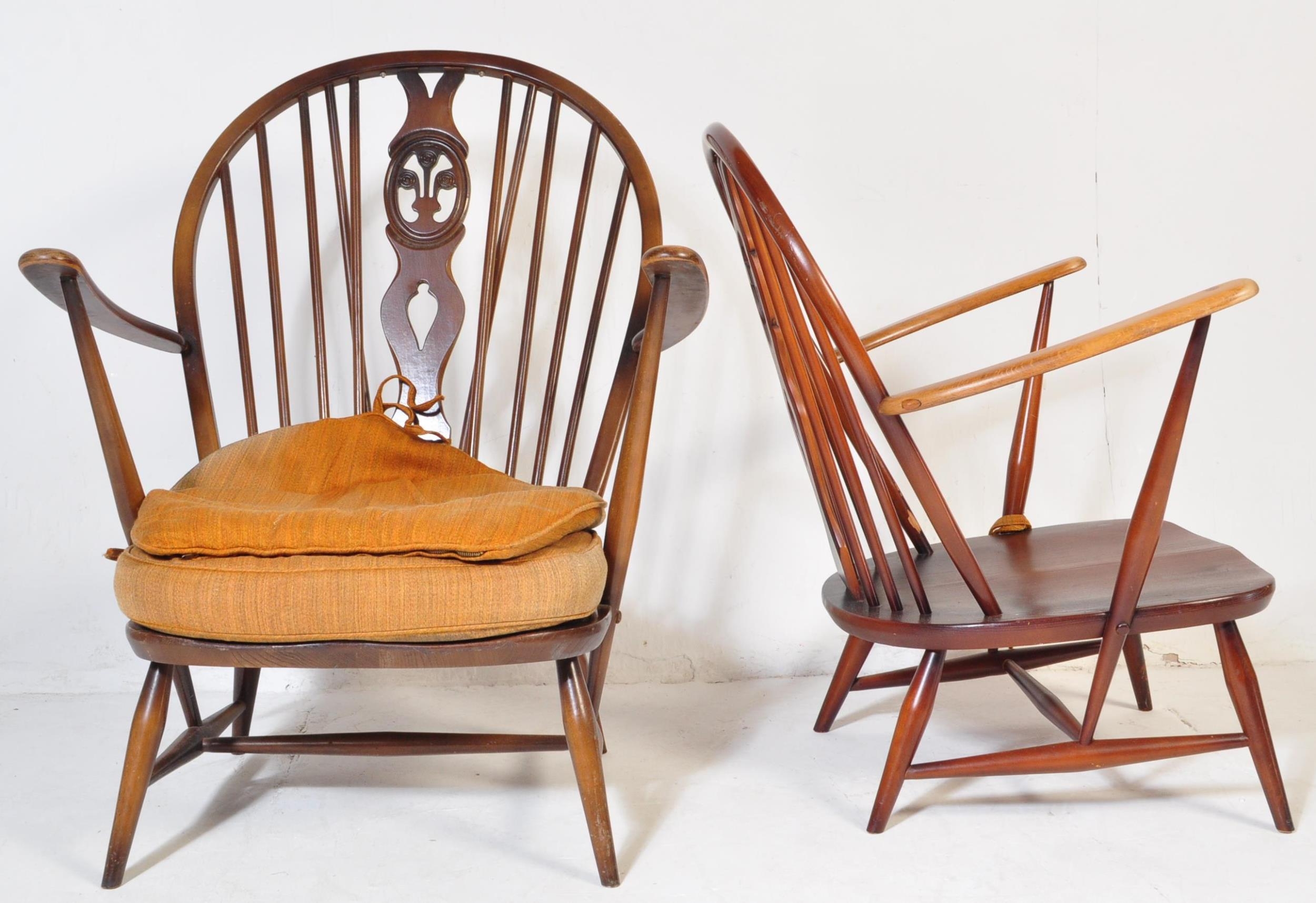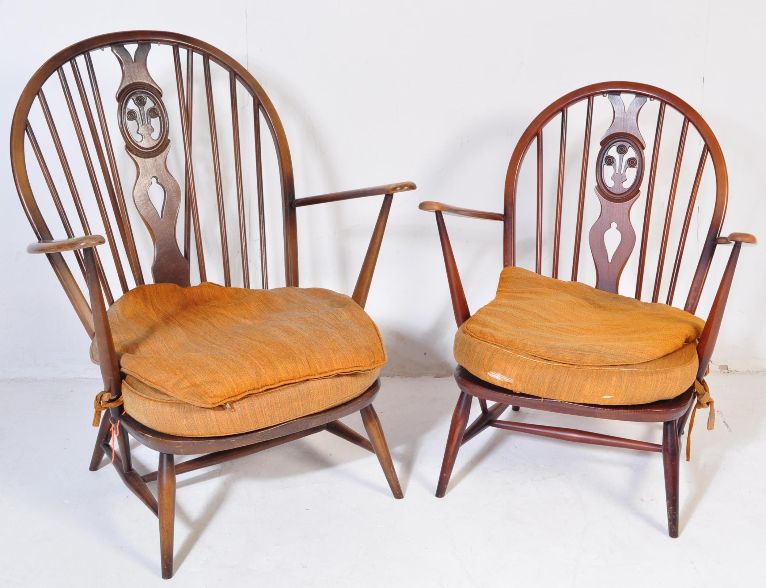 A pair of retro vintage mid 20th Century beech & elm fleur de lis low arm chairs. Both having round spindle backs with straight arms with supporting stretcher all raised on angular tapering circular supports united by H stretcher. Measures approx. 93cm x 76cm x 68cm.
