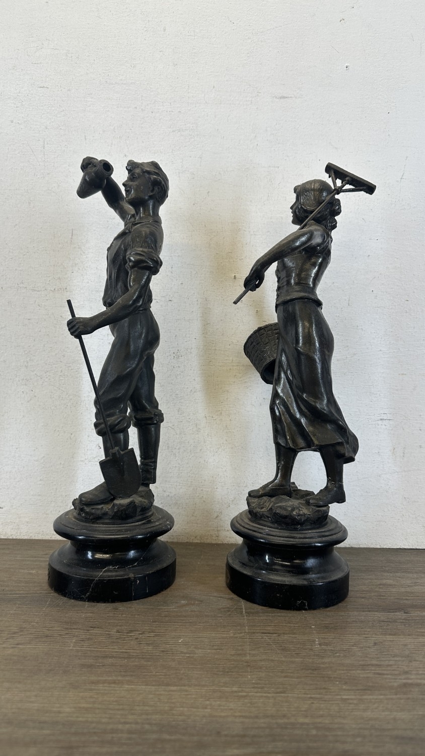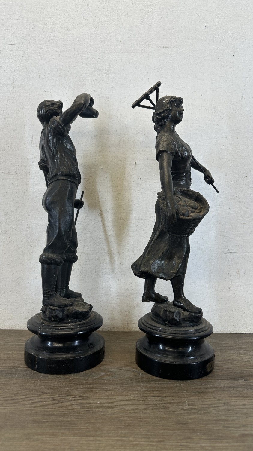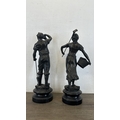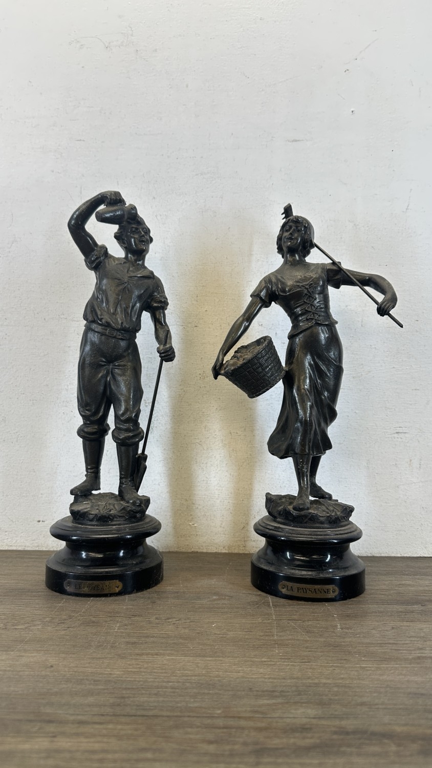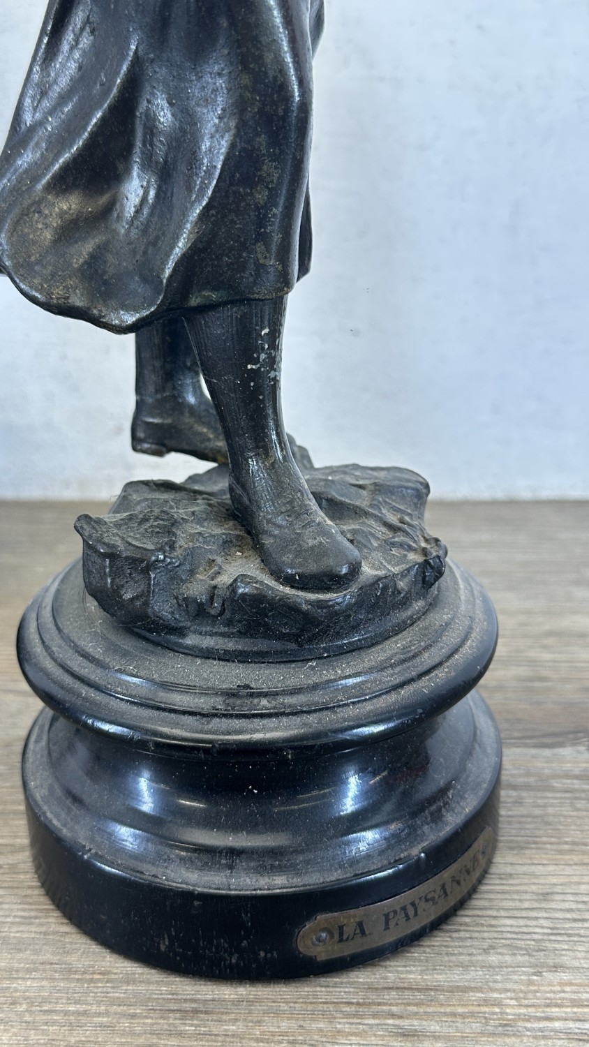 Two French bronzed spelter figurines on ebonised plinths, one titled 'La Paysanne' and one titled 'La Paysan' - approx. 39cm high