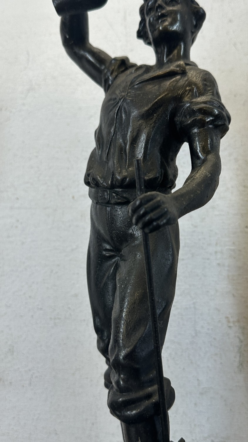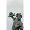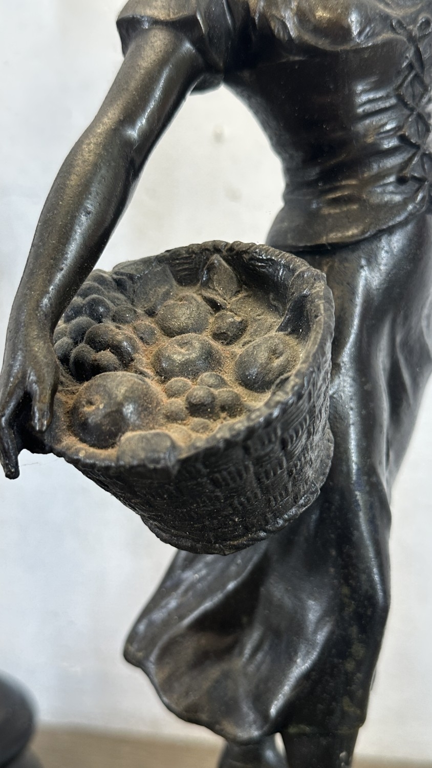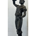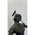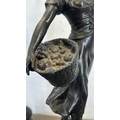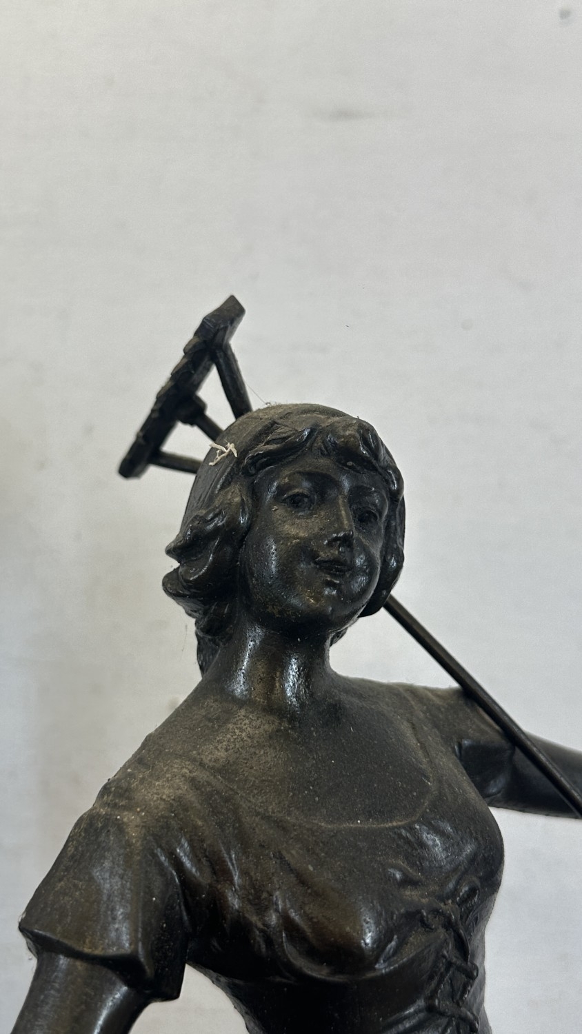 Two French bronzed spelter figurines on ebonised plinths, one titled 'La Paysanne' and one titled 'La Paysan' - approx. 39cm high