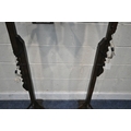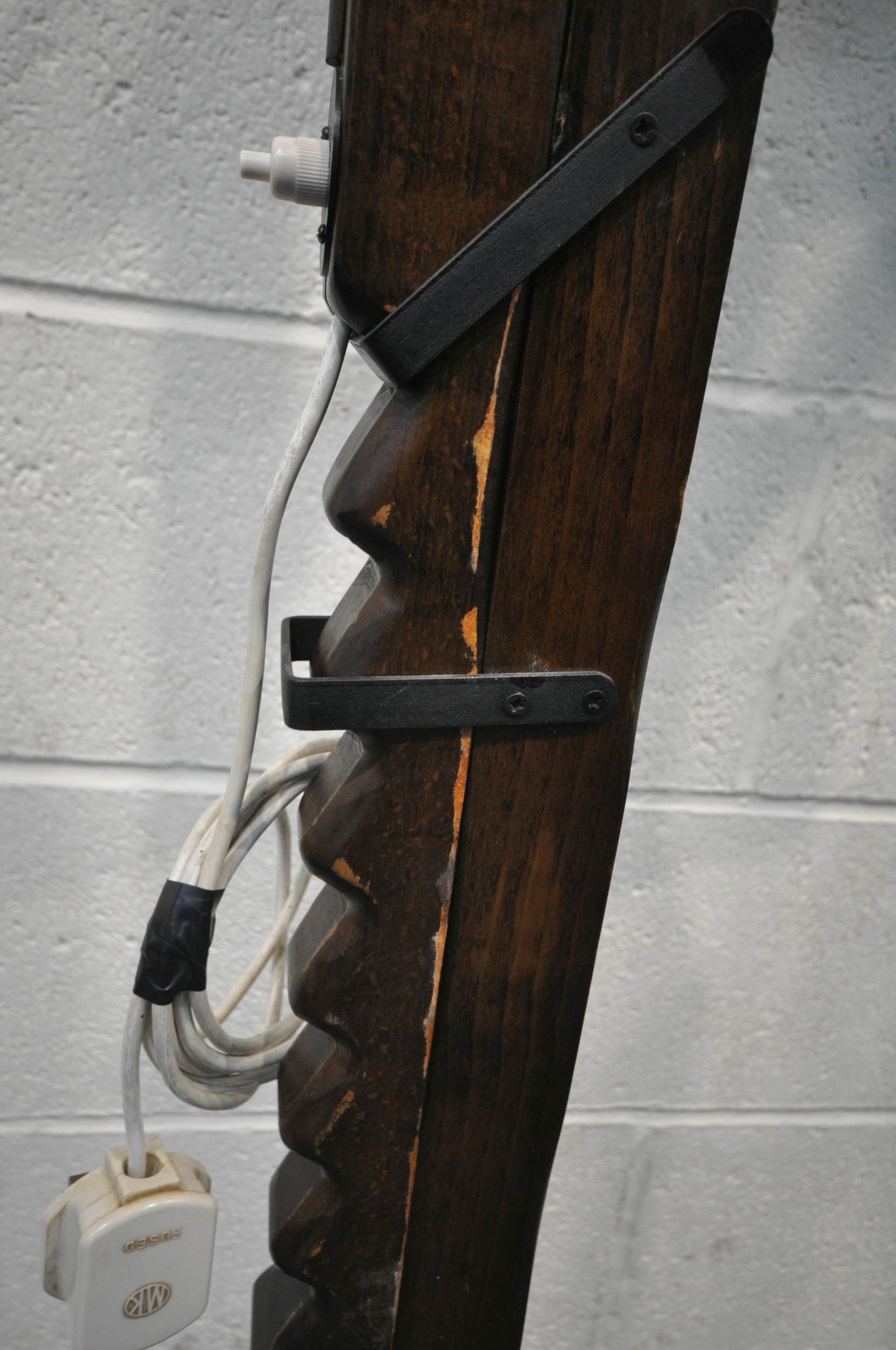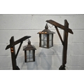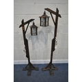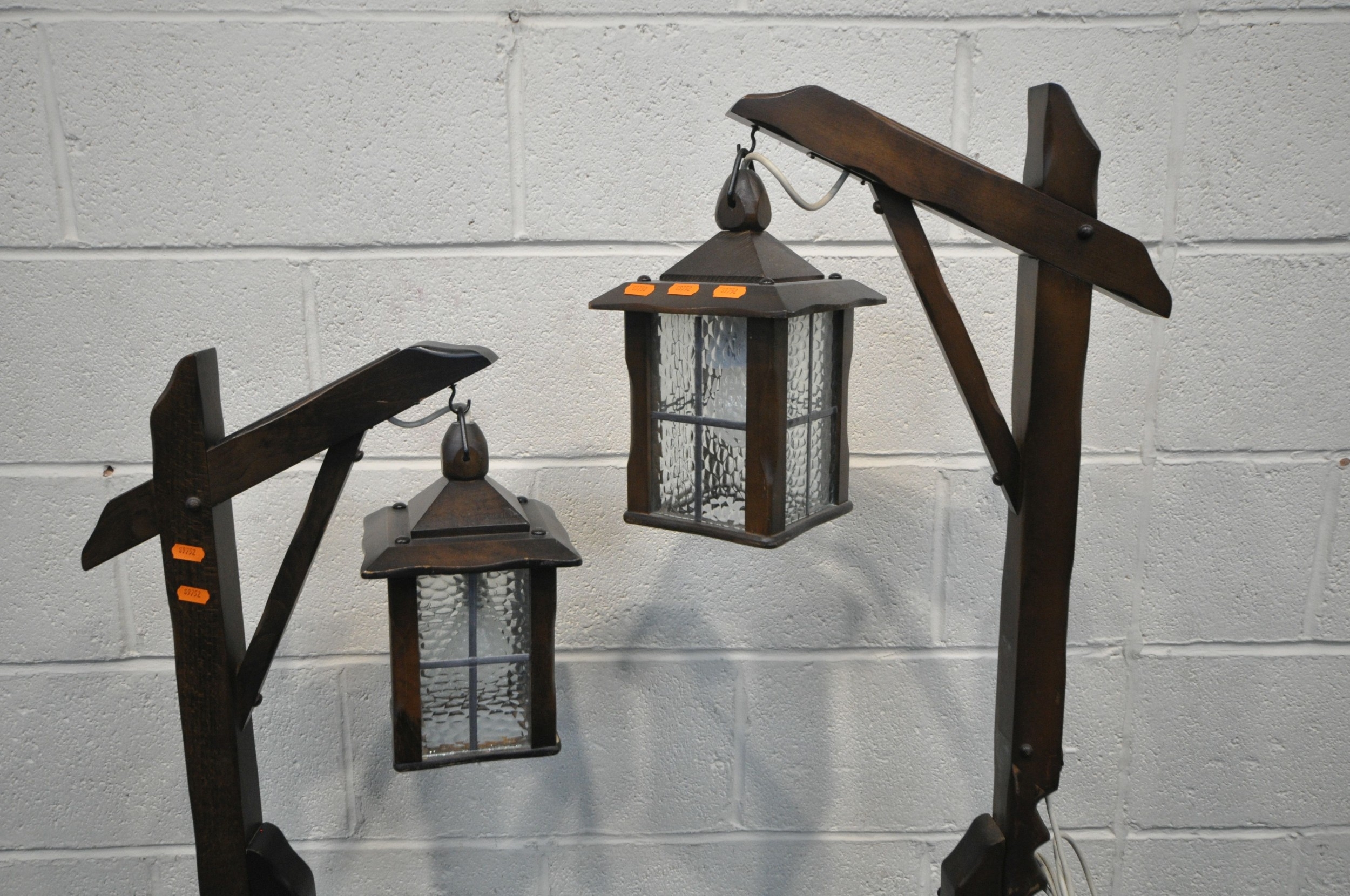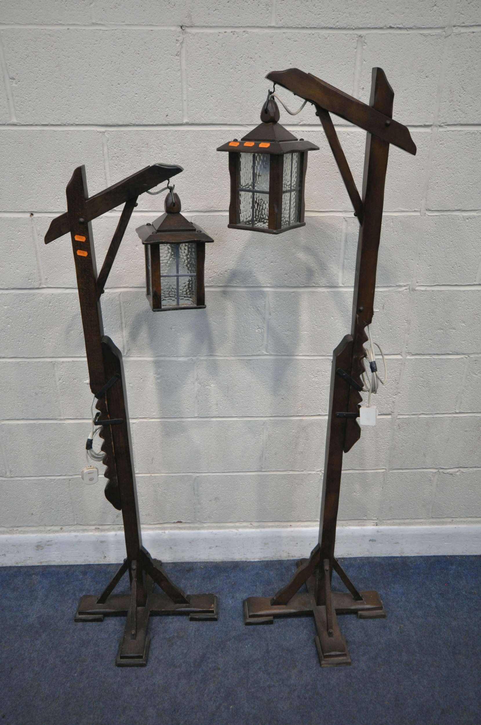 A PAIR OF ARTS AND CRAFTS STYLE OAK STANDARD LAMP, with adjustable height clasp and a four sided glass lantern, maximum height 166cm x minimum height 148cm, condition report: marks, scuffs, other wear and usage (2)