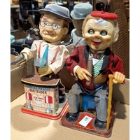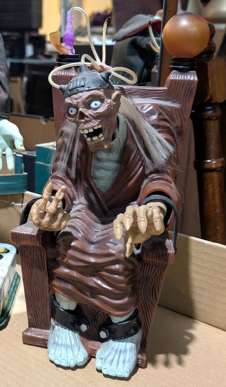 A vintage Japanese Rosko 'Frankenstein' battery operated tinplate toy; battery operated 'Crypt Keeper' on electric chair.