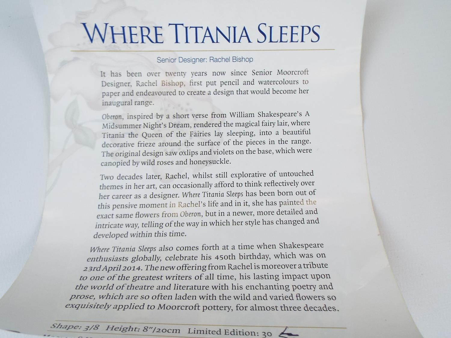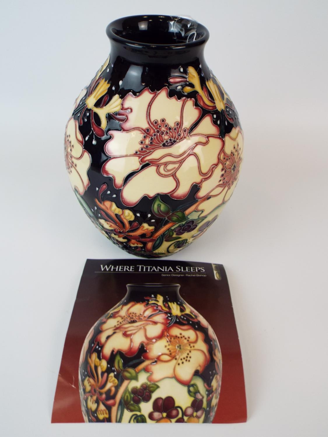 2012 Beehive marked, Moorcroft vase from the 'Where Titania Sleeps' series.Very Limited Edition, Number 20 of just 30 made. Designed and signed by Rachel Bishop. 8 inches tall. Excellent conditon free from any faults.
