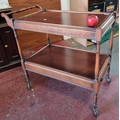 An antique wooden drinks trolley with two tiers, turned wood legs with castors and handle to side. Has lovely carved edge and string inlay detail.