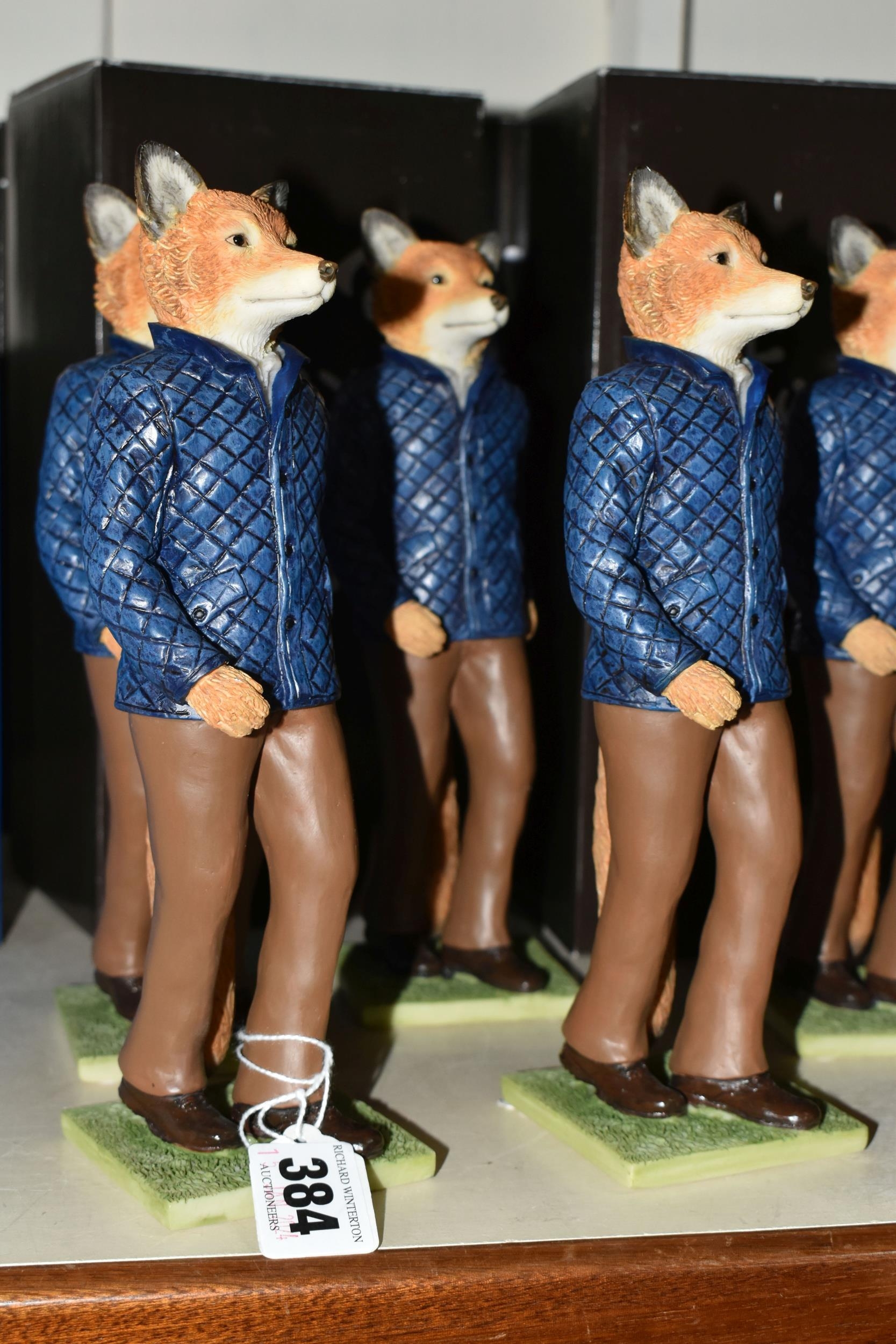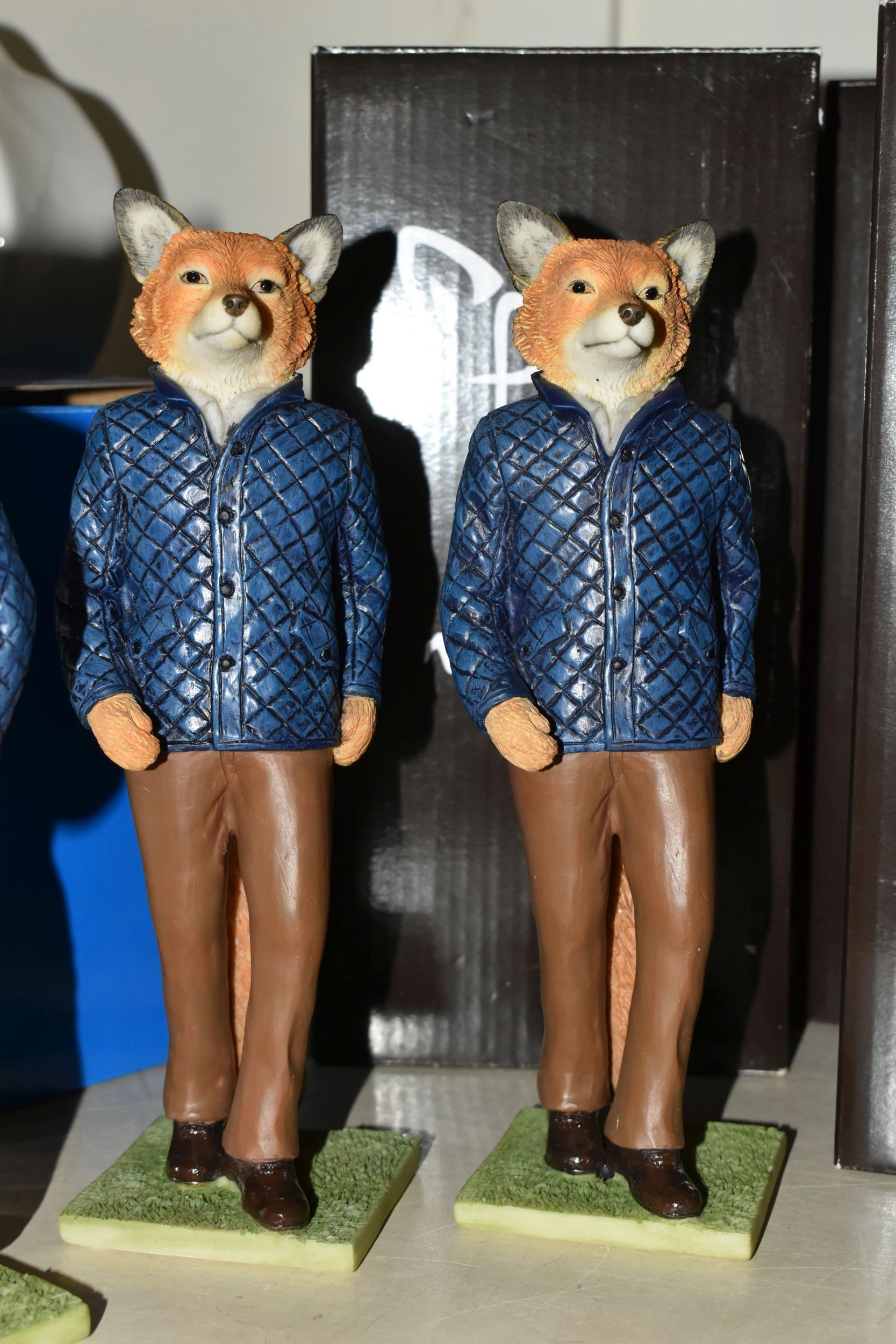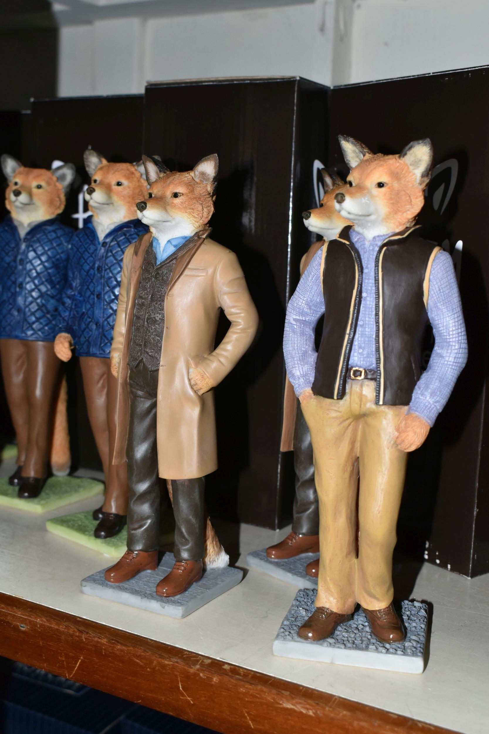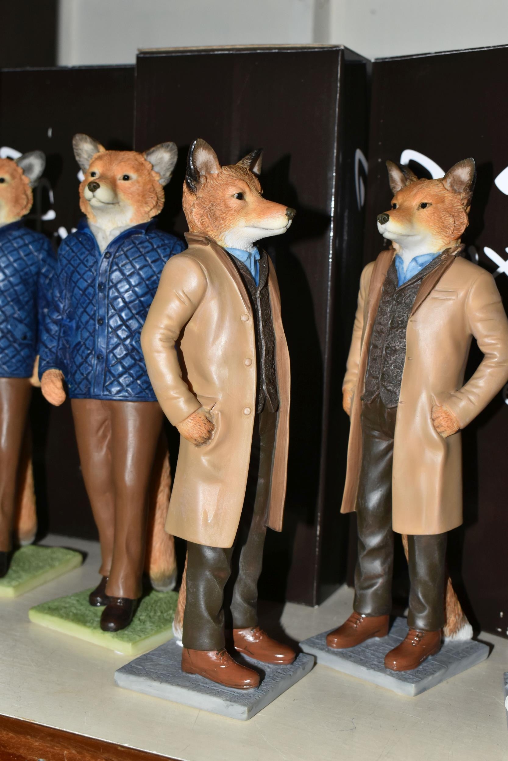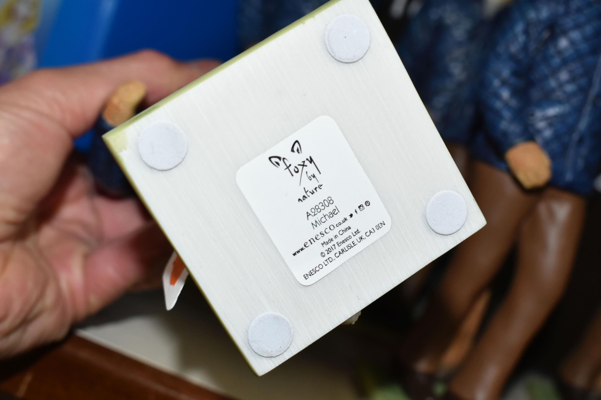 NINE BOXED ENESCO 'FOXY BY NATURE' SCULPTURES, comprising six x Michael A28308, James A28309 and two x Jack A28136, height of tallest 21.5cm (9 + 9 boxes) (Condition Report: most figures appear ok, James' ear has a large chip/loss, boxes a little dusty/marked)