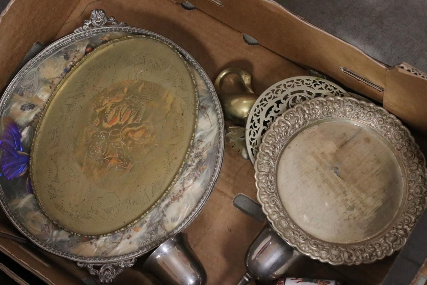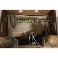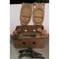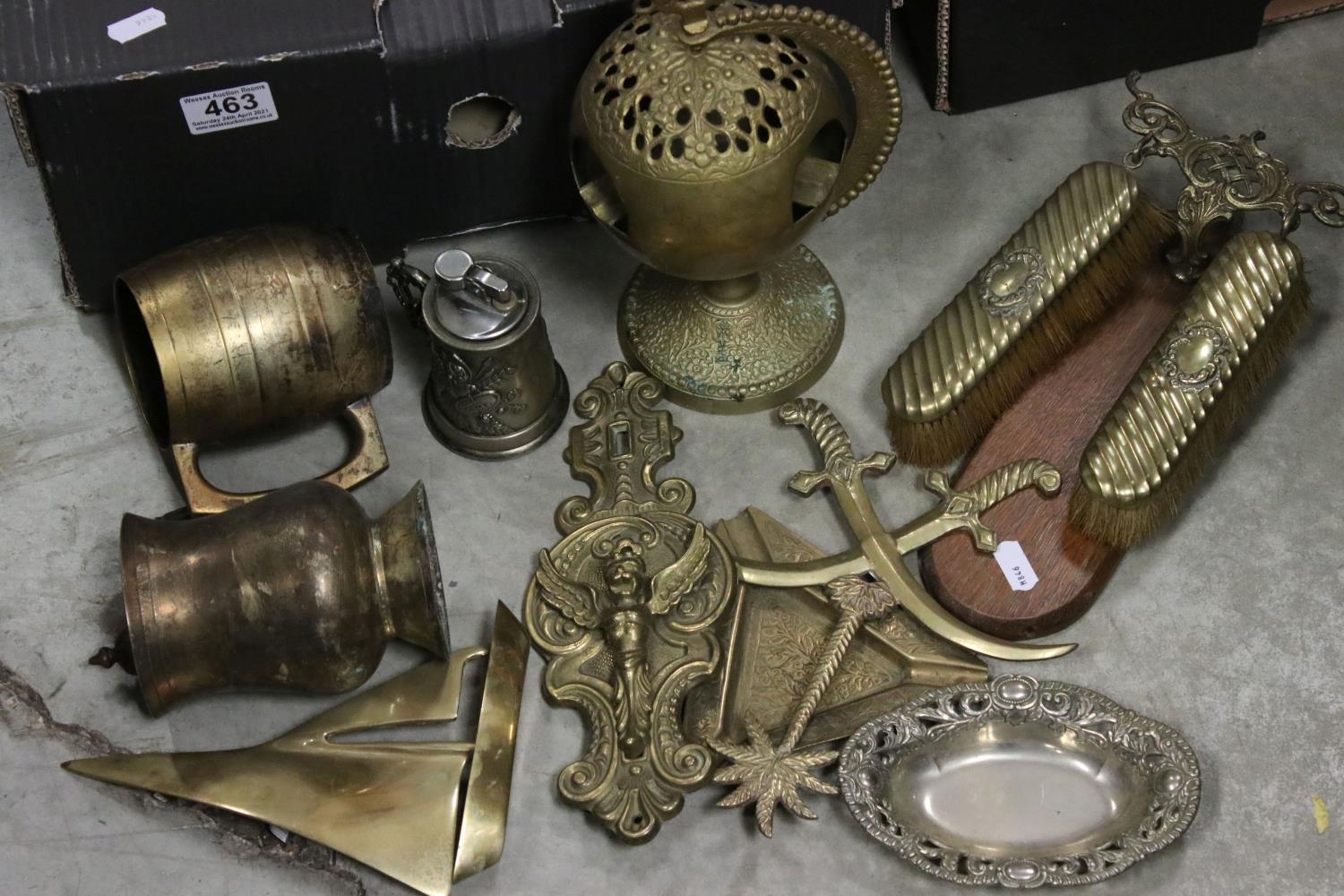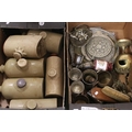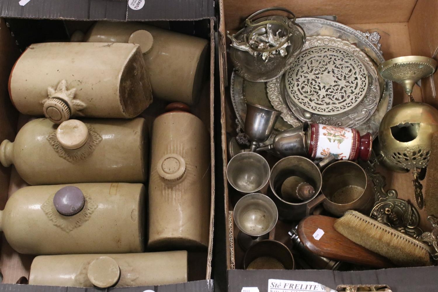 A collection of vintage metal ware together with a collection of salt glaze hot water bottles.