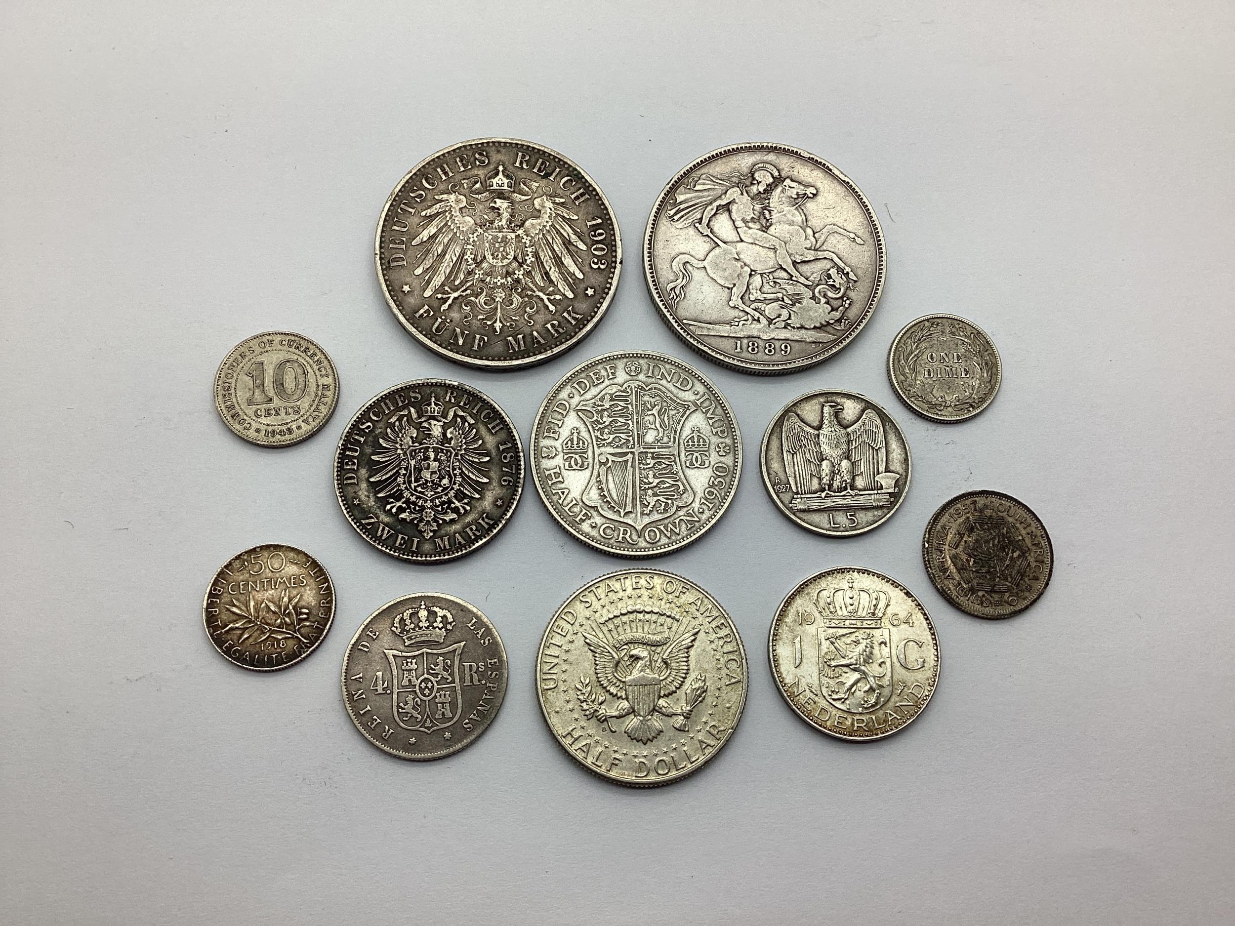 Collection Of Mixed GB And World Silver Coins, including an 1889 GB Victoria Crown, 1903 William II 5 Mark, 1964 Kennedy Half Dollar etc, total weight 120g.