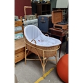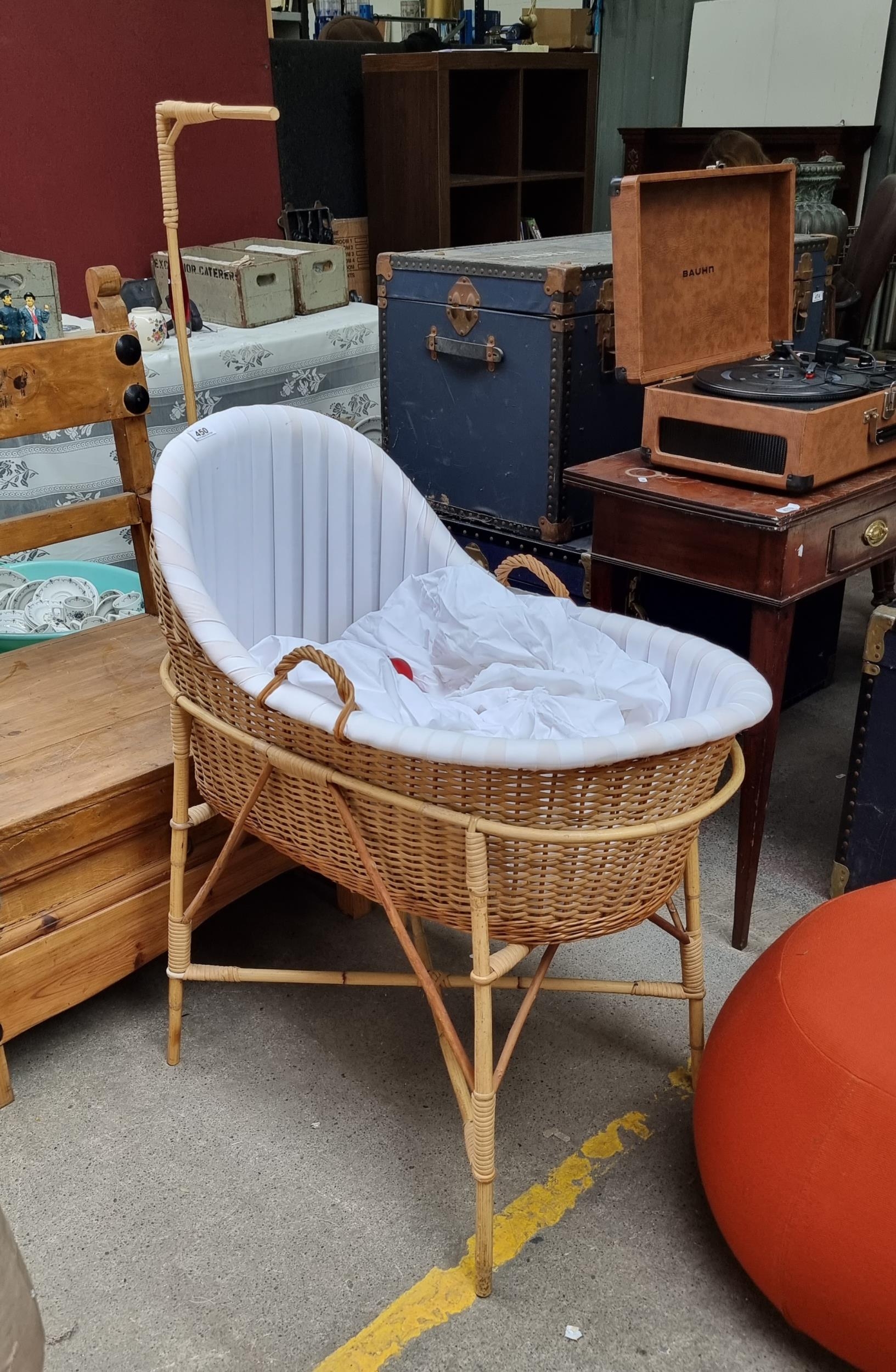 A wicker baby bassinet with removable basket featuring a padded liner and cloth covers.