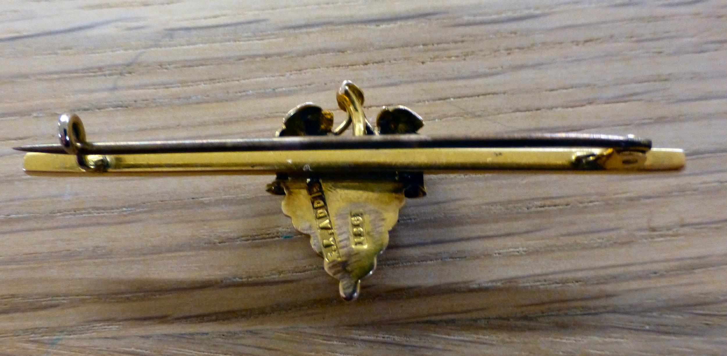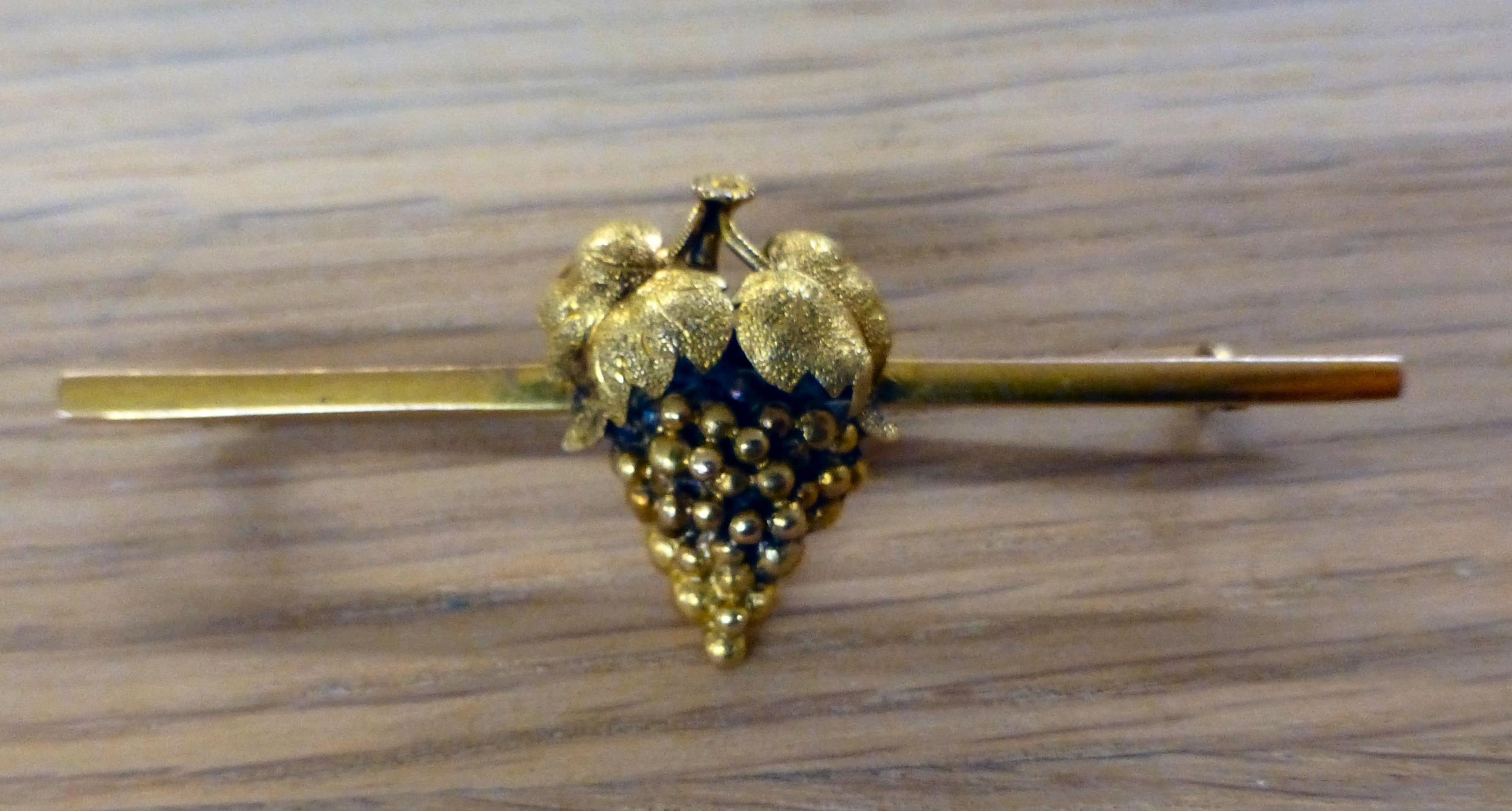 A yellow metal bar brooch, surmounted by a bunch of grapes under foliage stamped 18ct verso (approx. combined gross weight 8 grams)