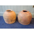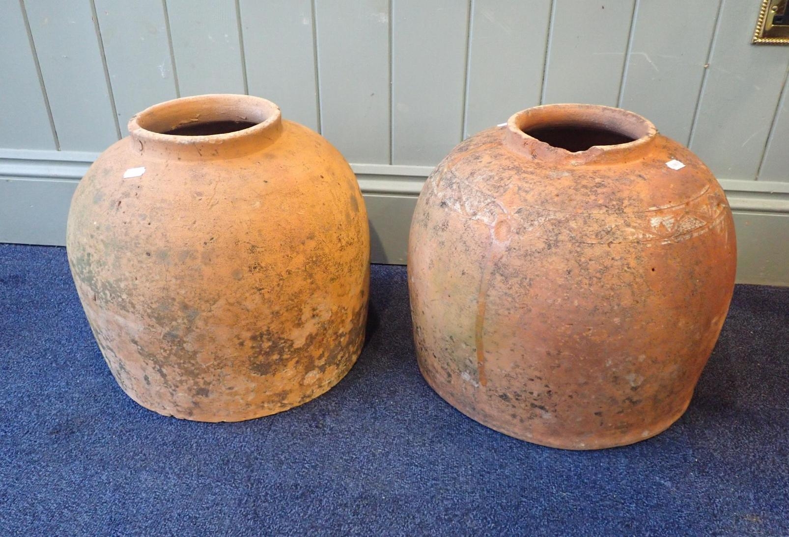 TWO TERRACOTTA GARDEN FORCING POTS33cm high, approx 35cm dia. (chips, no lids)