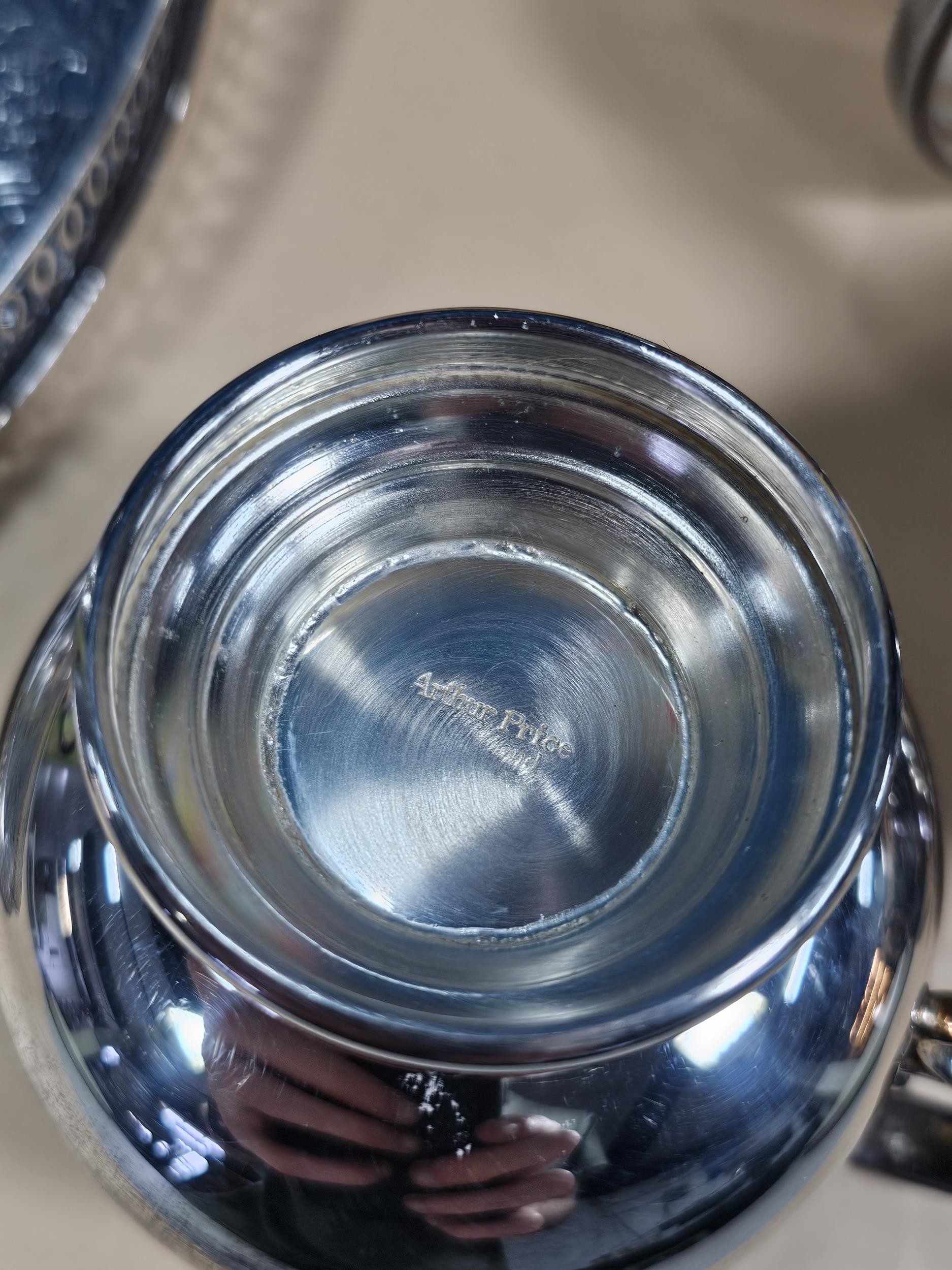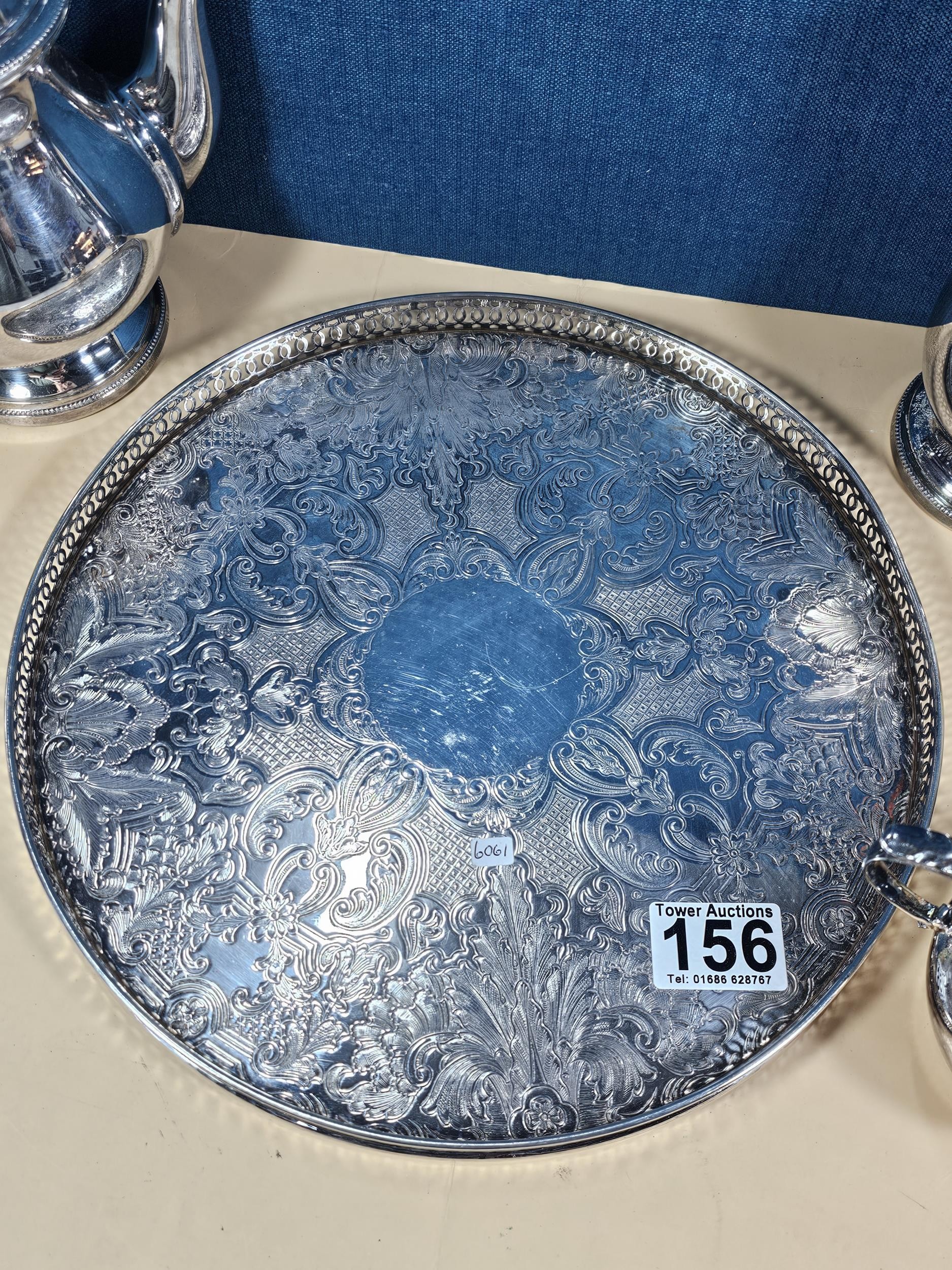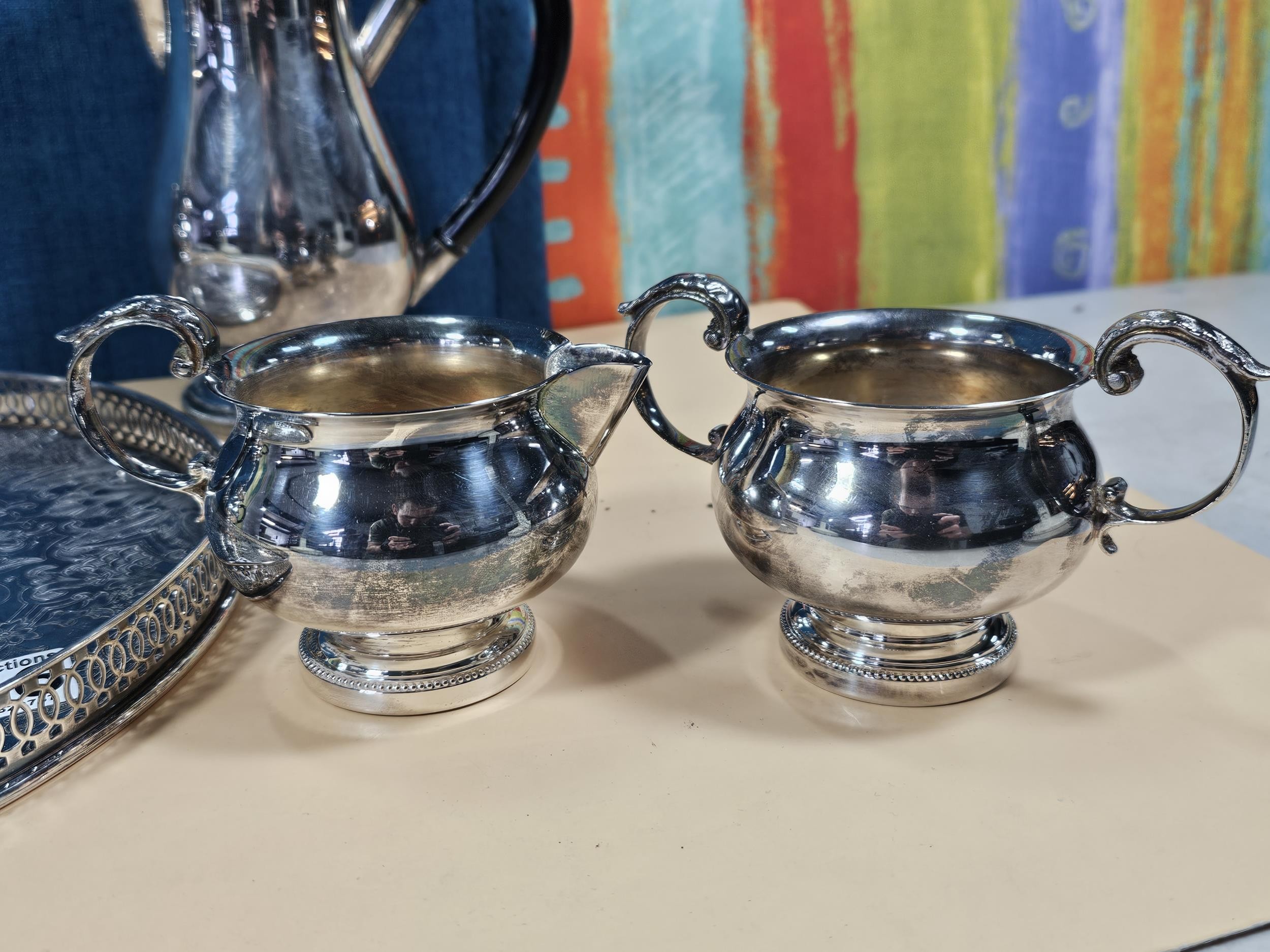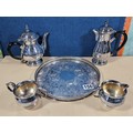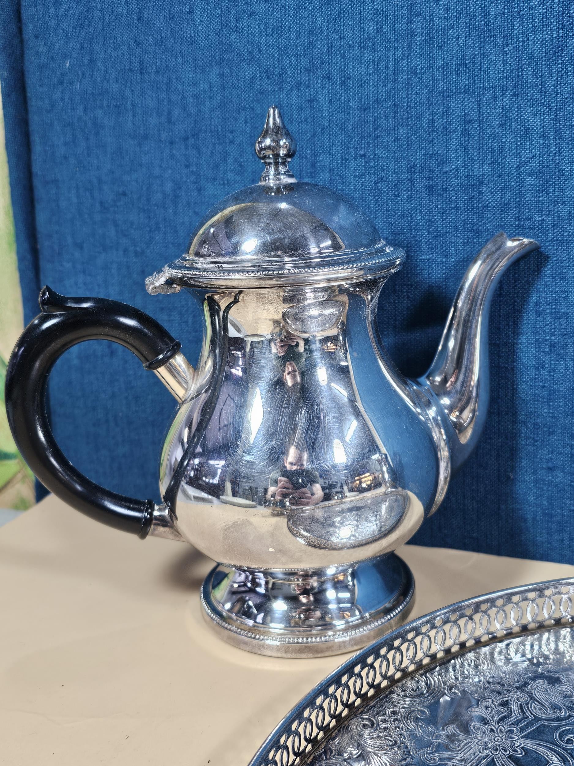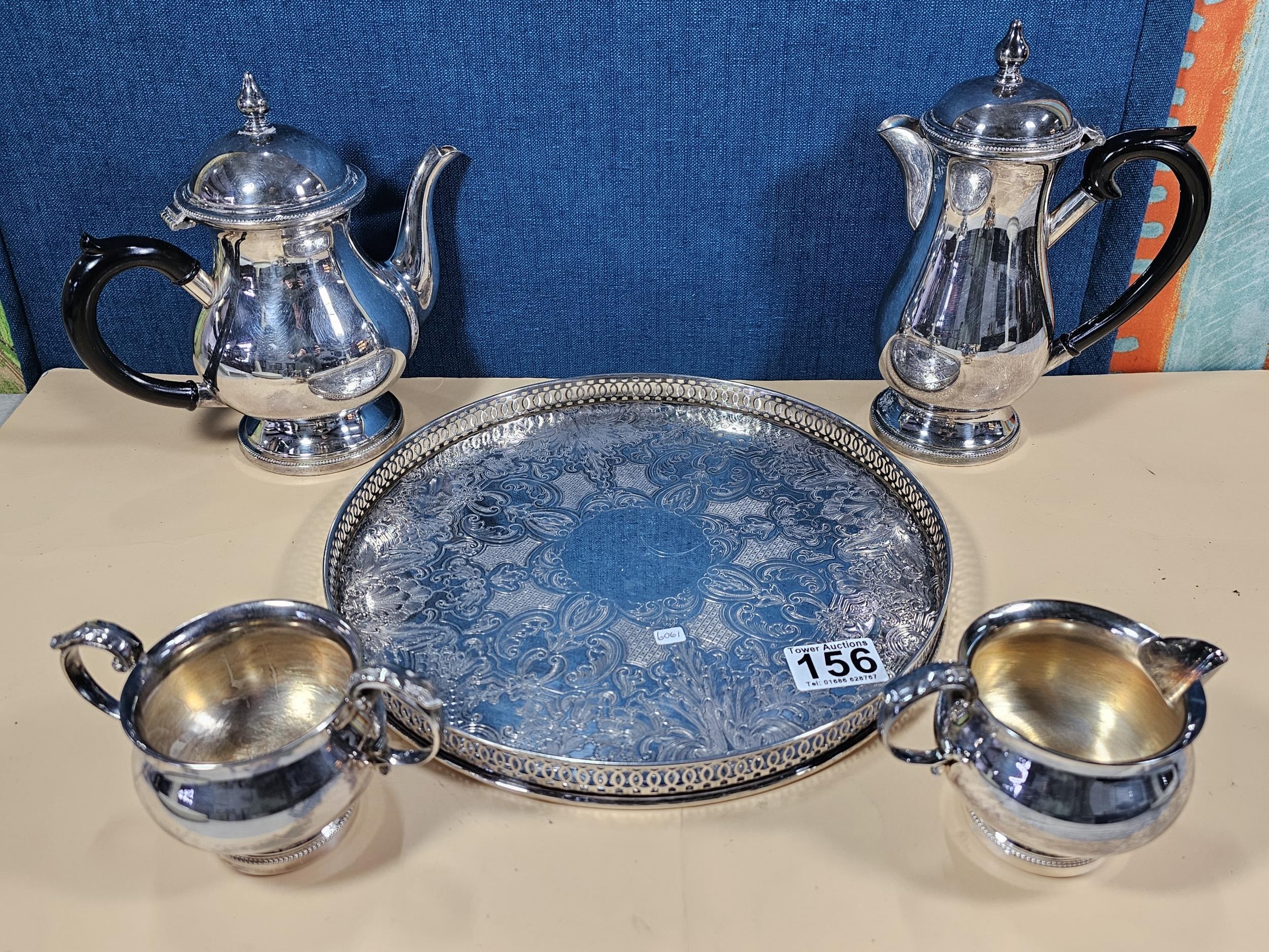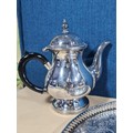 A good quality silver plated Arthur Price teaset consisting of teapot hot water pot, sugar bowl and milk jug along with an unnamed gallery tray with leaf decoration