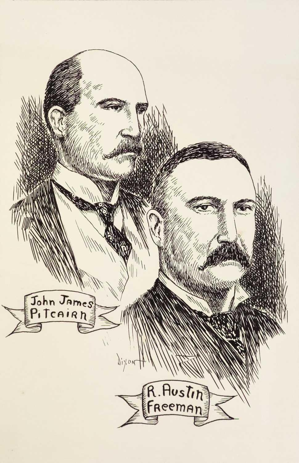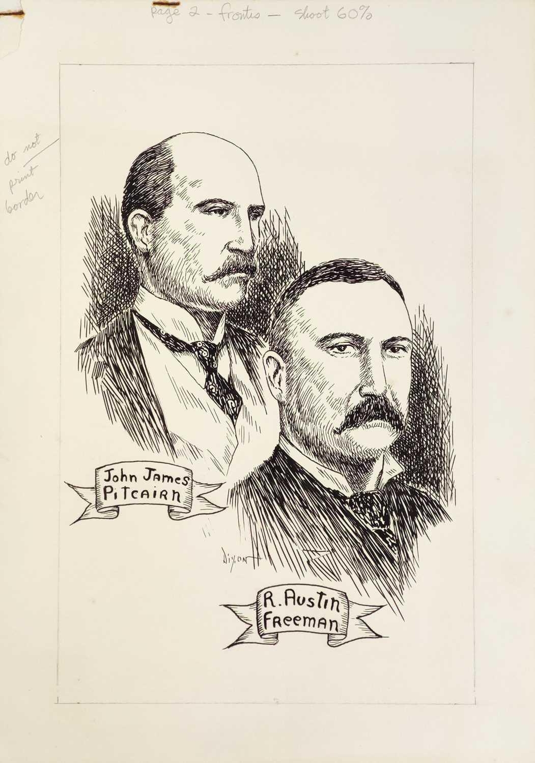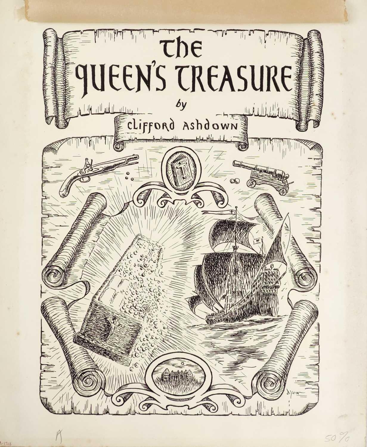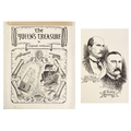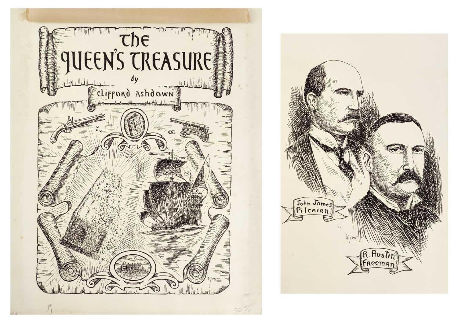 William DIXON Two original illustrations for the book 'The Queens Treasure'. Written by Clifford Ashdown, a pseudonym for R. Austin Freeman and John J. Pitcairn. Dust jacket and frontispiece, both in ink with inscribed notes from the illustrator in graphite. Each 37cm x 31cm