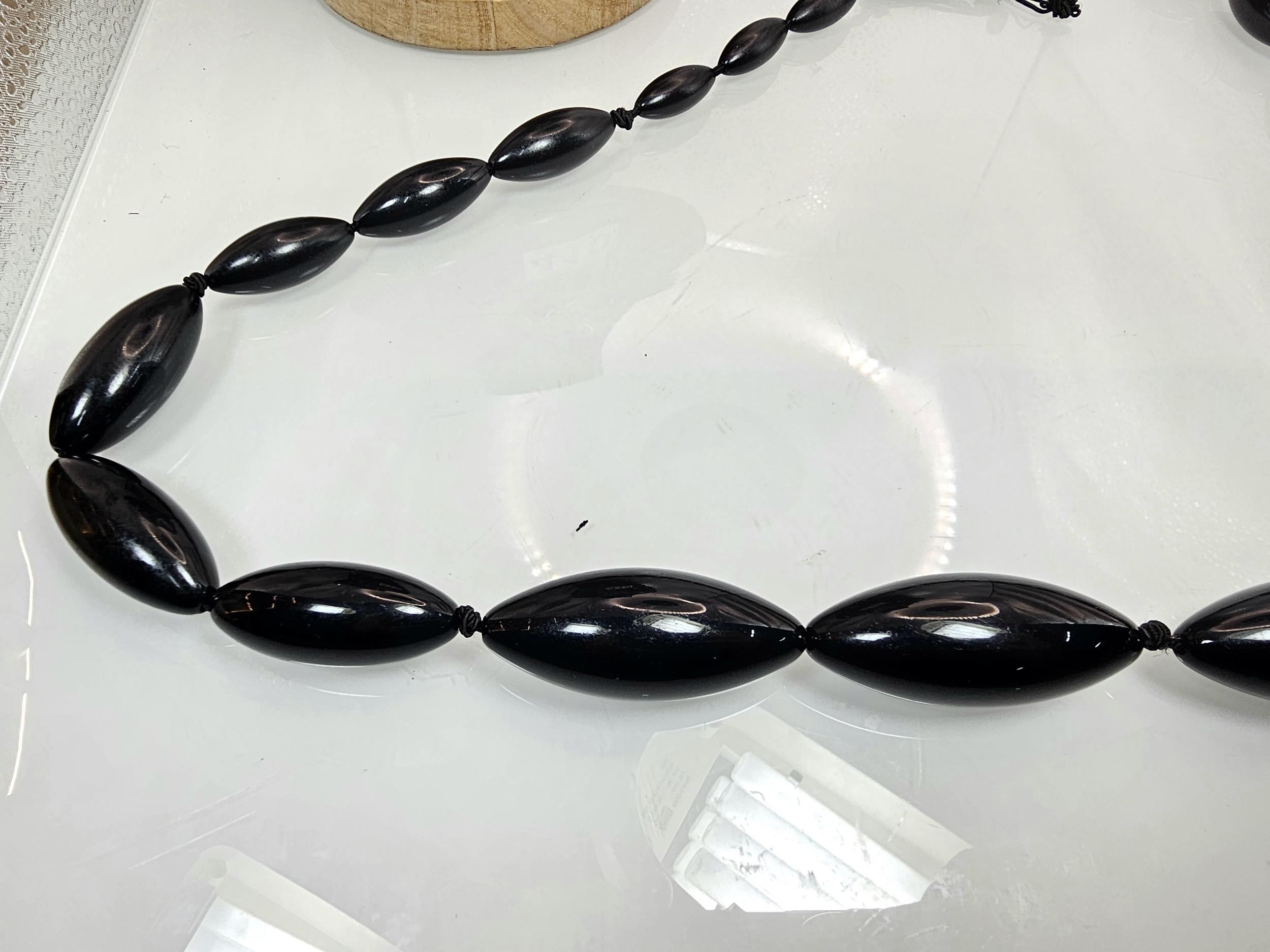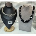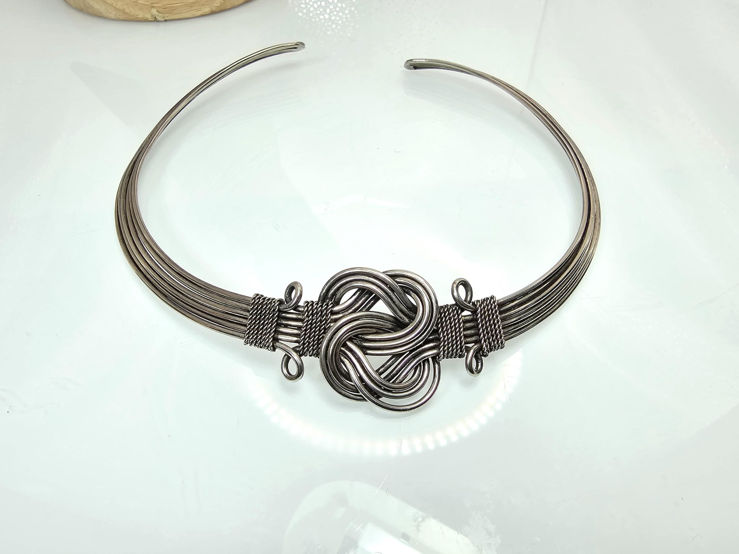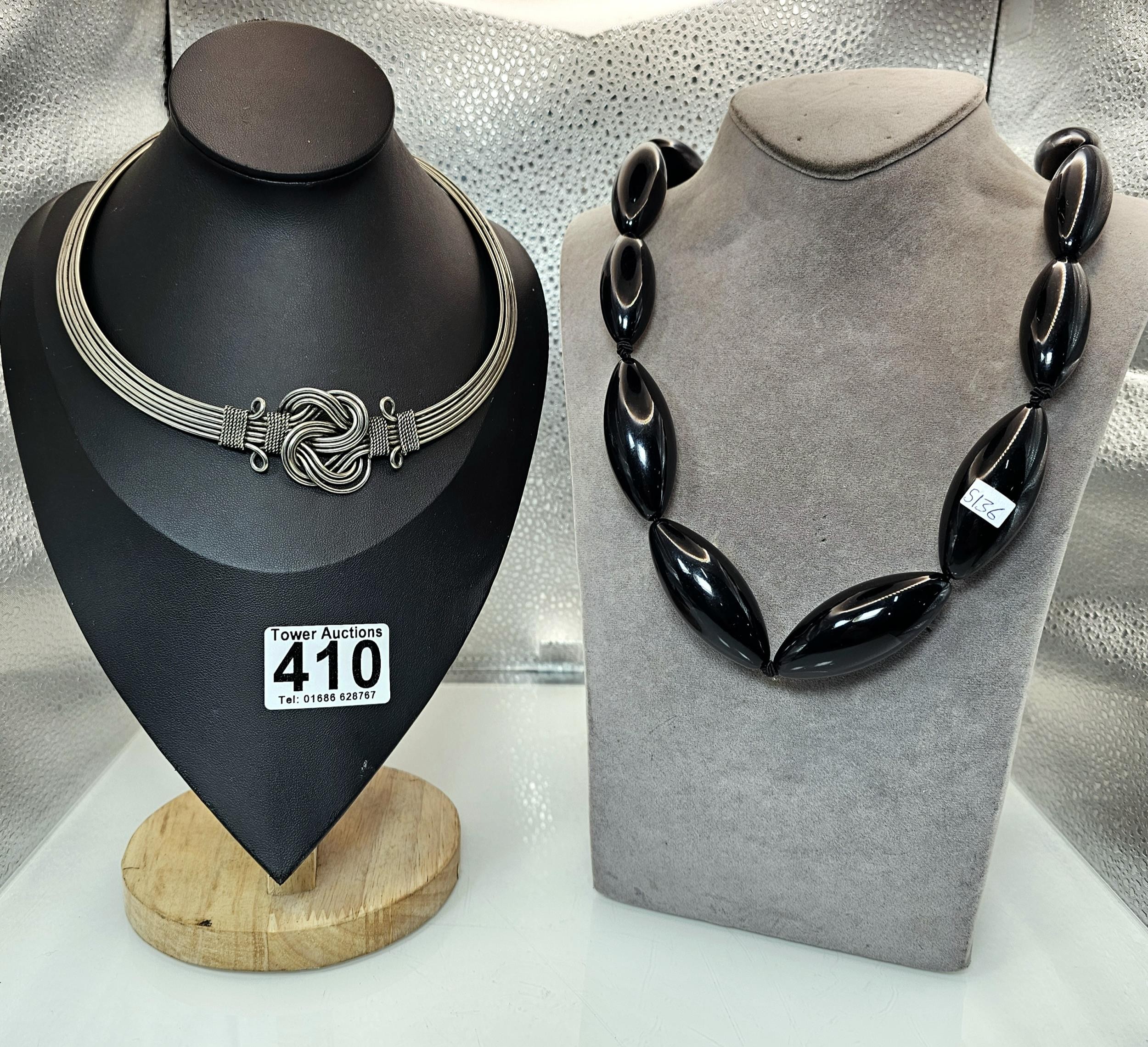 Two good vintage jewellery items to include a stunning ornate white metal multi strand choker necklace, having an art nouveau design, along with a large vintage early plastic beaded necklace with a hand knotted design. It has a length of 36 inches. The choker has a width of 15.5 cm and a length of 16cm.