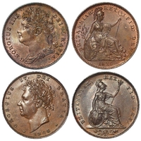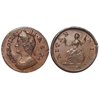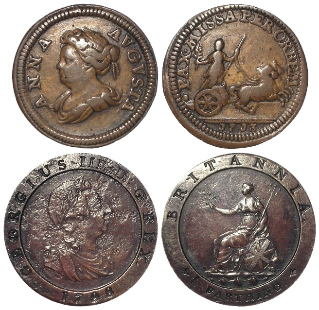 Farthing Patterns (2): R74 copper/bronze restrike Soho "cartwheel" pattern Farthing 1798, struck from rusted dies, ship obliterated, GVF for type, light edge knock; along with an antique cast copy of a Queen Anne, Pax in biga type pattern Farthing in copper dated 1713, nVF.