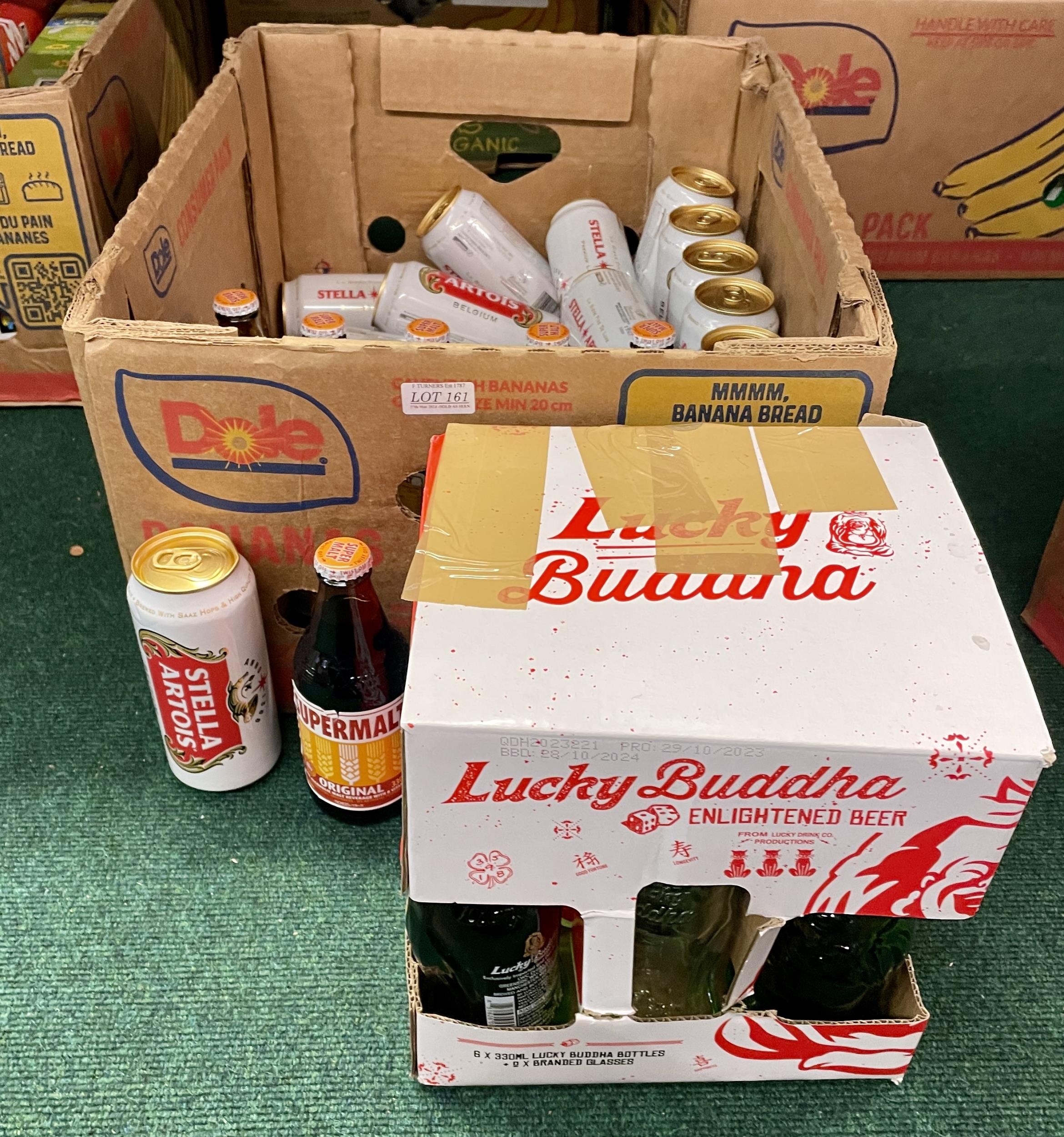 BOX OF MIXED BEERS INC. LUCKY BUDDAH, STELLA ARTOIS, NON-ALCOHOLIC SUPER MALT