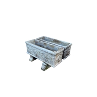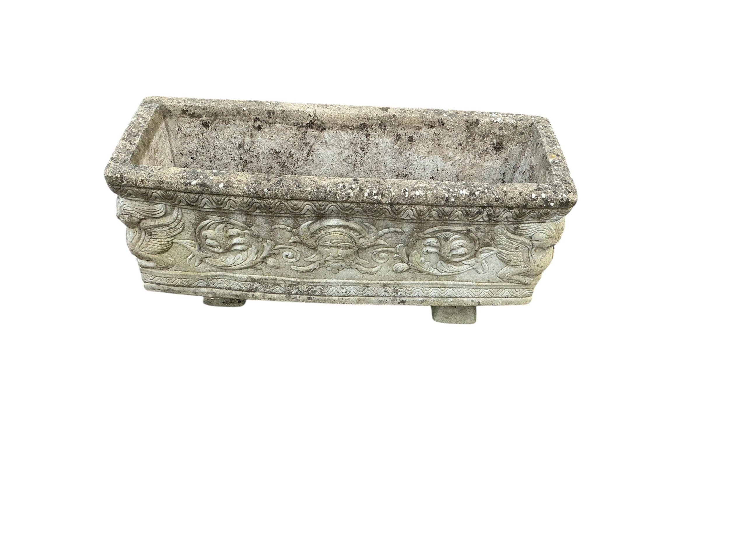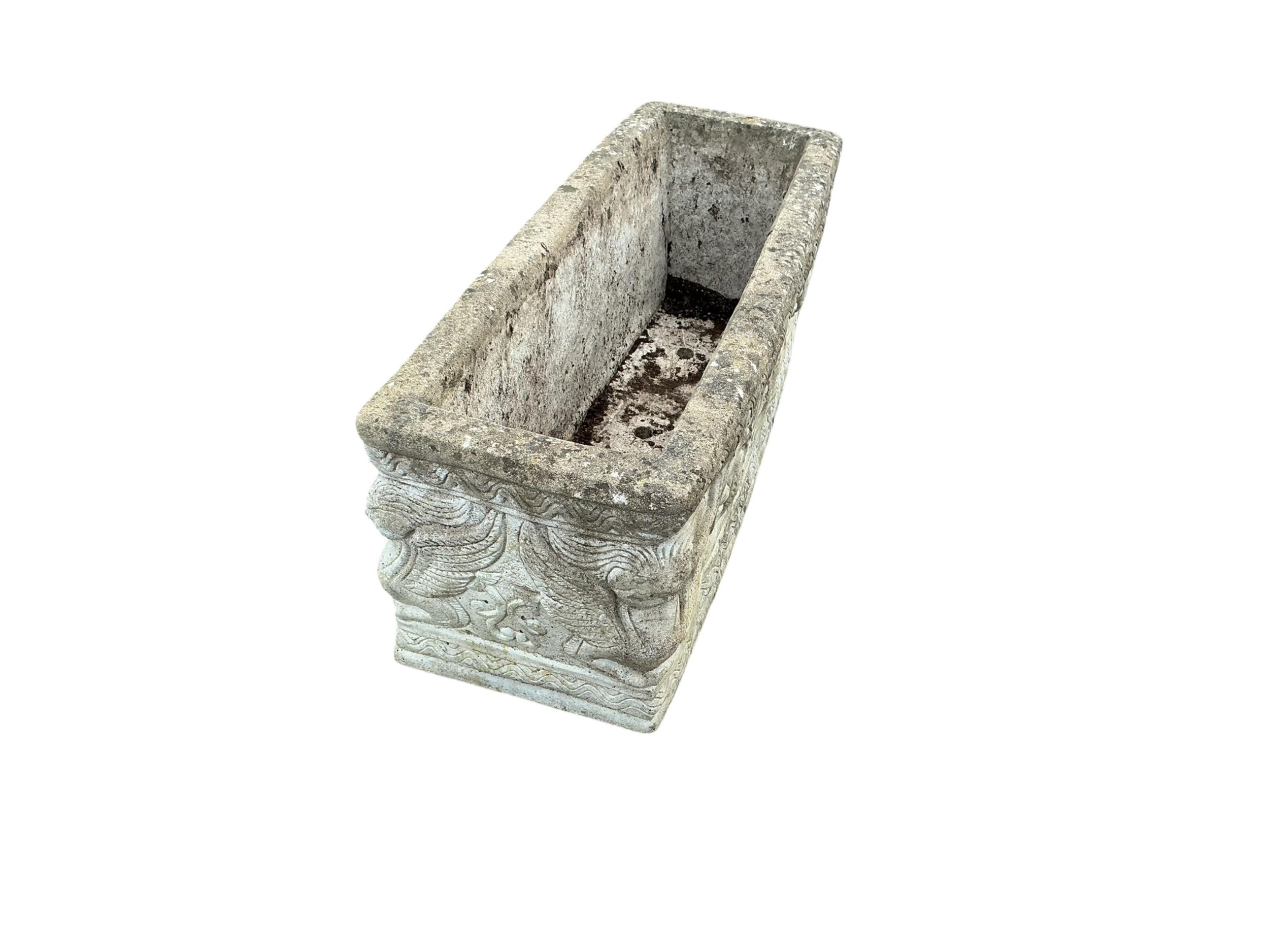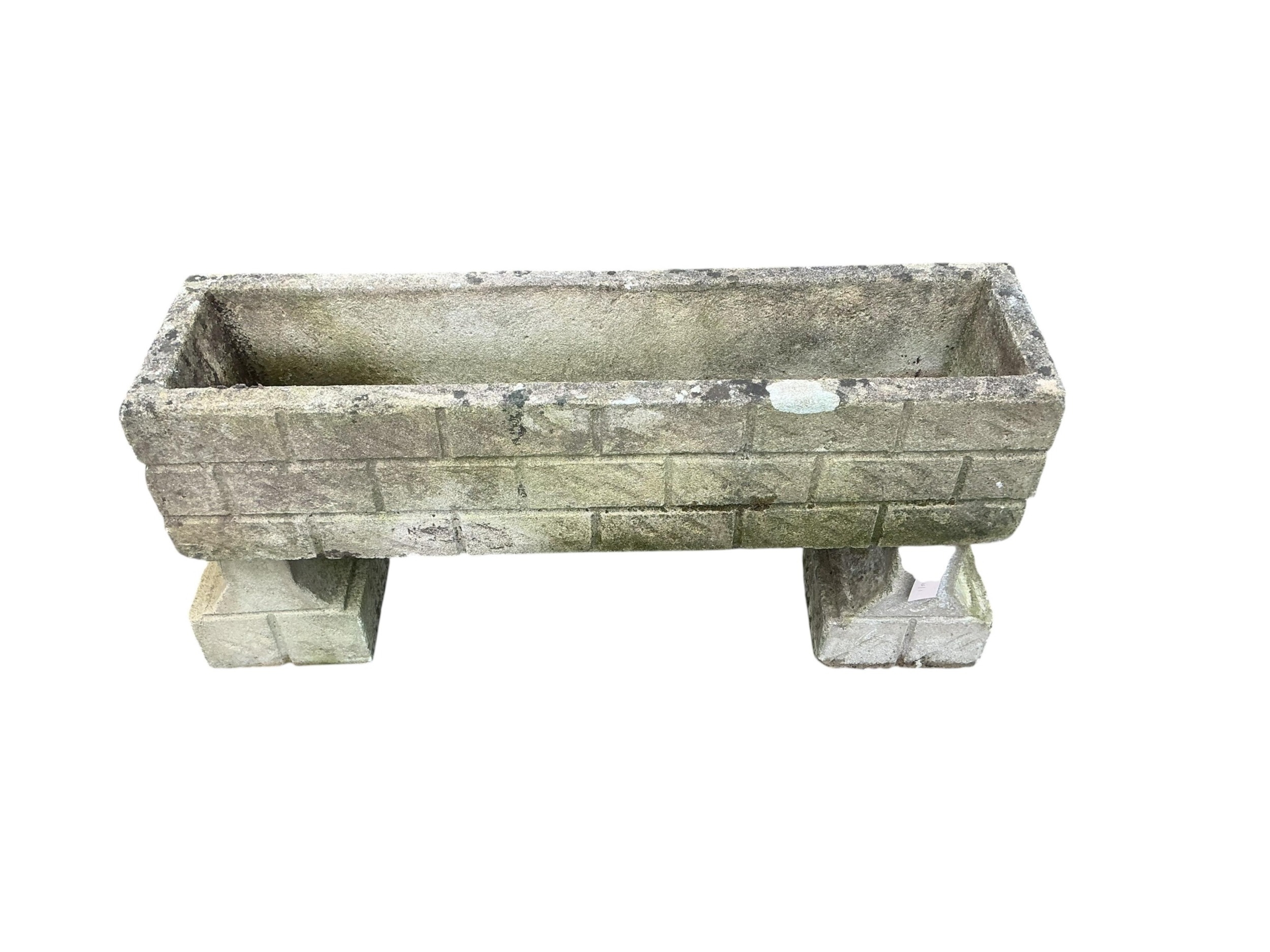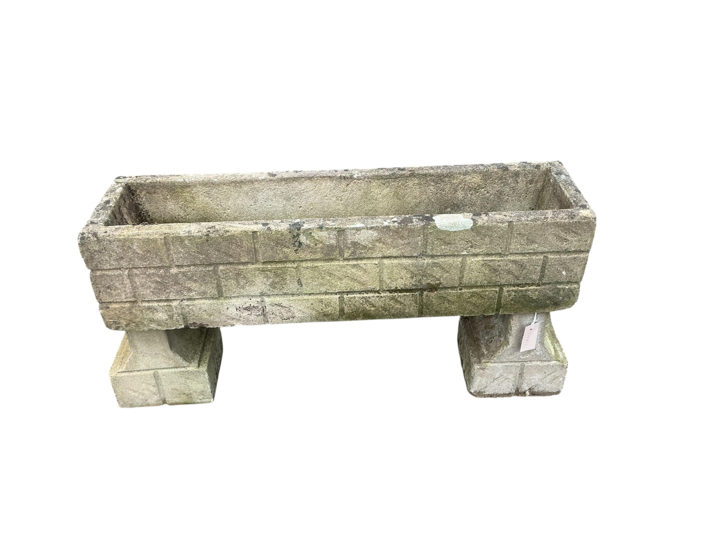 A rectangular reconstituted stone brick effect garden planter, on stand, width 91cm, depth 23cm, height 50cm, and another similar smaller planter