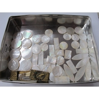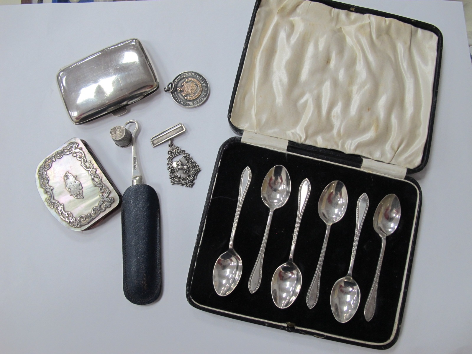 Silver items - a cased set of six silver spoons (Birmingham 1929), a cigarette case (Birmingham 1918), a cased Mother of Pearl boot puller (Sheffield 1904), silvermounted Mother of Pearl purse, silver school badge and silver thimble. (6)