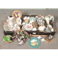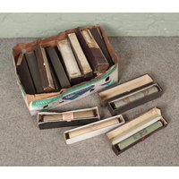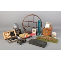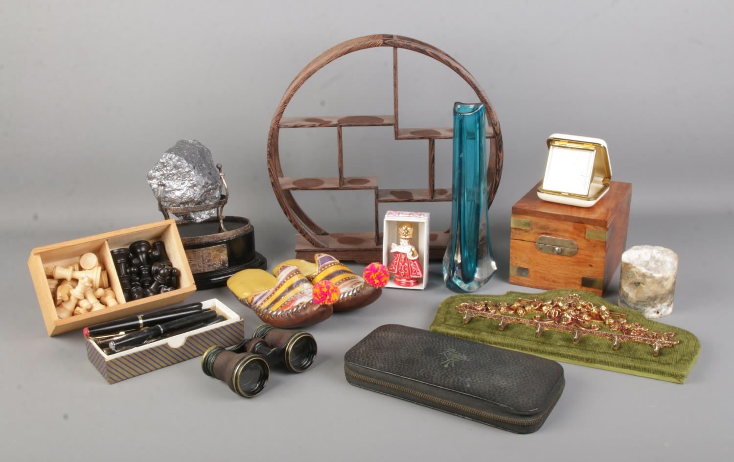 A box containing a large quantity of collectables, to include Whitefriars style tricorn vase, travel clock, chess pieces, opera glasses, decorative wooden shelf, fountain pens etc.
