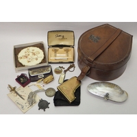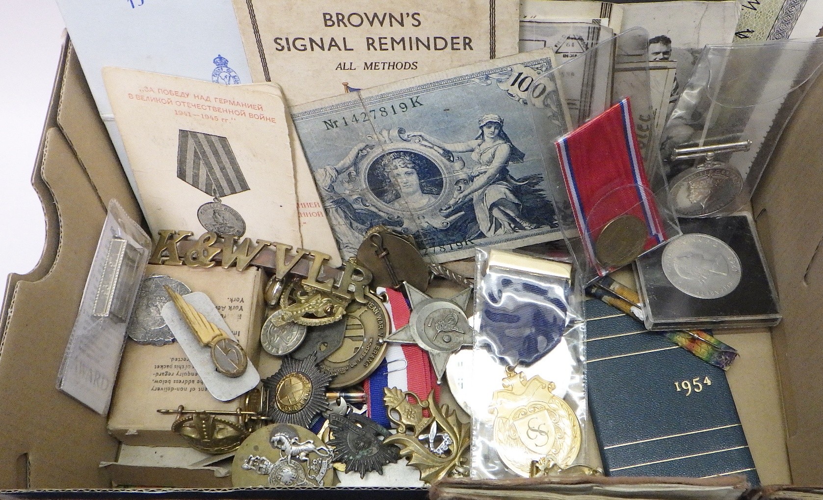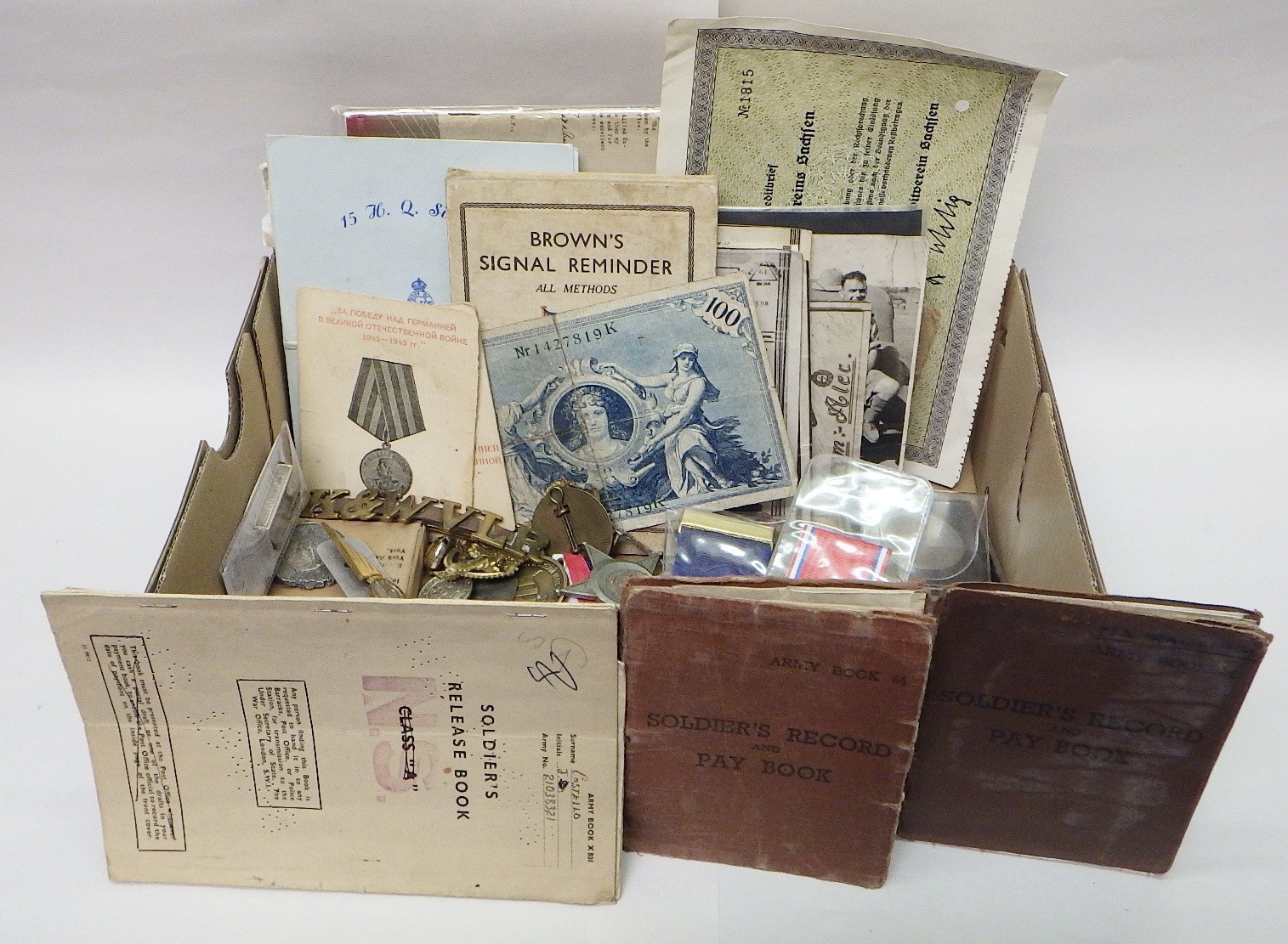 Militaria to include Soldier's Record and Pay Book 1940s / 1950s; badges; identity tags; a WW2 service medal etc; other ephemera incl a Keighley & Worth Valley Light Railway brass cap badge, a Buckingham Palace Garden Party invitation, etc