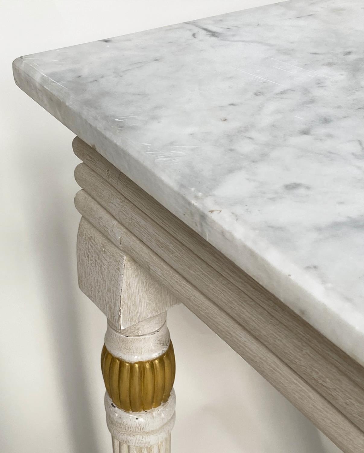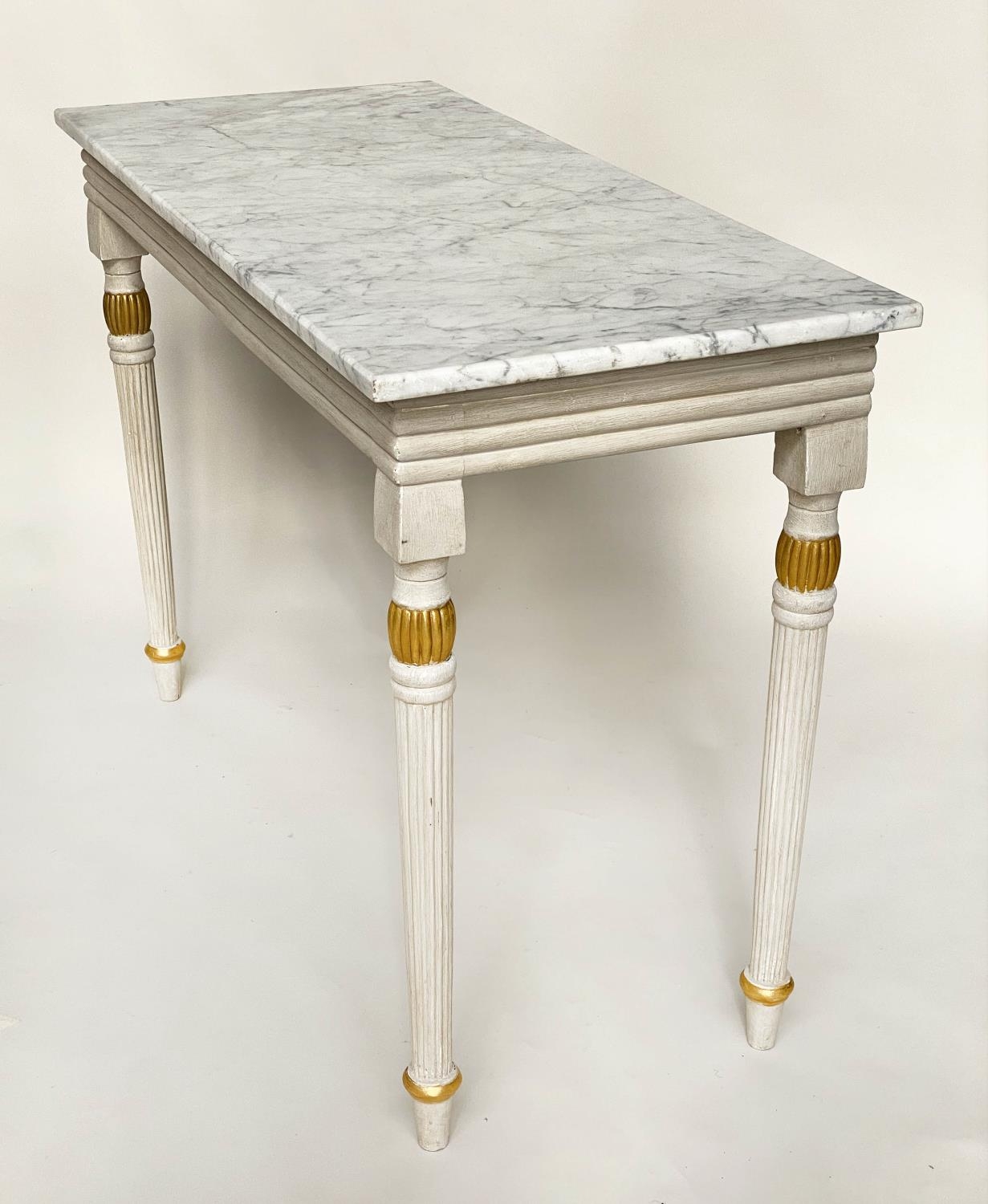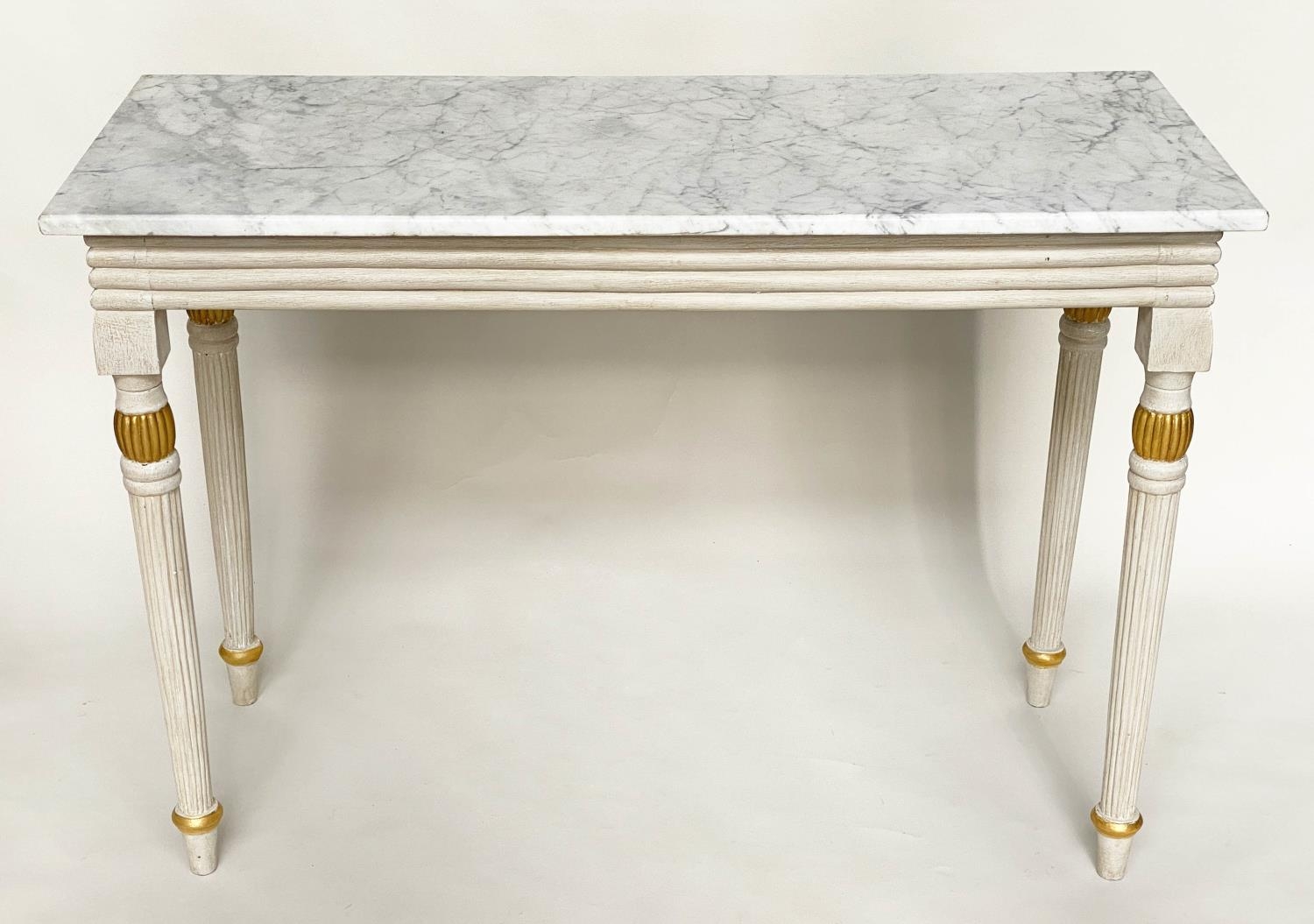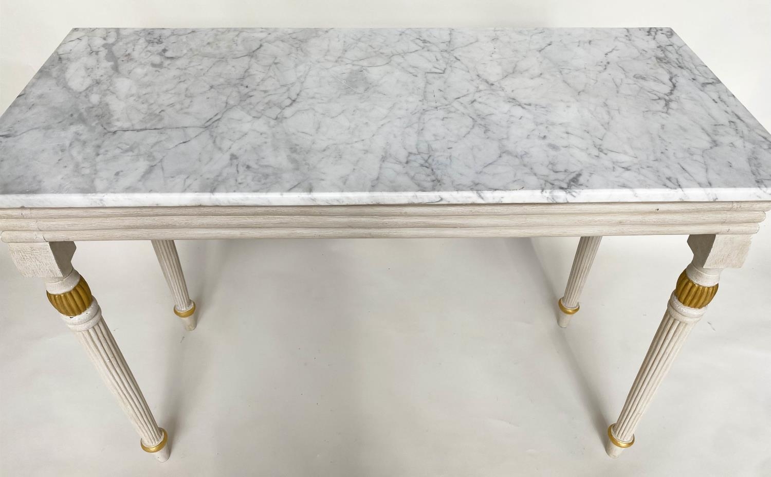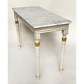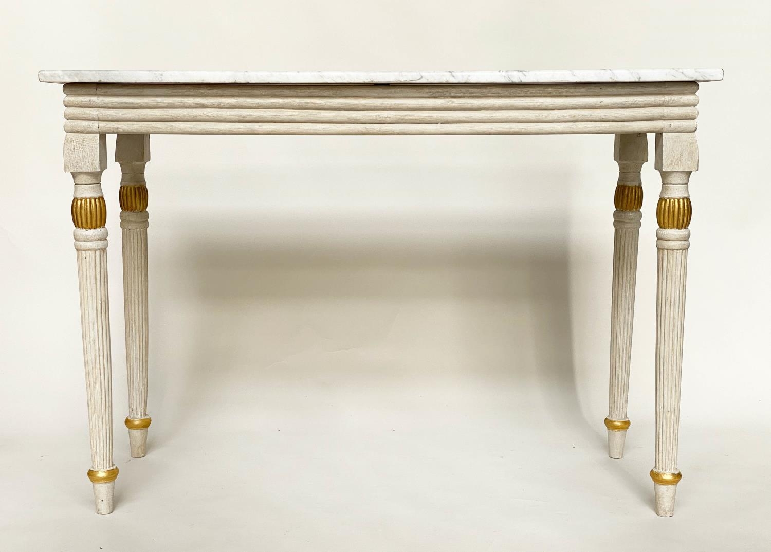 CONSOLE TABLE, Regency style grey painted and parcel gilt, with reeded frieze and supports with grey veined white marble top, 123cm W x 53cm D x 84cm H.