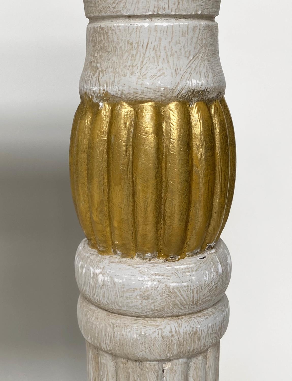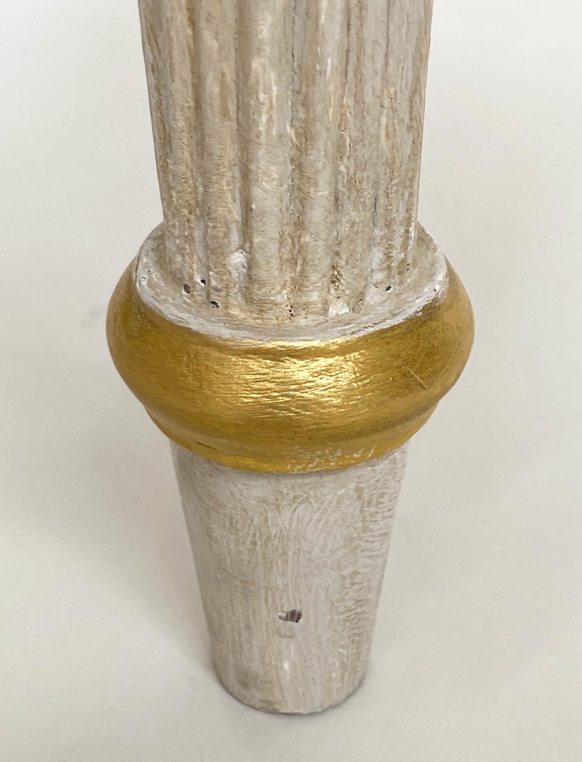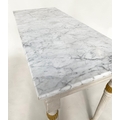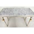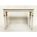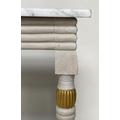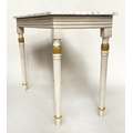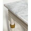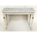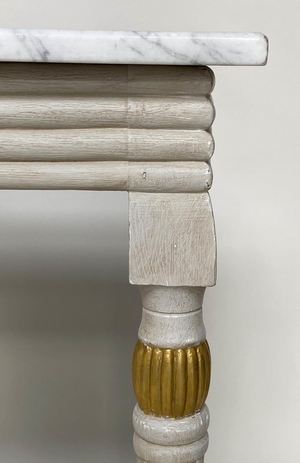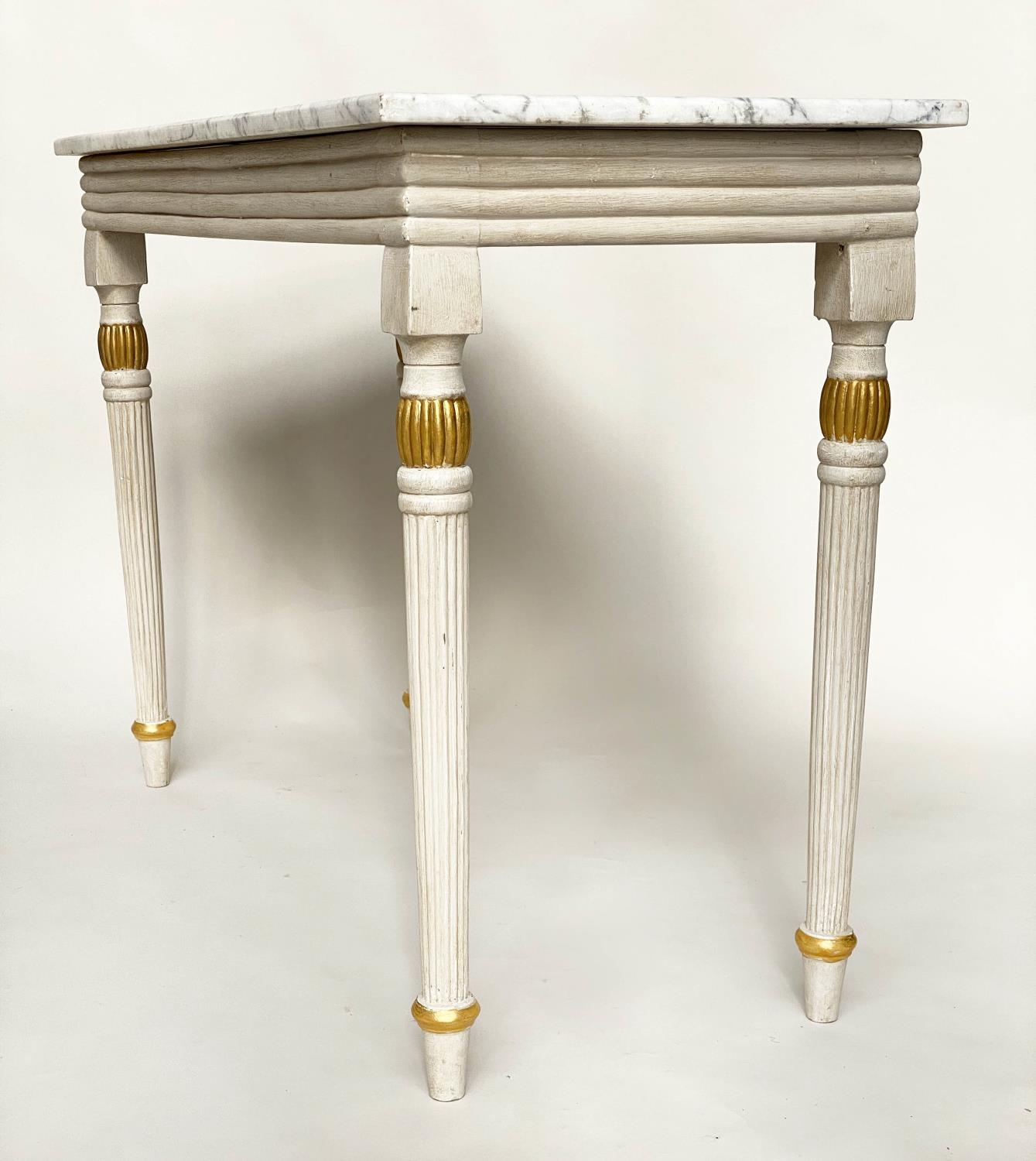 CONSOLE TABLE, Regency style grey painted and parcel gilt, with reeded frieze and supports with grey veined white marble top, 123cm W x 53cm D x 84cm H.