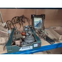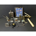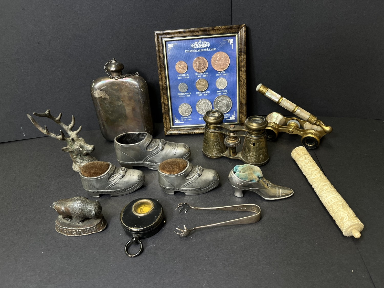 A selection of collector's items inc. 2 pairs of opera glasses; hip flask; pin cushion boots; pre decimal coins, mounted etc.