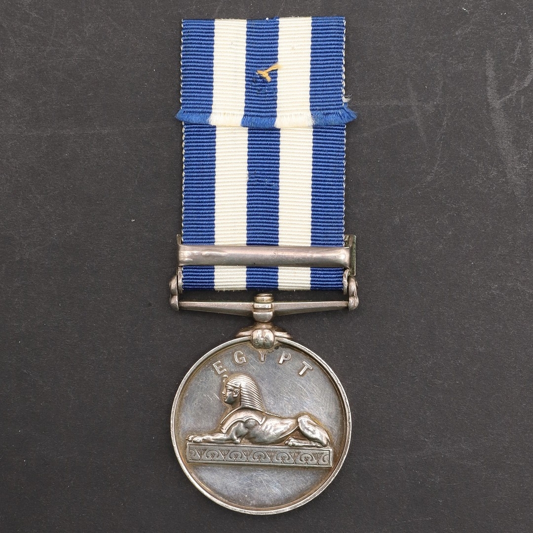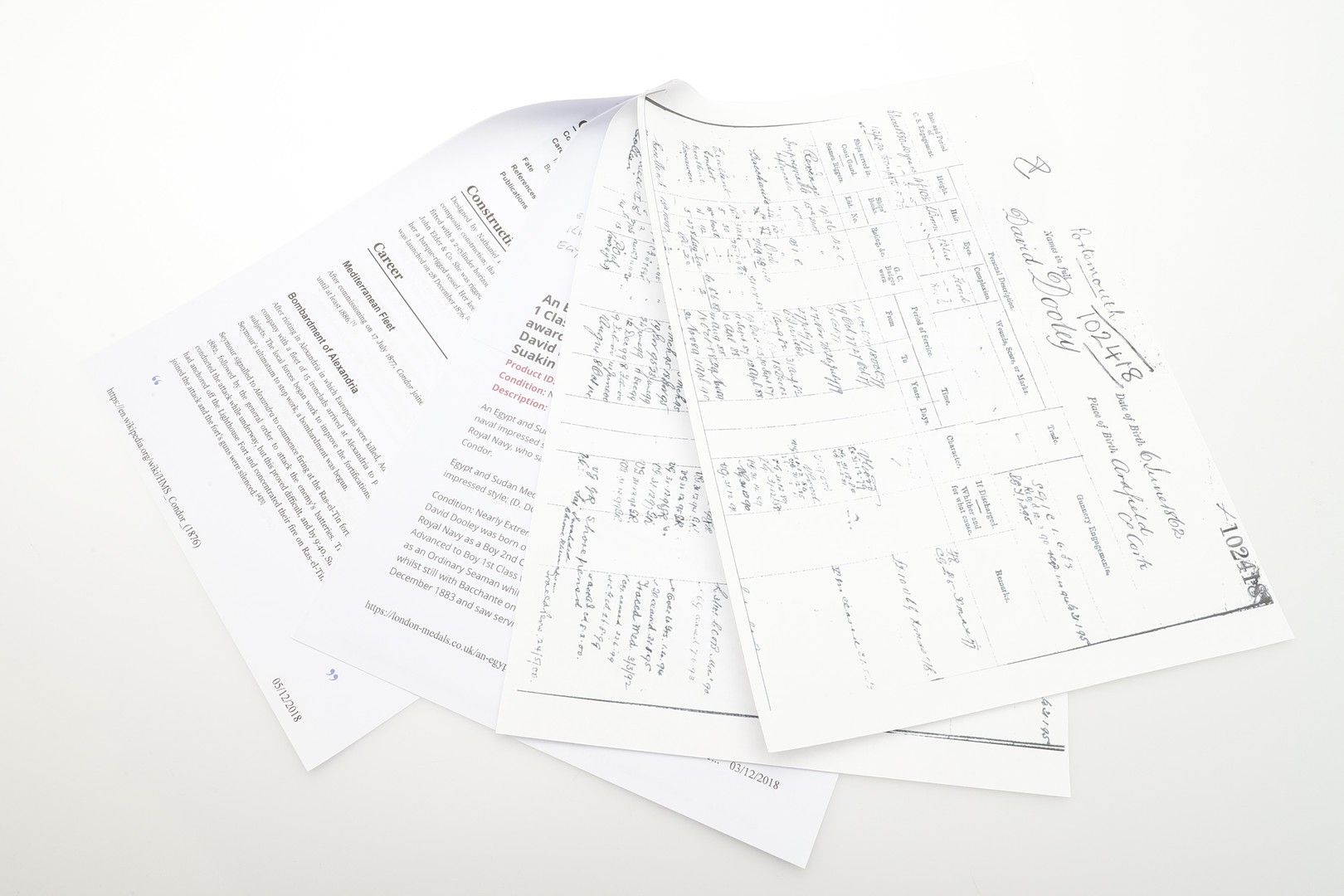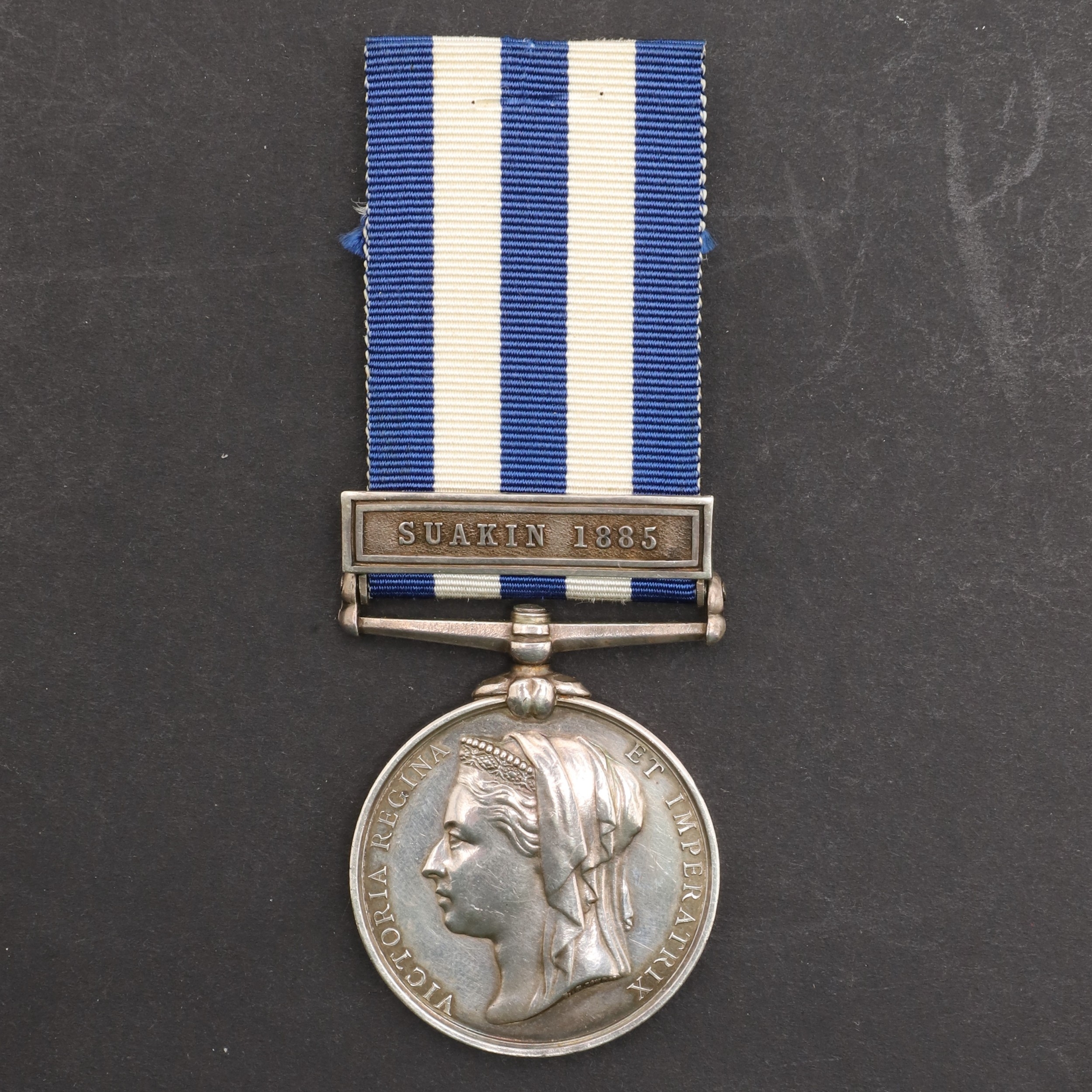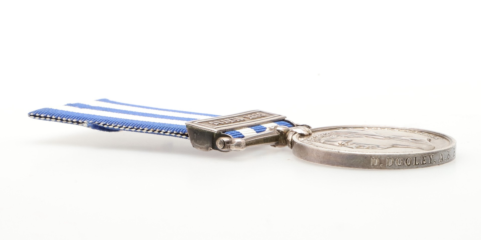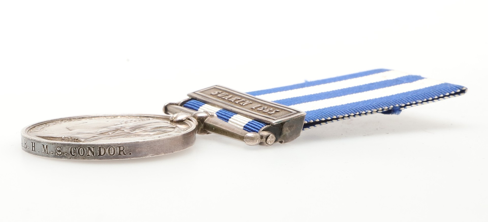 AN EGYPT MEDAL WITH SUAKIN 1885 CLASP TO H.M.S. CONDOR. An Egypt Medal 1882-89 medal, undated reverse, with Suakin 1885 clasp, named to D. Dooley A.B. H.M.S. Condor. David Dooley was born on the 6th June 1862 in Ardfield, County Cork. He joined up as a Boy 2nd Class at Portsmouth on the 11th October 1877, eventually rising to the rank of Petty Officer on the 18th October 1888. He was awarded the Long Service and Good Conduct Medal on the 3rd March 1892. Pensioned ashore in 1900 he was recalled for the First World War, but quickly discharged due to chronic rheumatism. One of 122 such clasps to the gunboat HMS Condor. With copied record of service.