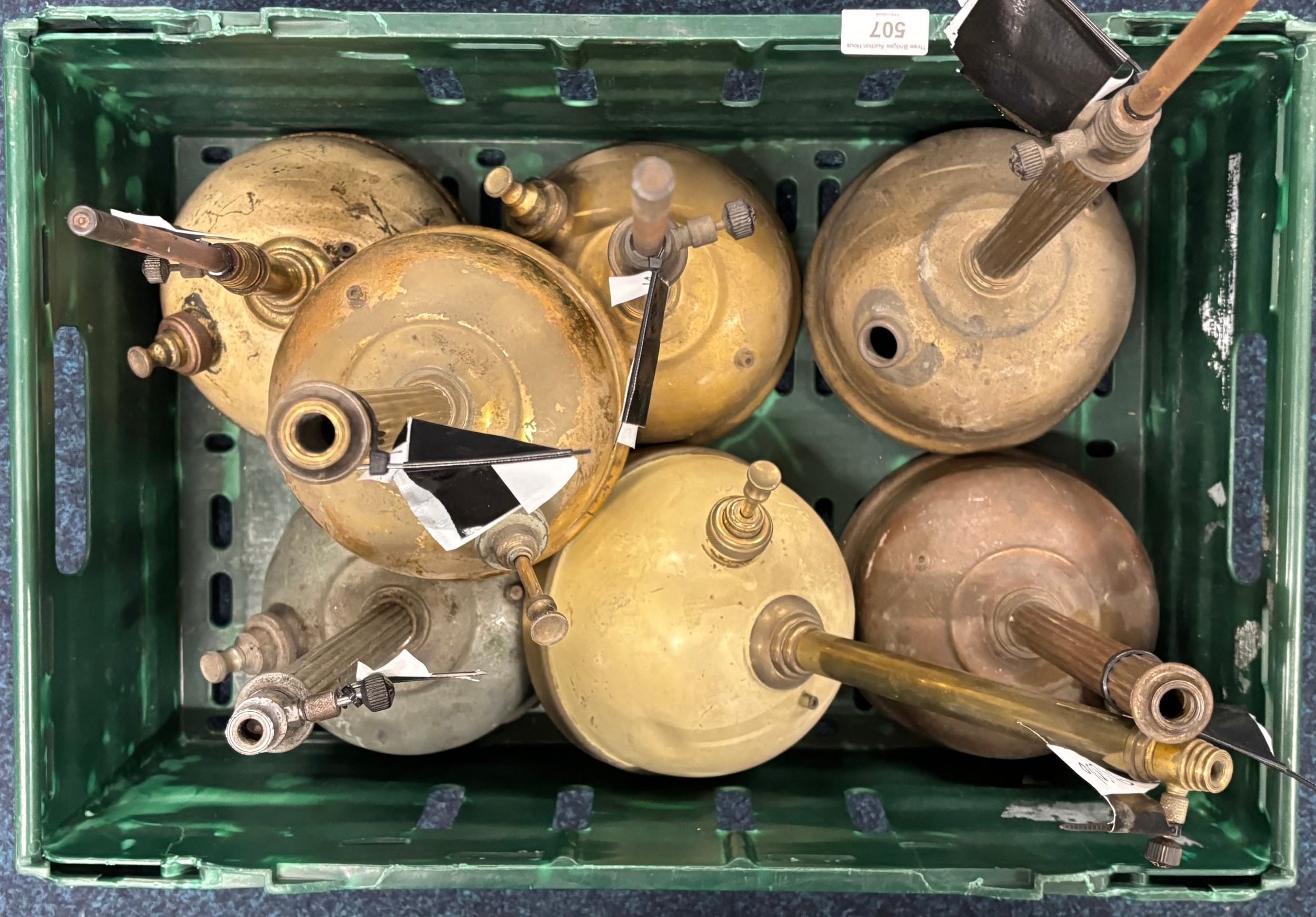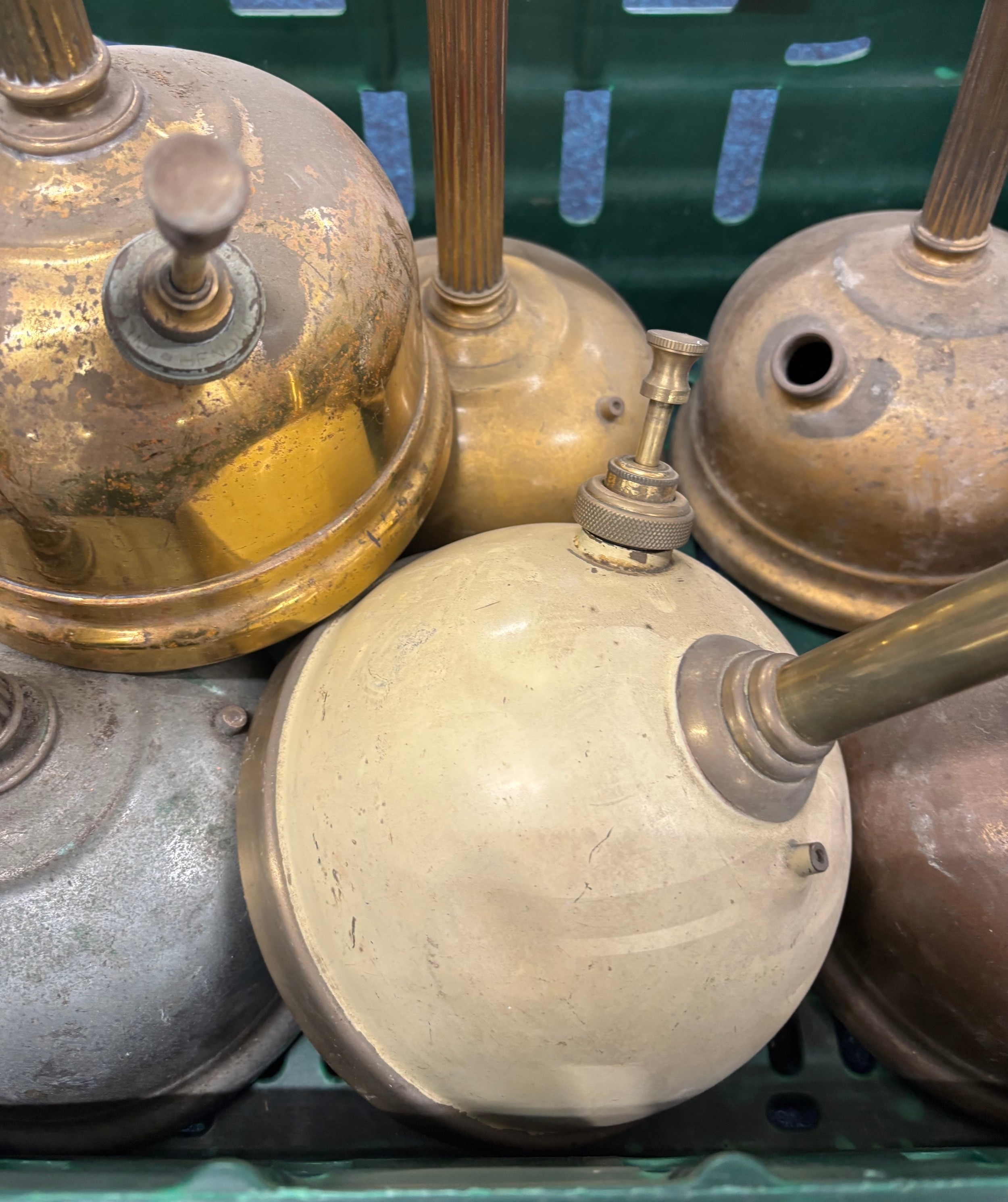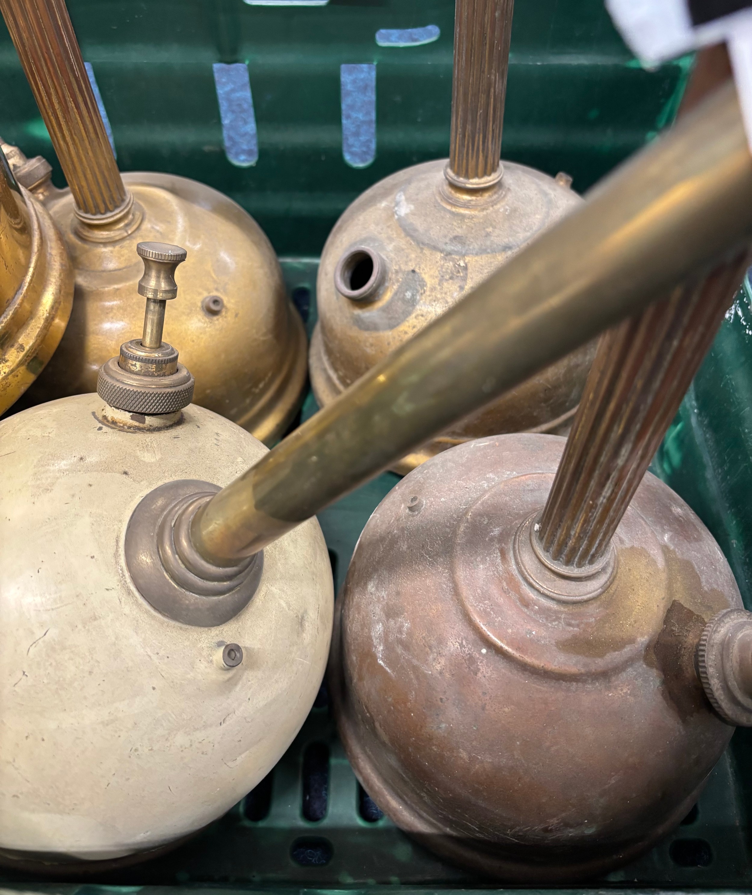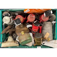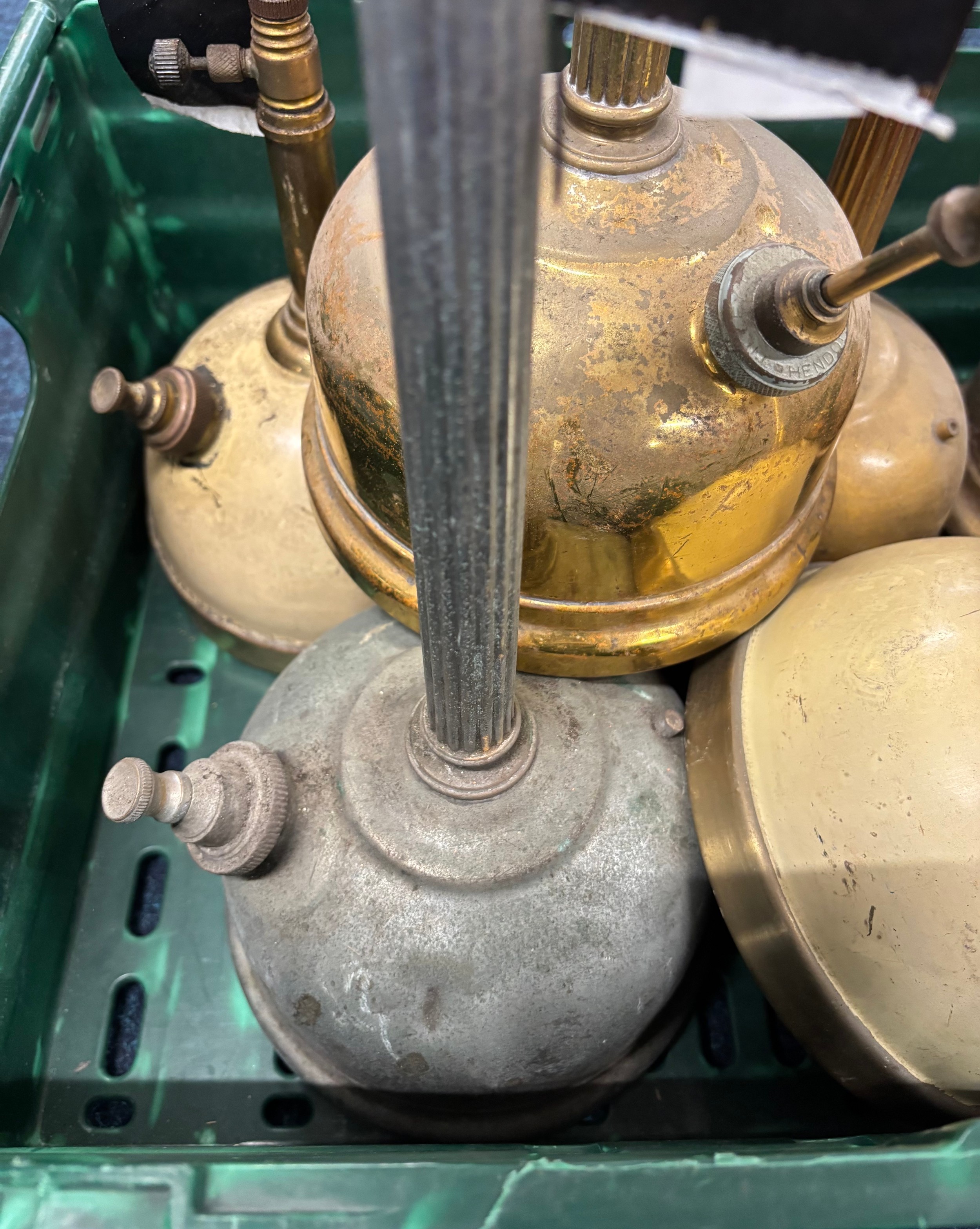 Crate of antique Tilley table lamps.