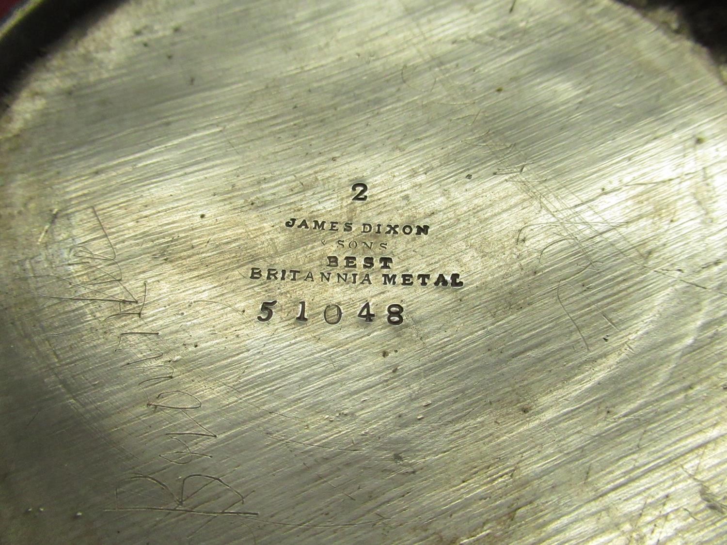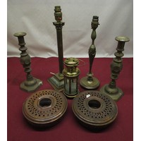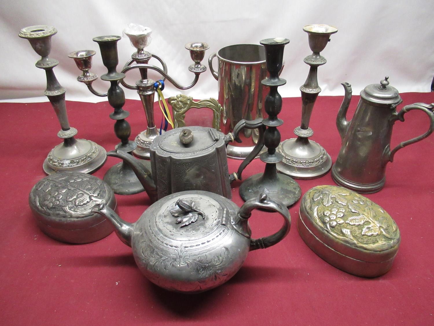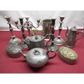 Victorian E.P.B.M. teapot of melon form with scroll handle and floral finial, pewter teapot, silver plated bottle coaster, pair of late C20th plated candlesticks and other decorative metalware