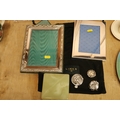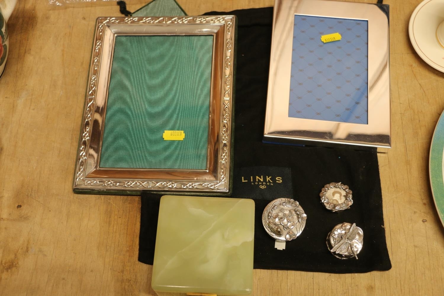 Modern hallmarked silver photograph frame with Celtic knotwork border, 22cm x 17.5cm, a Links of London photograph frame, small trinkets, etc.