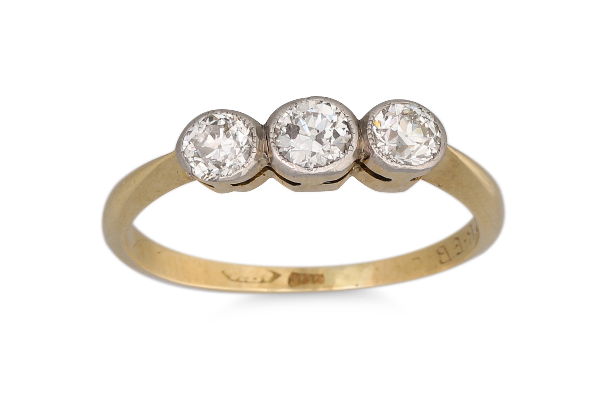 AN ANTIQUE THREE STONE DIAMOND RING, the oval cut diamonds collet set in 18ct yellow gold. Estimated: weight of diamonds: 0.50 ct, with antique box, size O-P