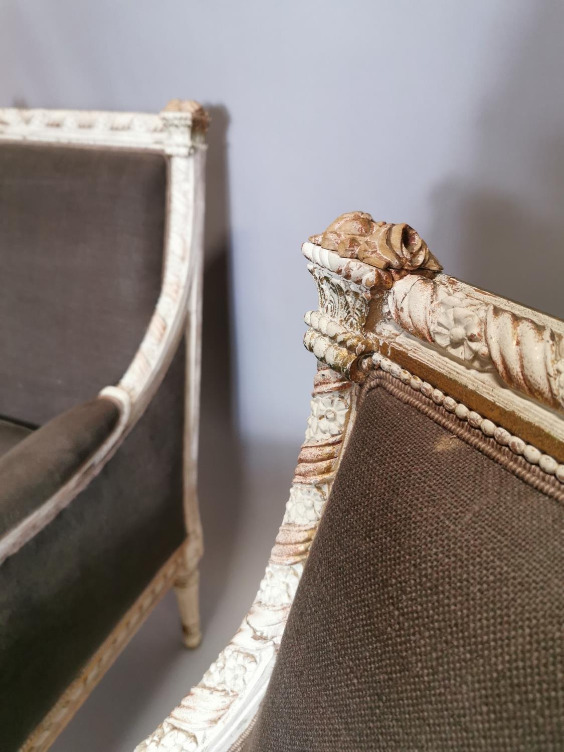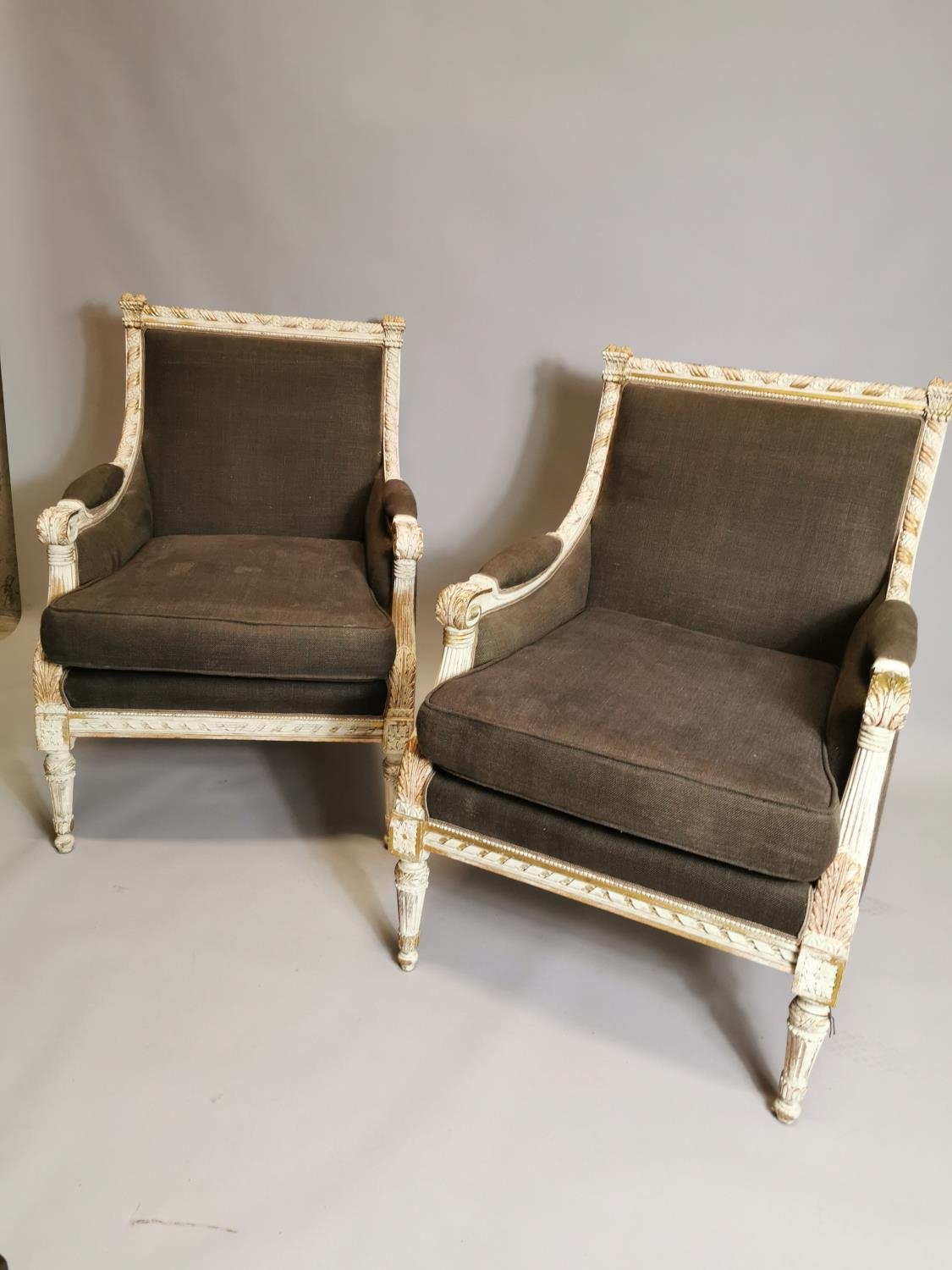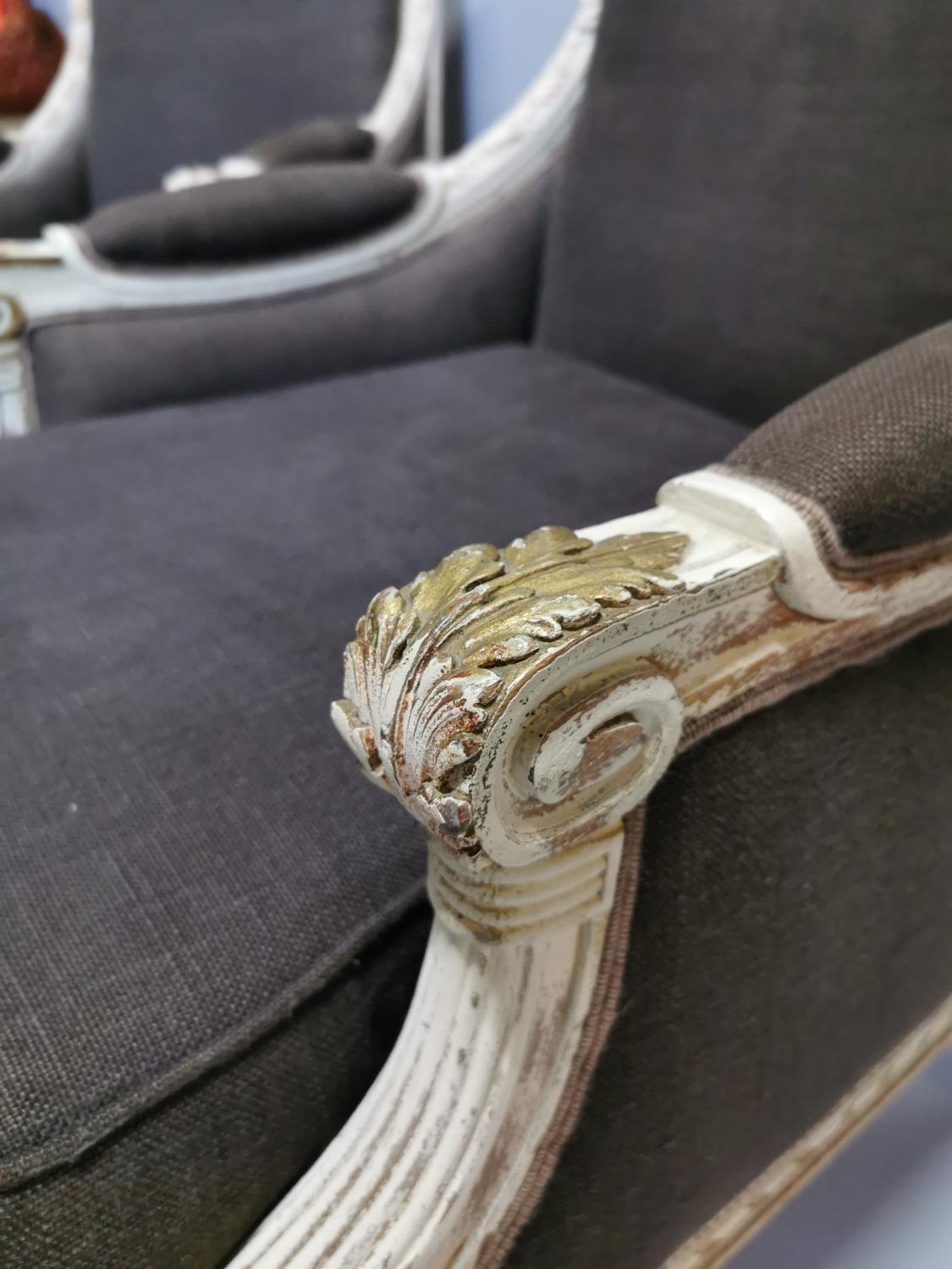 Pair of upholstered gilded and painted armchairs { Each 94c...