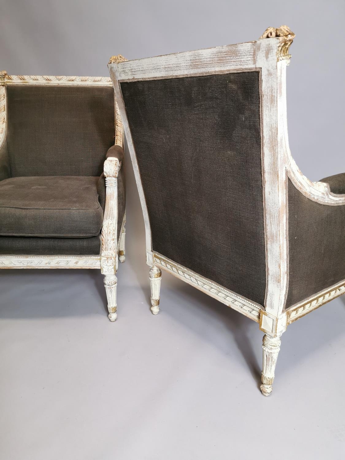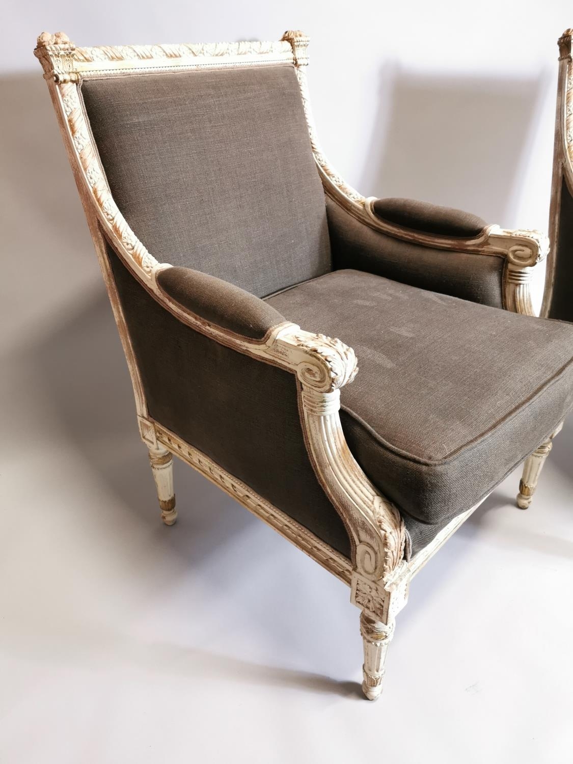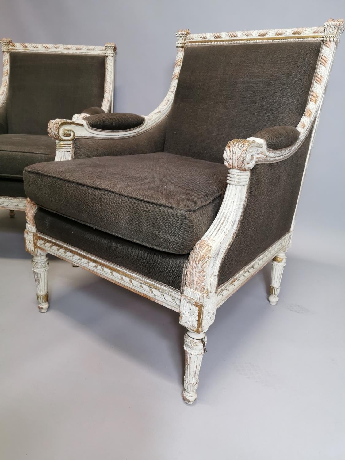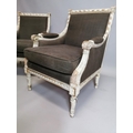 Pair of upholstered gilded and painted armchairs { Each 94c...
