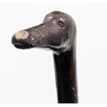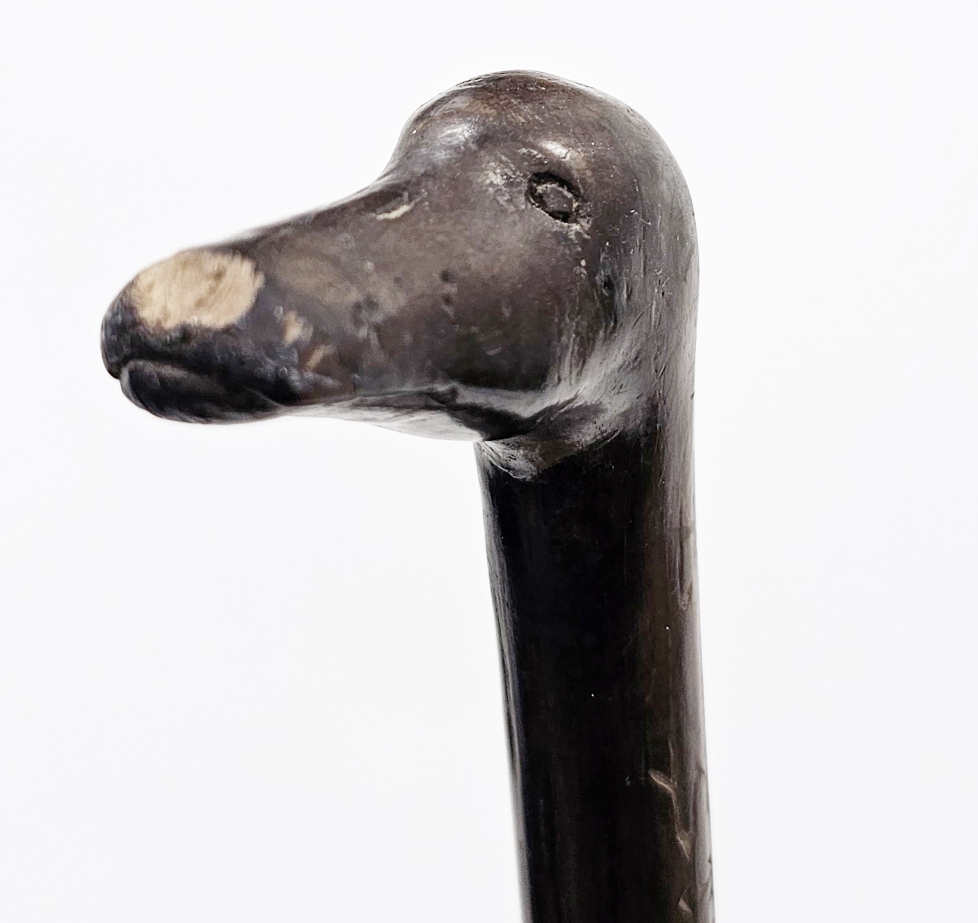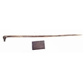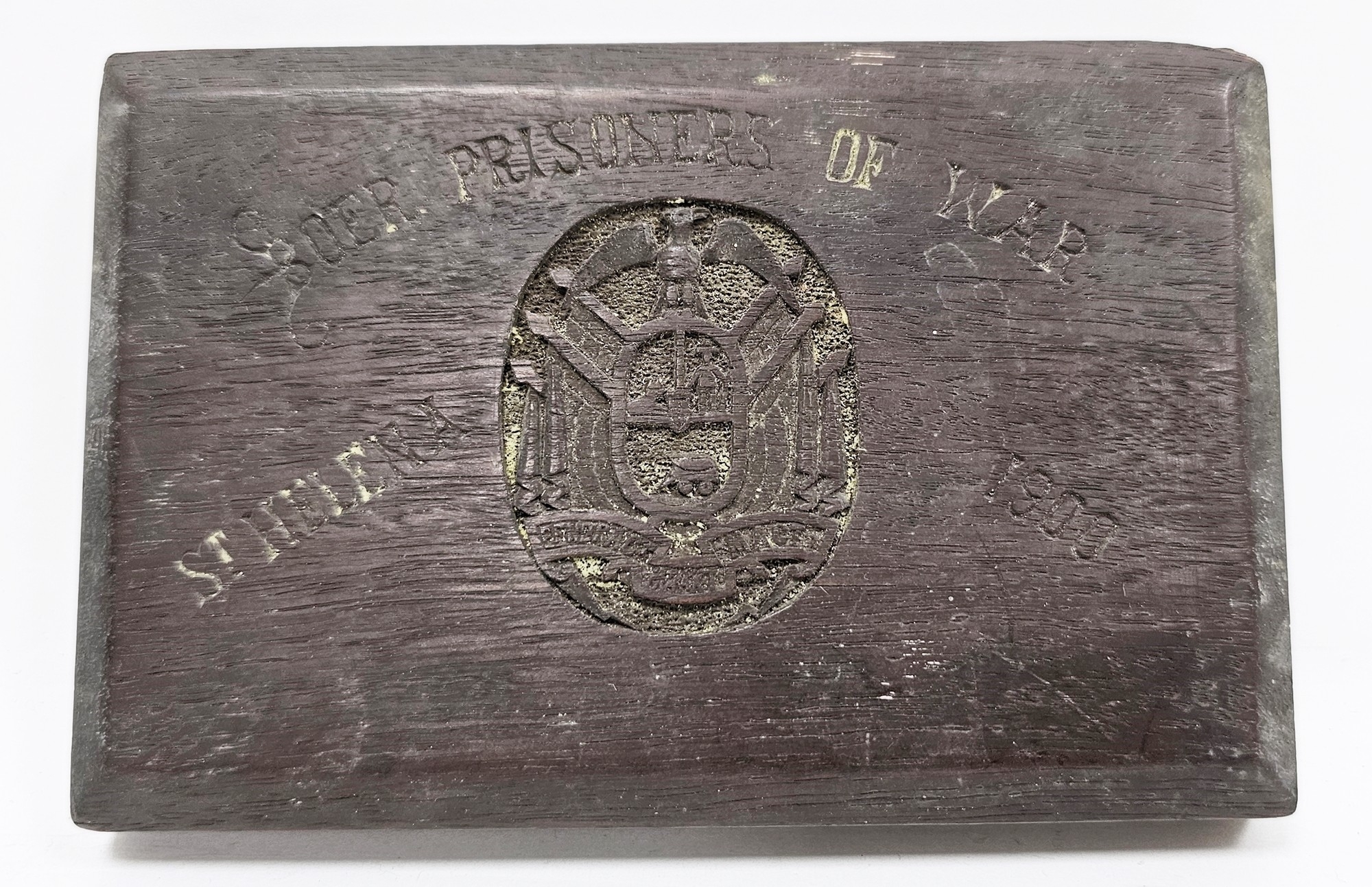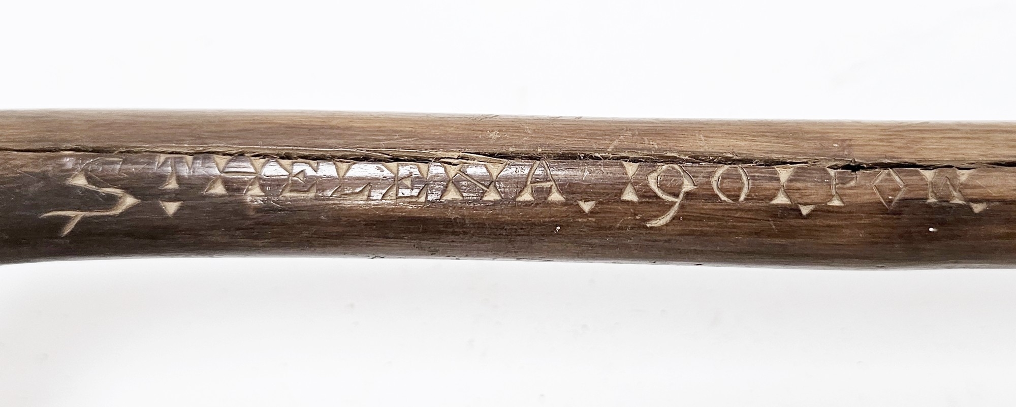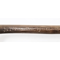 Boar War prisoner of war walking stick, the handle carved in the form of a seals head and etched to shaft 'St Helena 1901 POW', 90cm long with rectangular wooden plaque carved with crest and St Helena Prisoners of War 1900