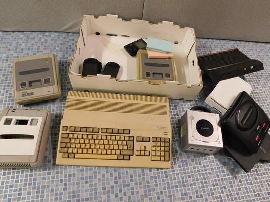 Box of vintage gaming equipment inc Super Nintendo, Amiga, Commodore