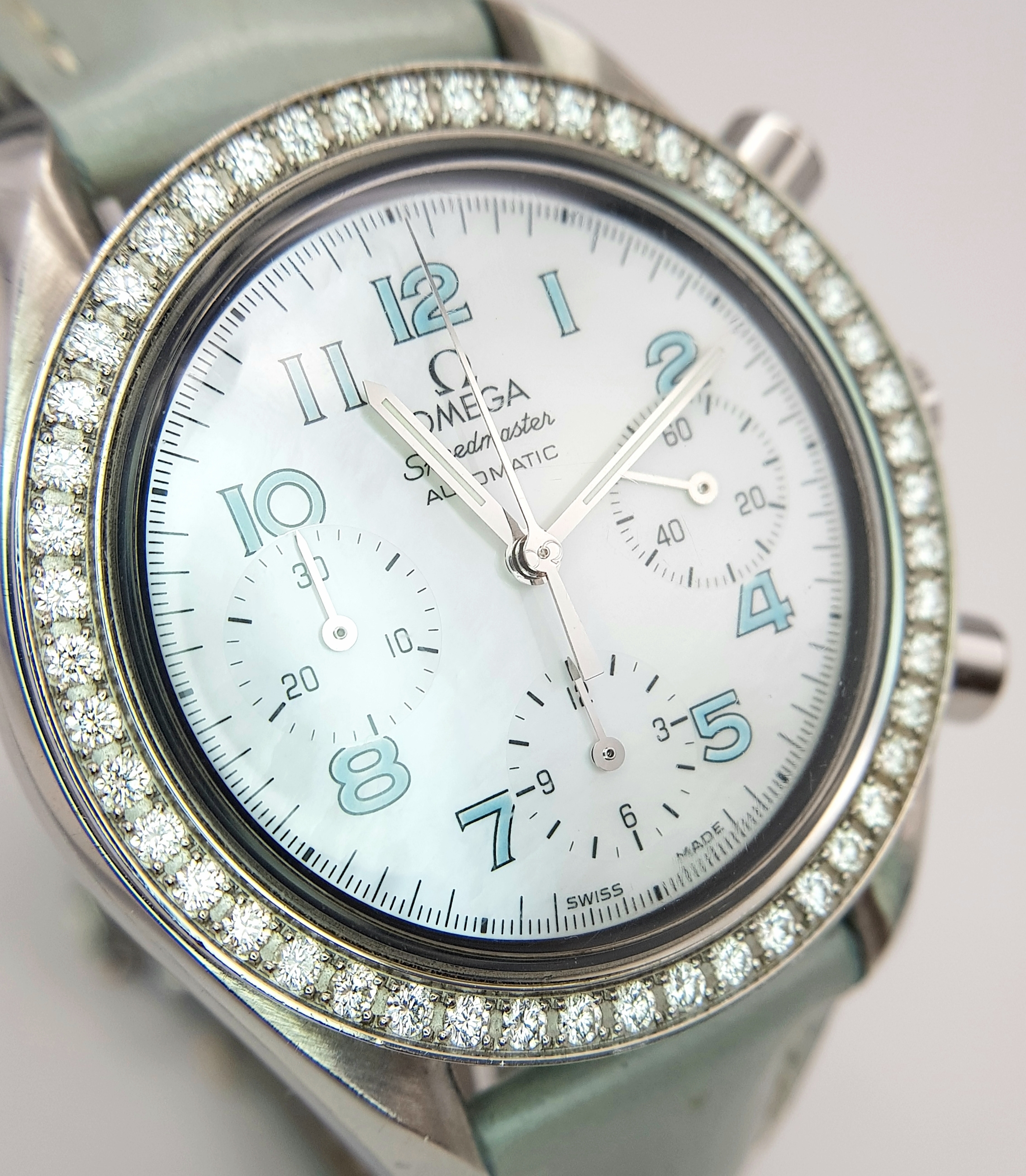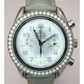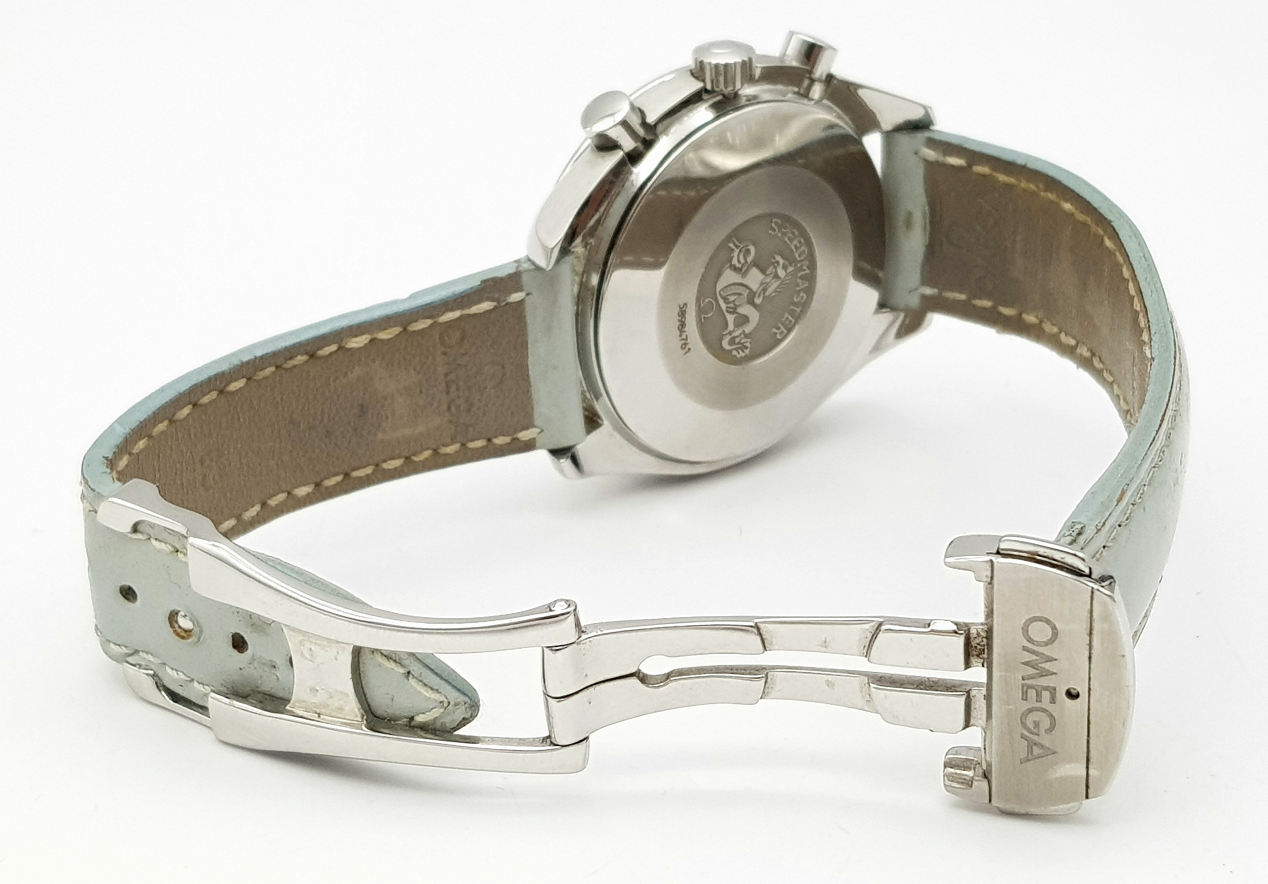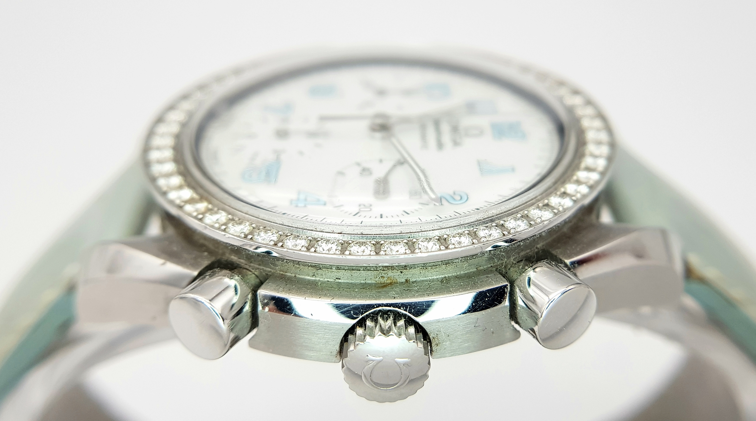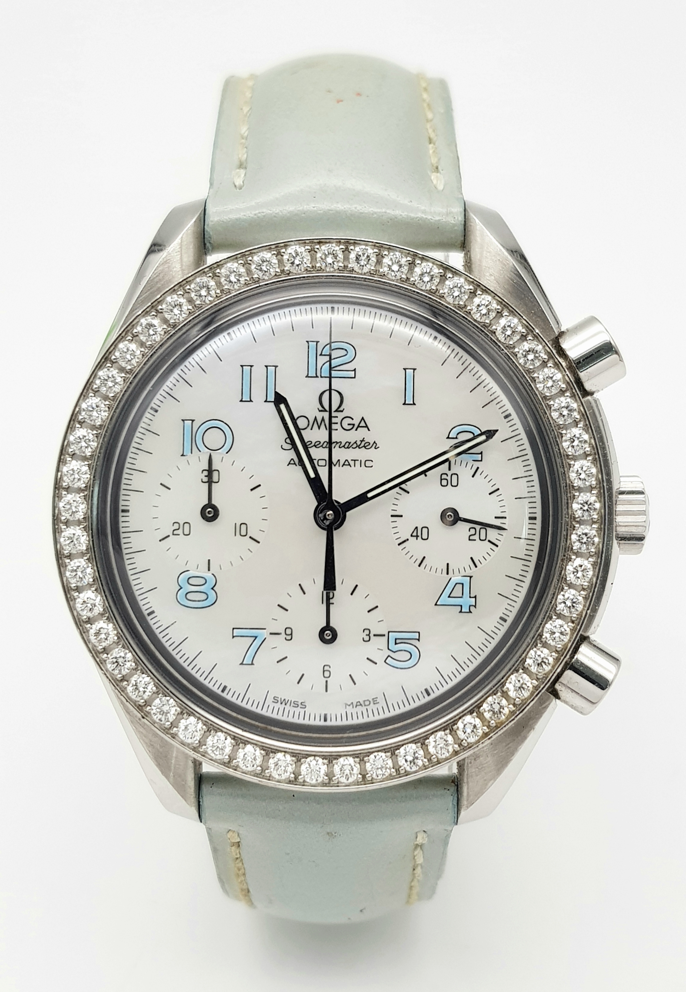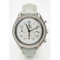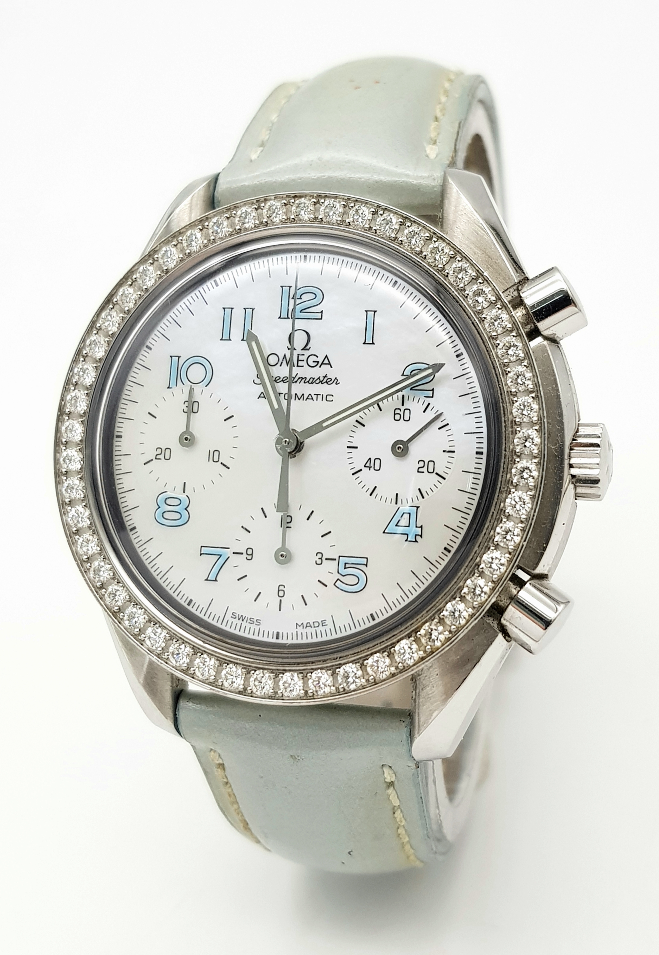 An Omega Speedmaster Automatic Diamond Chronograph Ladies Watch. Pale blue leather strap. Stainless steel case - 37mm. Diamond bezel. Mother of pearl dial with three sub dials. In working order.