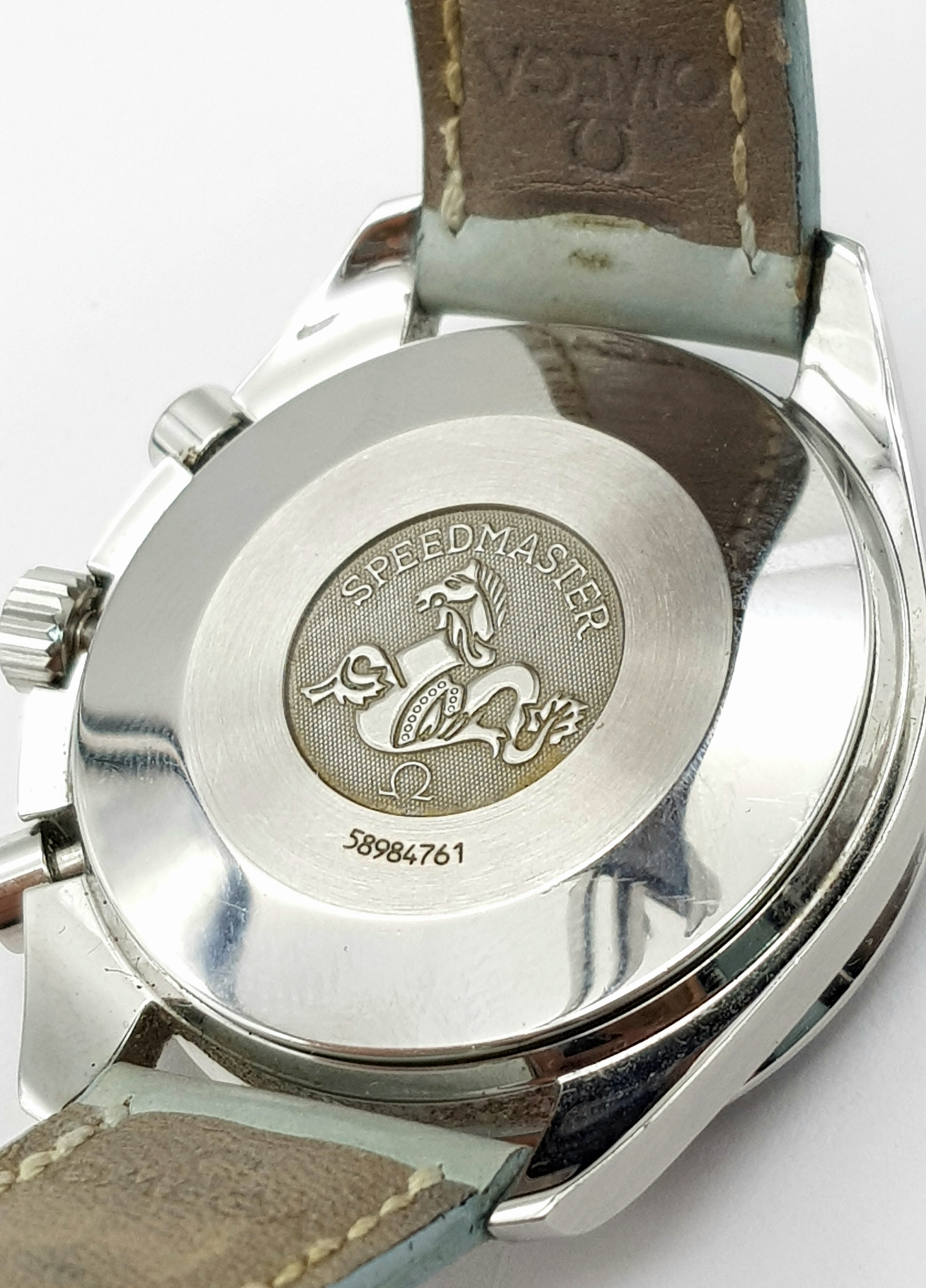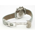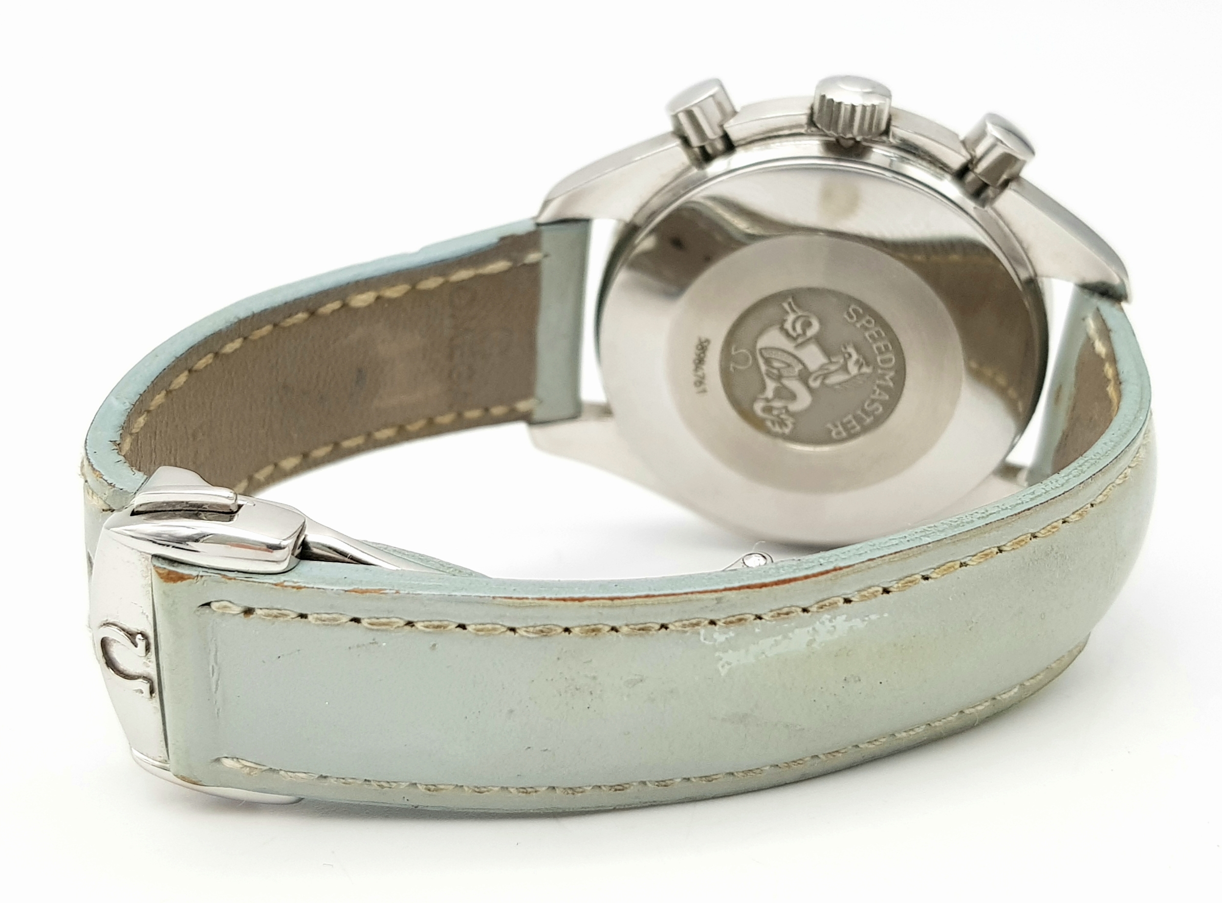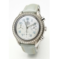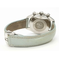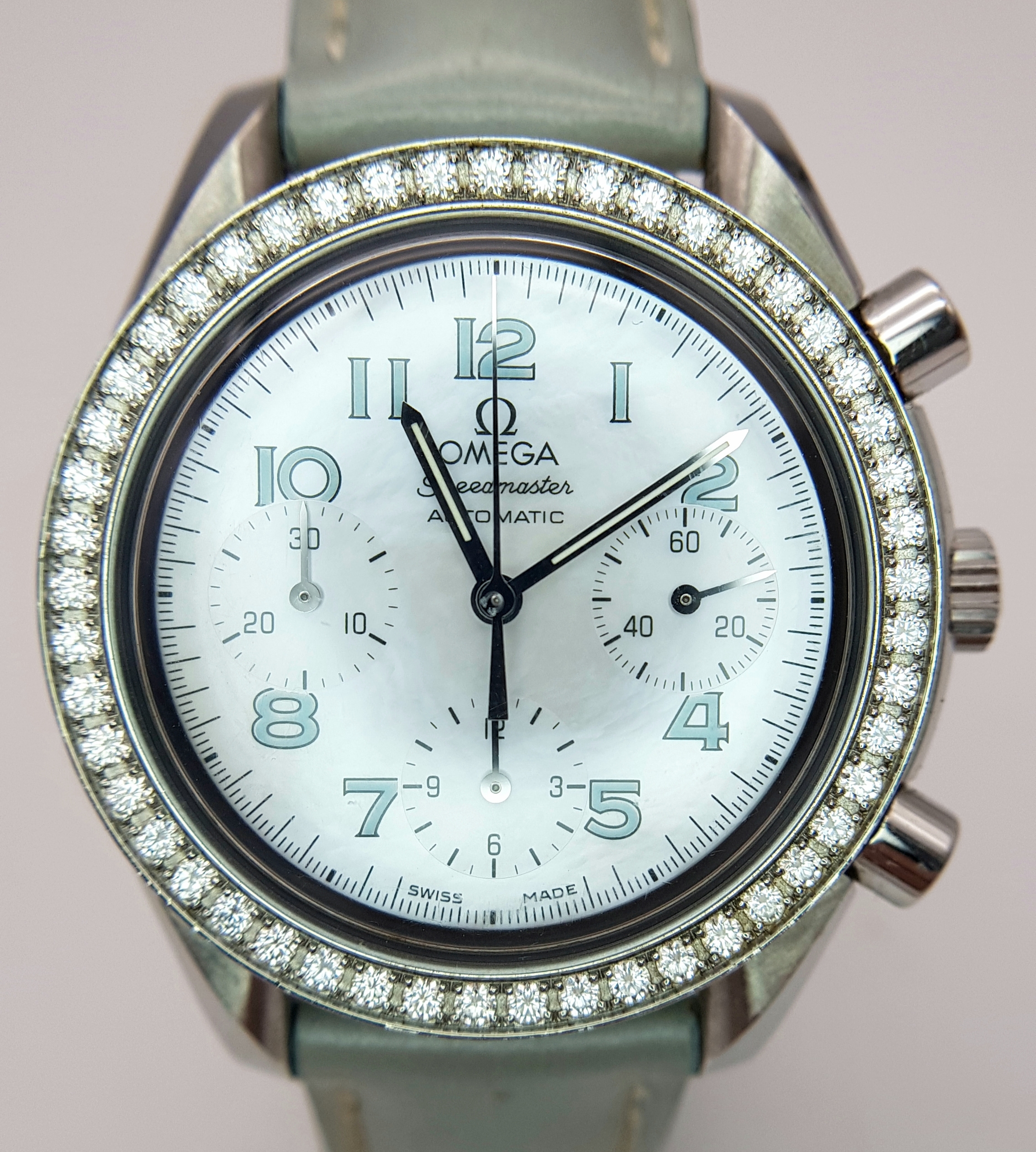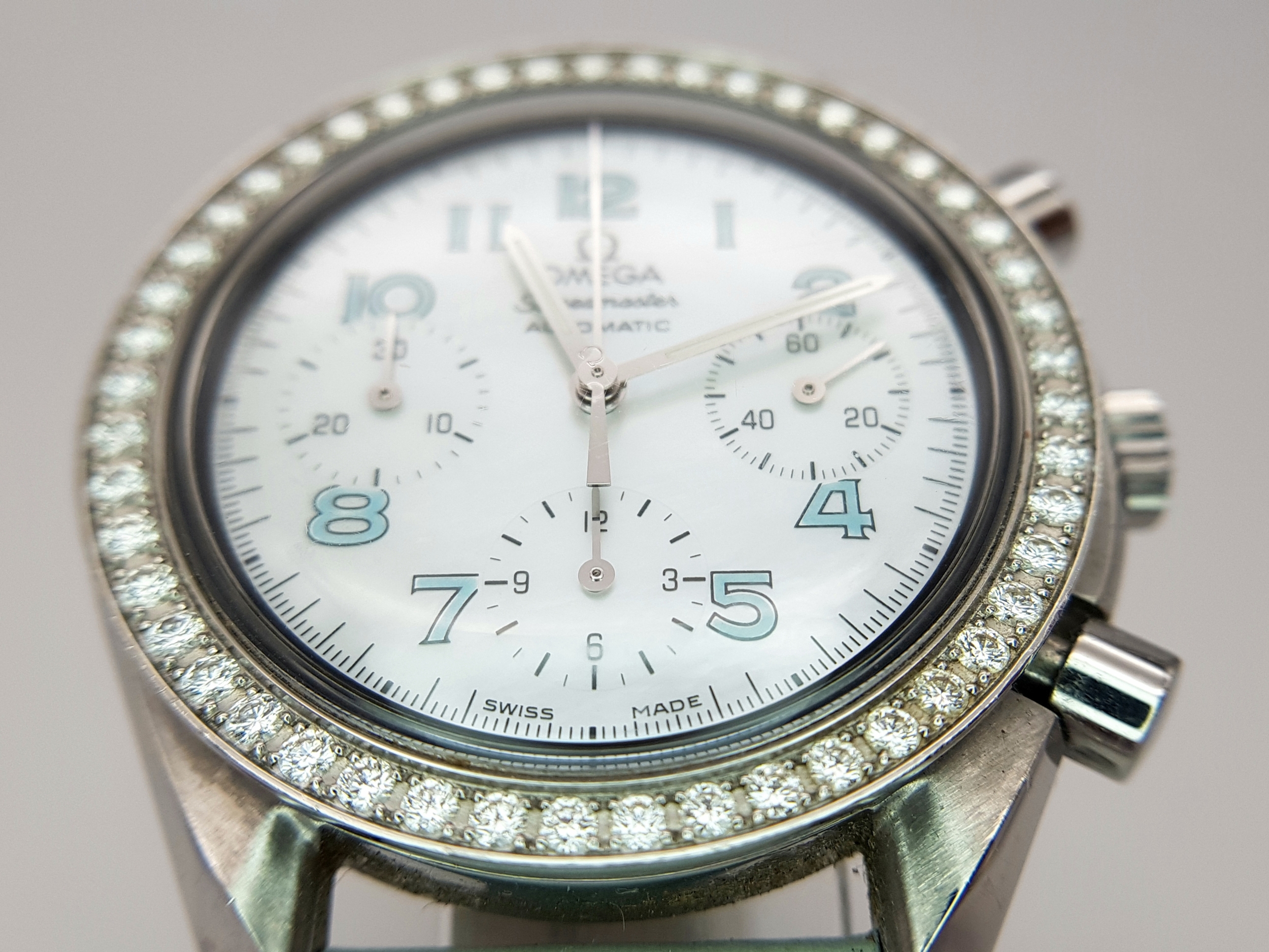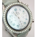 An Omega Speedmaster Automatic Diamond Chronograph Ladies Watch. Pale blue leather strap. Stainless steel case - 37mm. Diamond bezel. Mother of pearl dial with three sub dials. In working order.