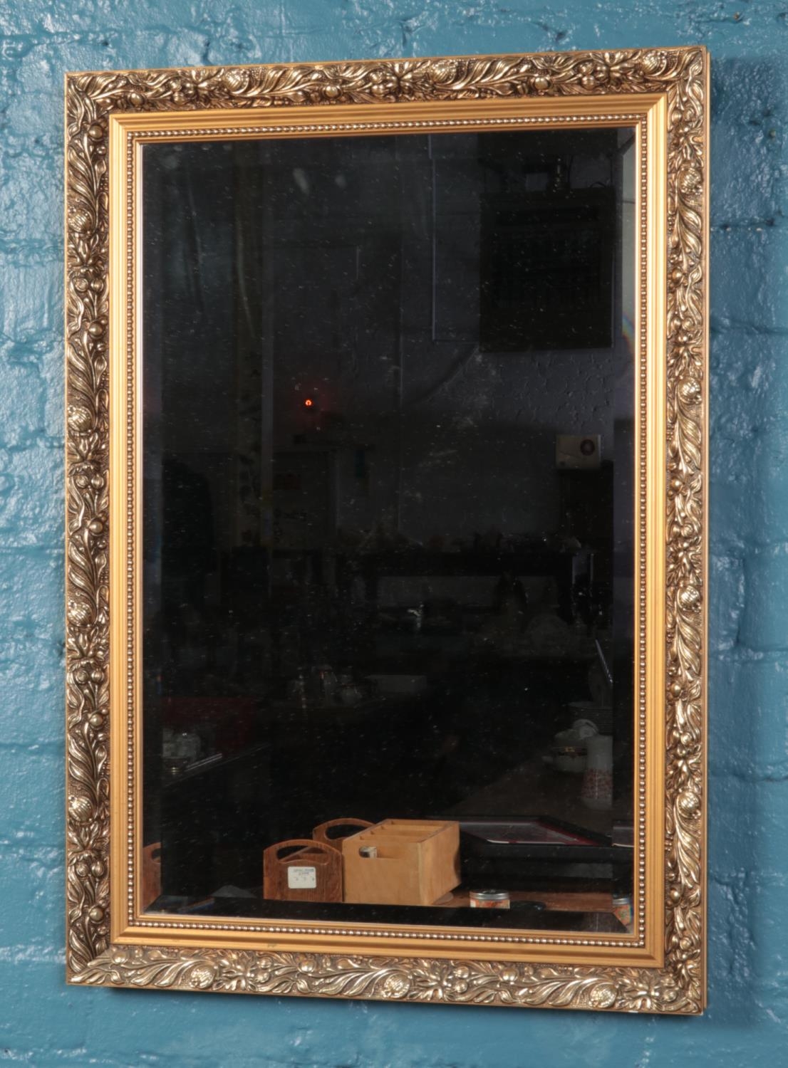 A gilt framed bevel edge mirror with floral and beaded decoration. Size of mirror including frame: Height: 76cm, Width: 54cm