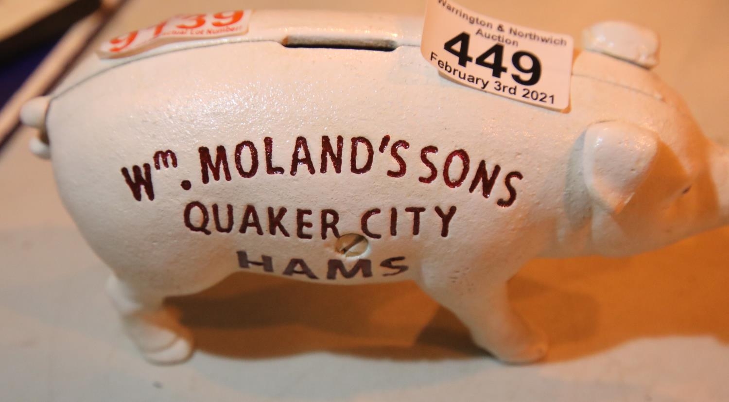 Cast iron W Moland & Son pig moneybox. P&P Group 1 (£14+VAT for the first lot and £1+VAT for subsequent lots)
